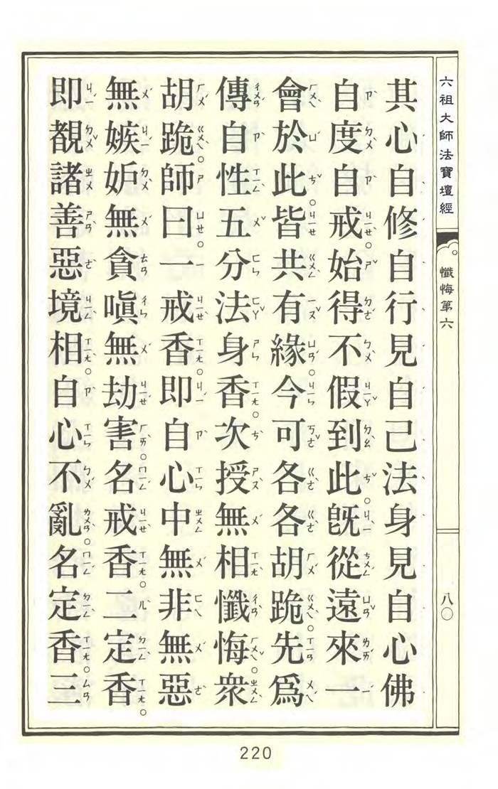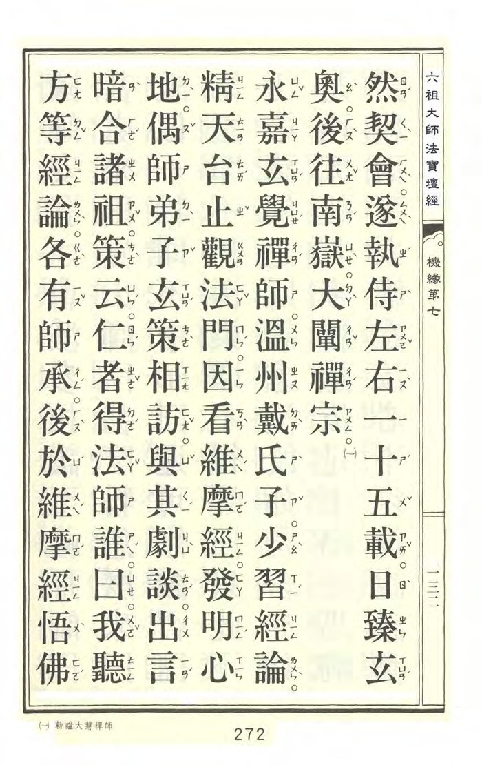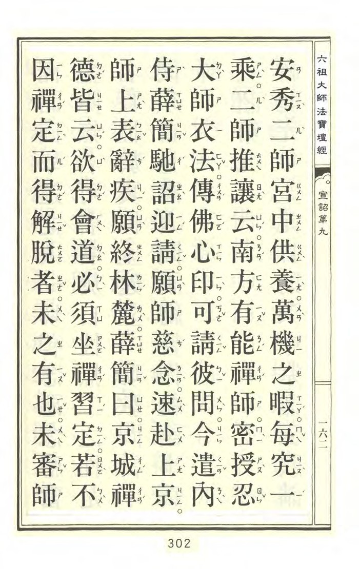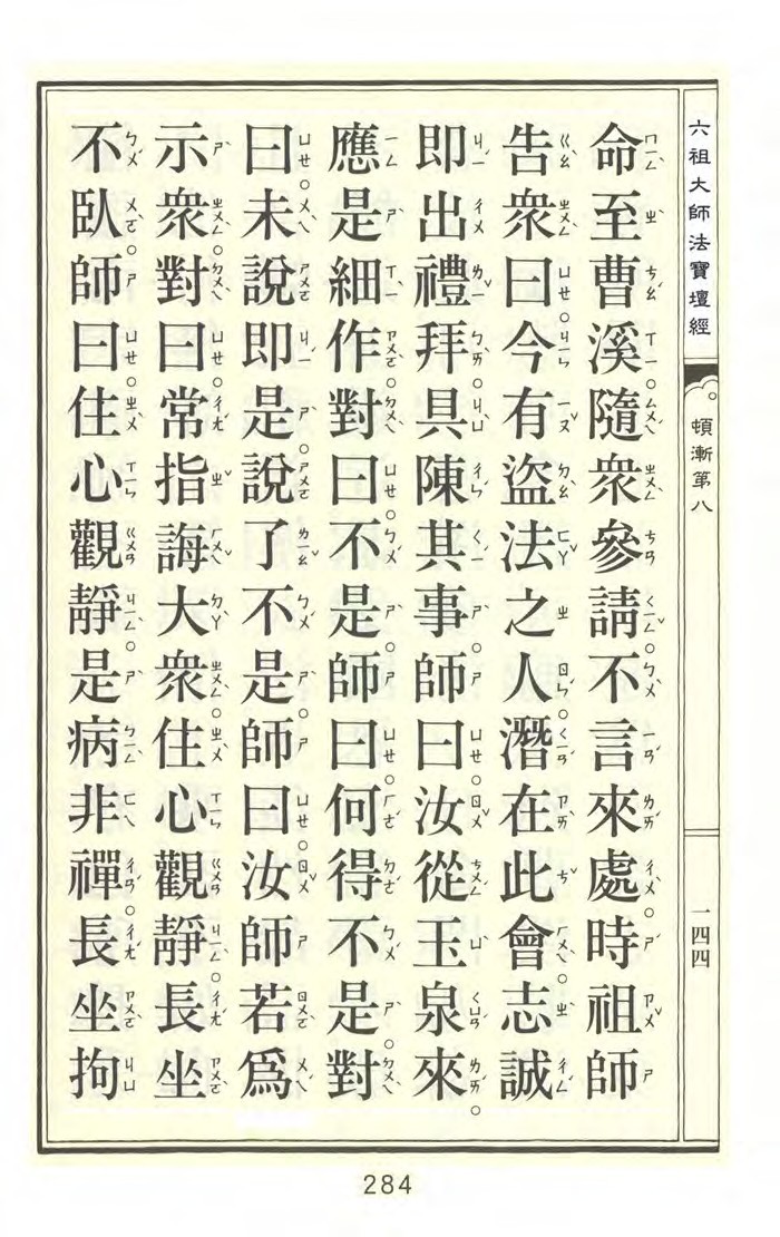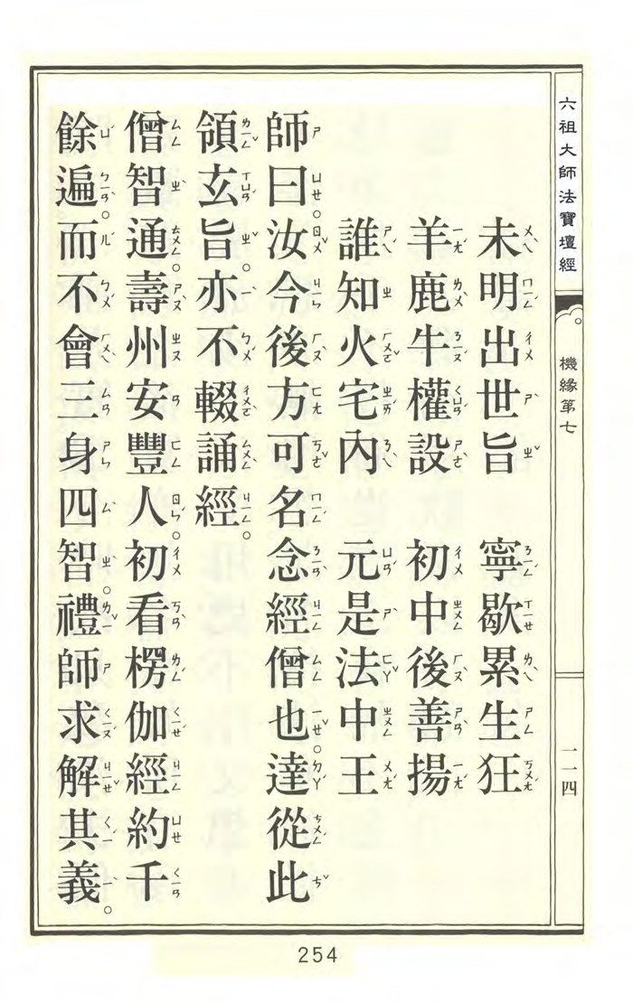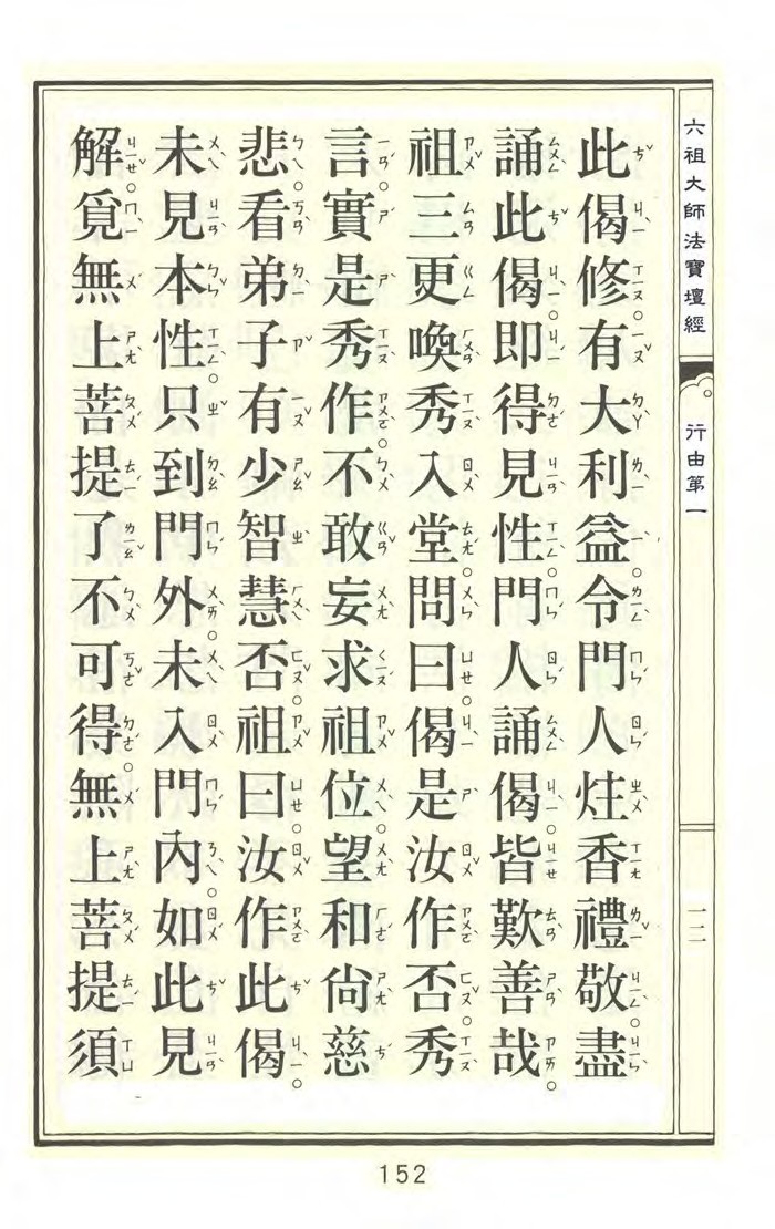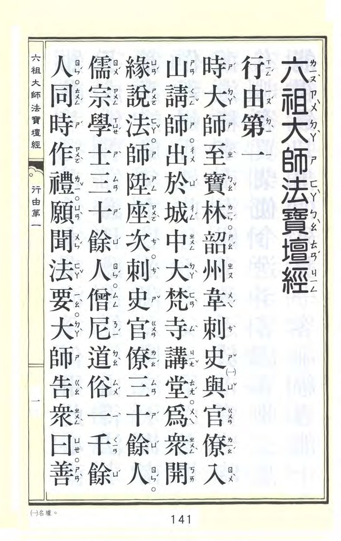 時,大師至寶林,韶州韋刺史與官僚,入山請師;出於城中大梵寺講堂,為眾開緣說法。師升座次,刺史官僚三十餘人、儒宗學士二十餘人、僧尼道俗一千餘人,同時作禮,願聞法要。大師告眾曰:「善知識!菩提自性,本來清淨,但用此心,直了成佛。善知識!且聽惠能行由得法事意。」