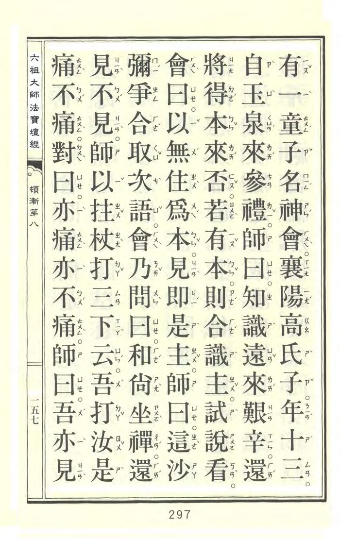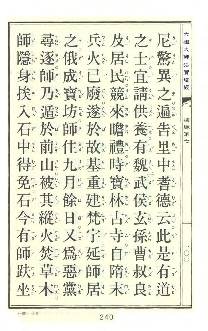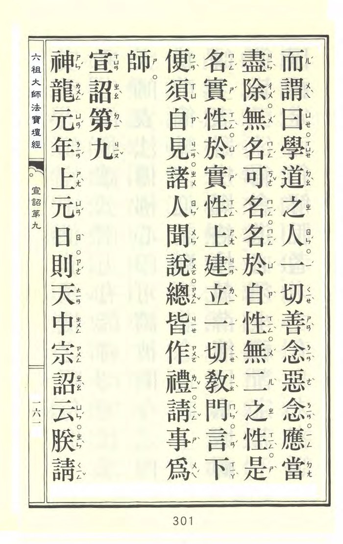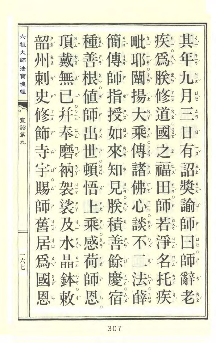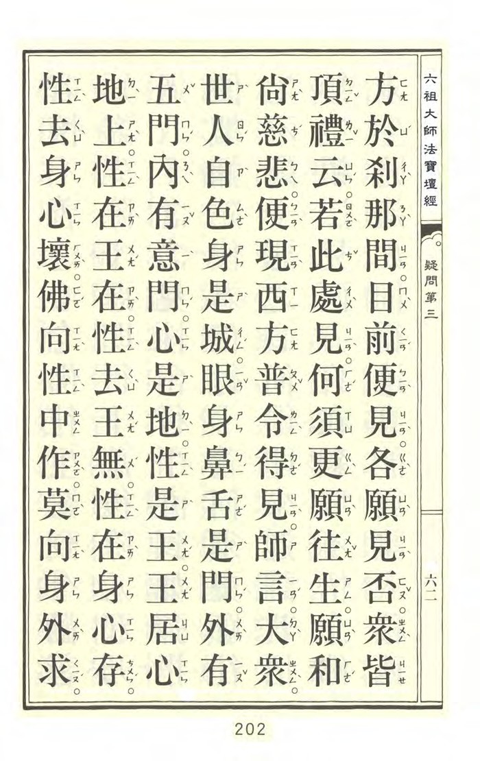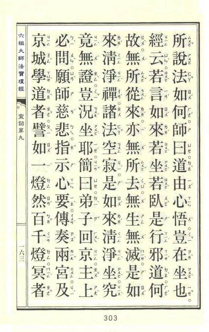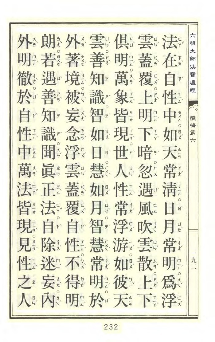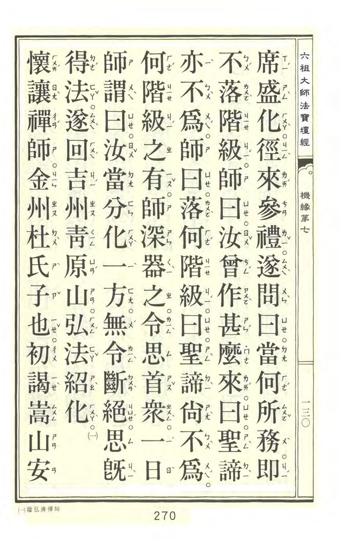 時,大師至寶林,韶州韋刺史與官僚,入山請師;出於城中大梵寺講堂,為眾開緣說法。師升座次,刺史官僚三十餘人、儒宗學士二十餘人、僧尼道俗一千餘人,同時作禮,願聞法要。大師告眾曰:「善知識!菩提自性,本來清淨,但用此心,直了成佛。善知識!且聽惠能行由得法事意。」