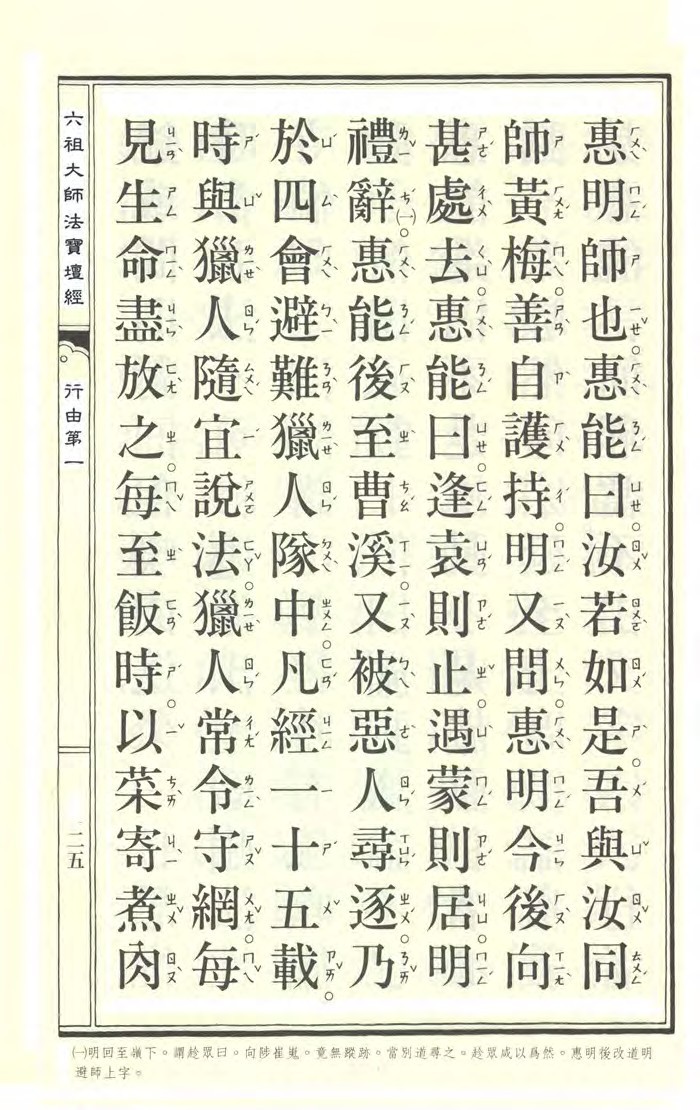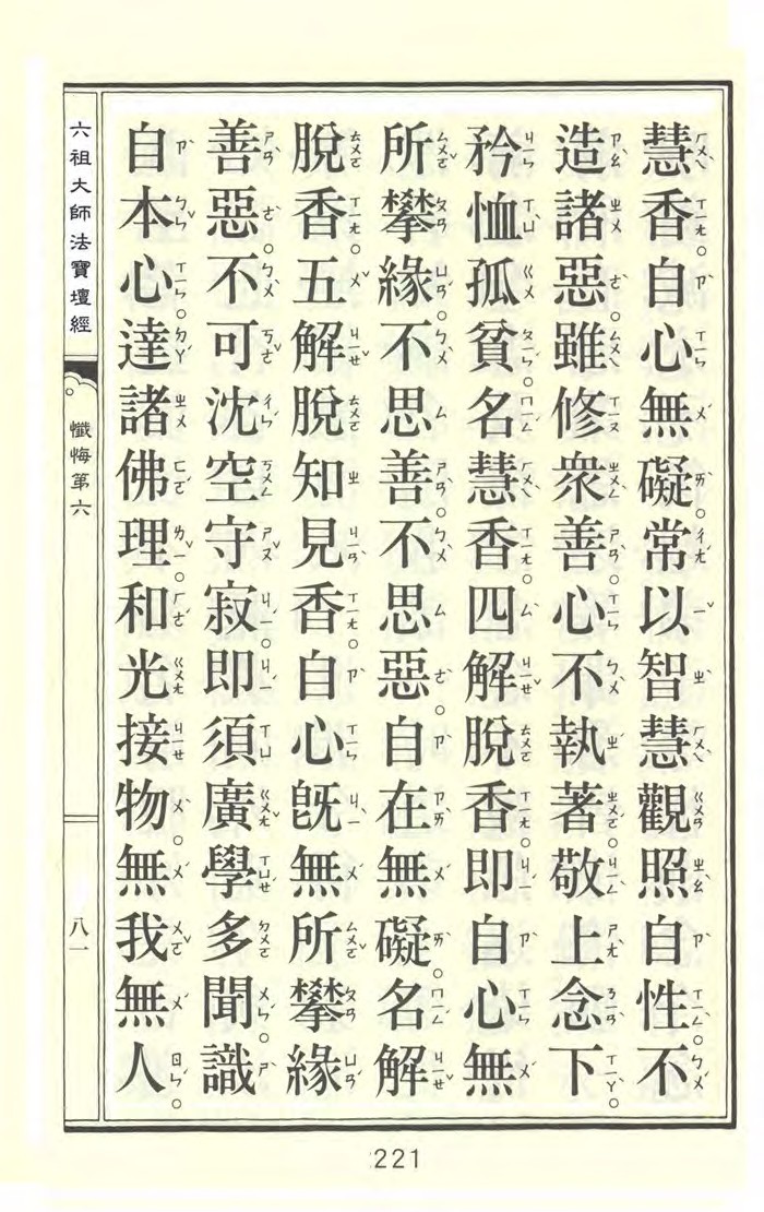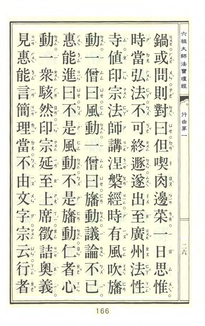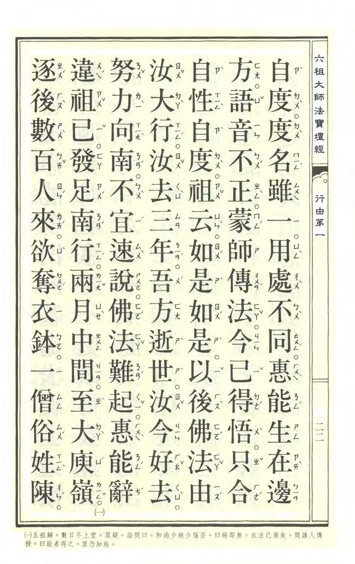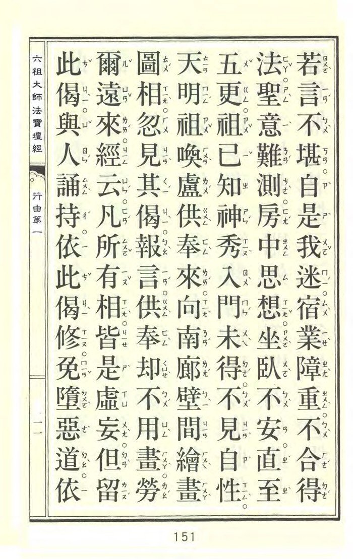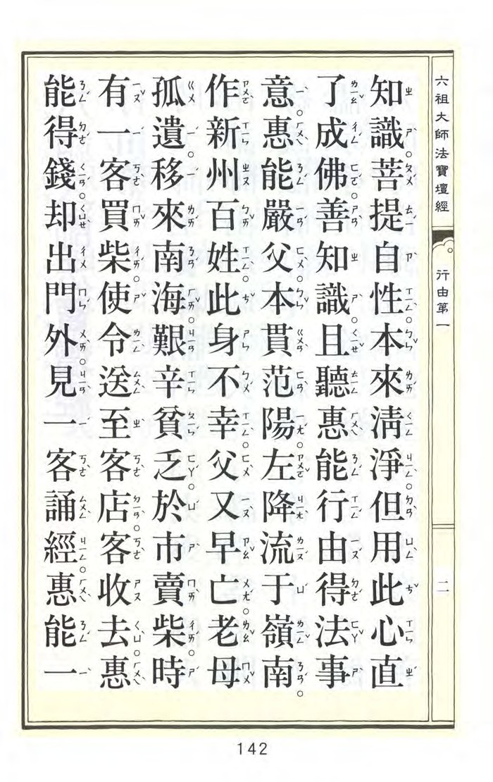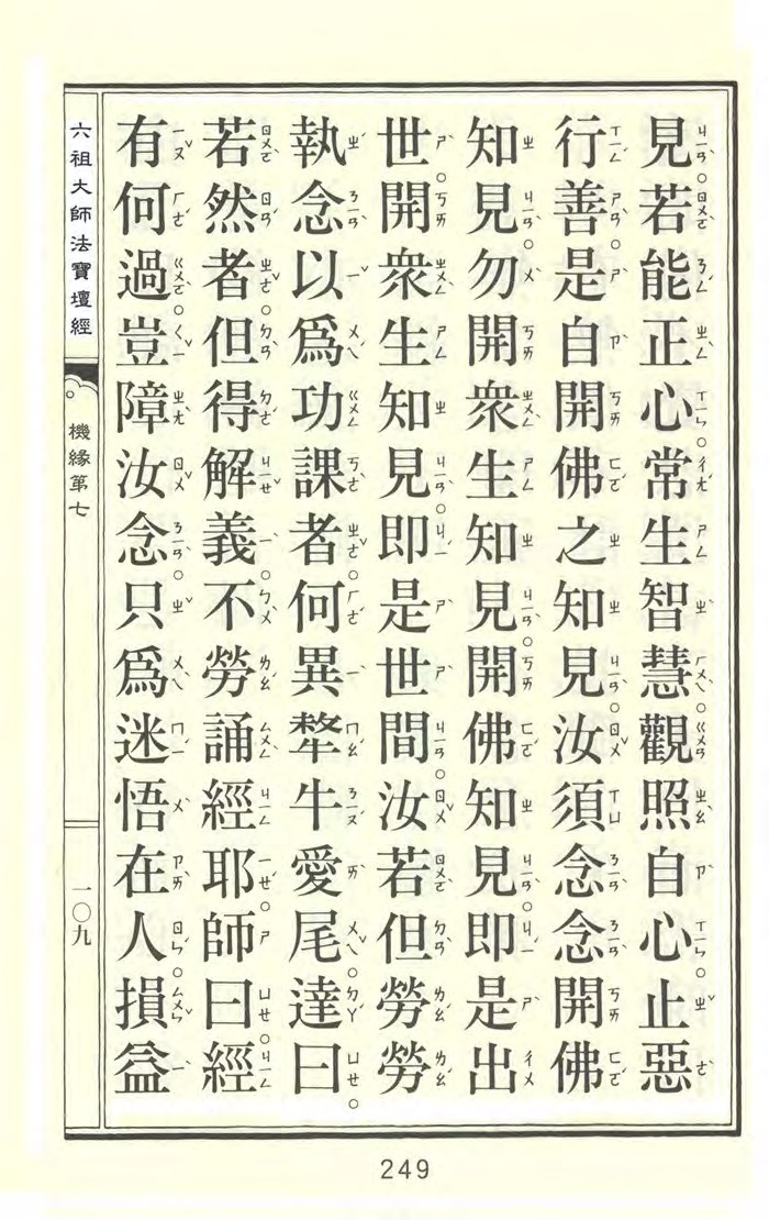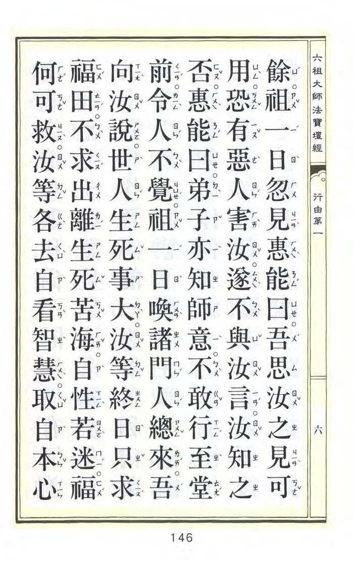 『惠能遂於菩提樹下,開東山法門。惠能於東山得法,辛苦受盡,命似懸絲,今日得與史君官僚僧尼道俗同此一會,莫非累劫之緣?亦是過去生中,供養諸佛,同種善根,方始得聞如上頓教得法之因。教是先聖所傳,不是惠能自智。願聞先聖教者,各令淨心。聞了,各自除疑,如先代聖人無別。