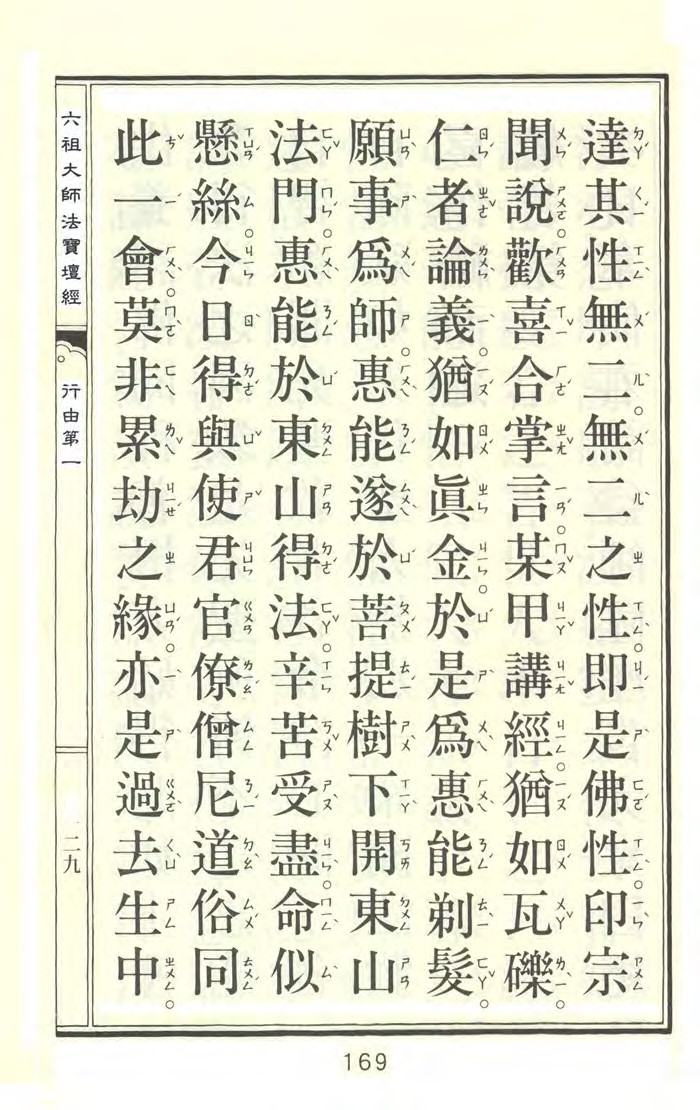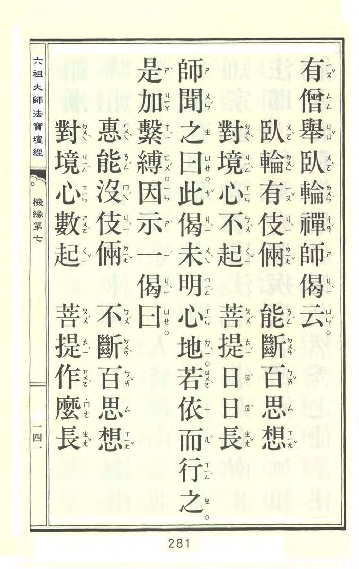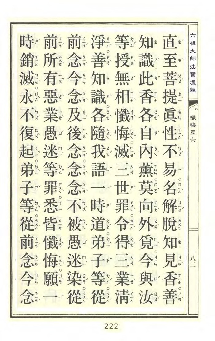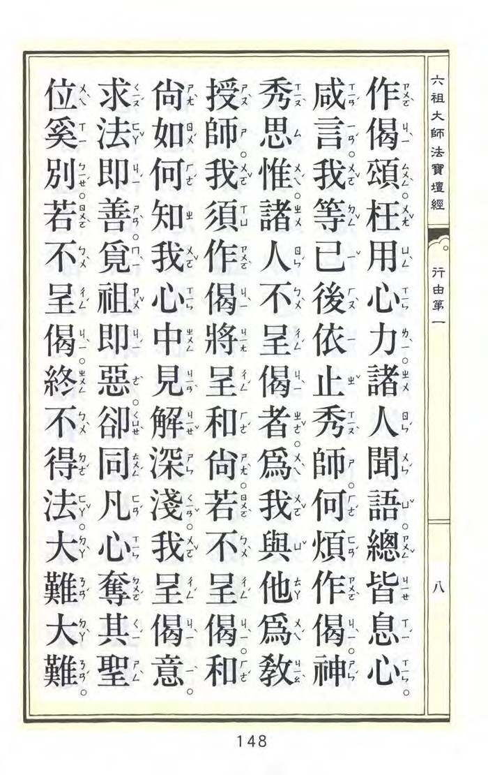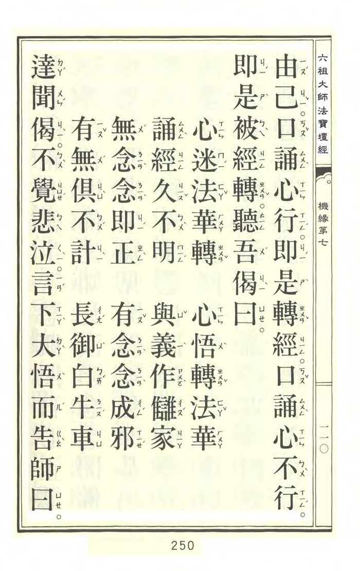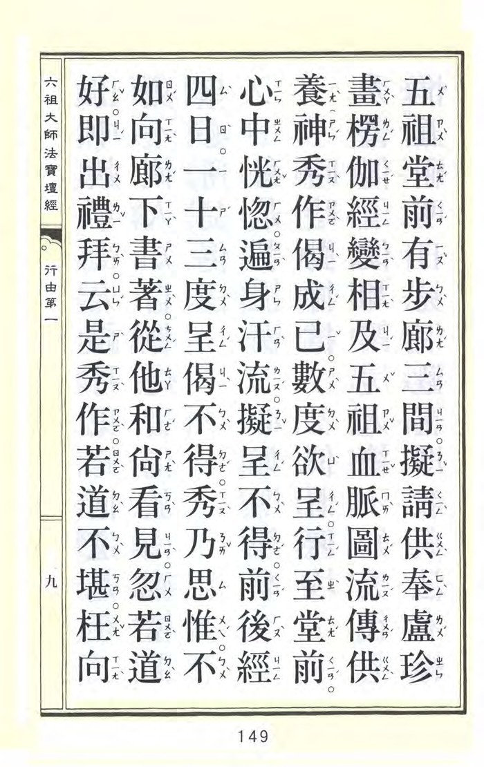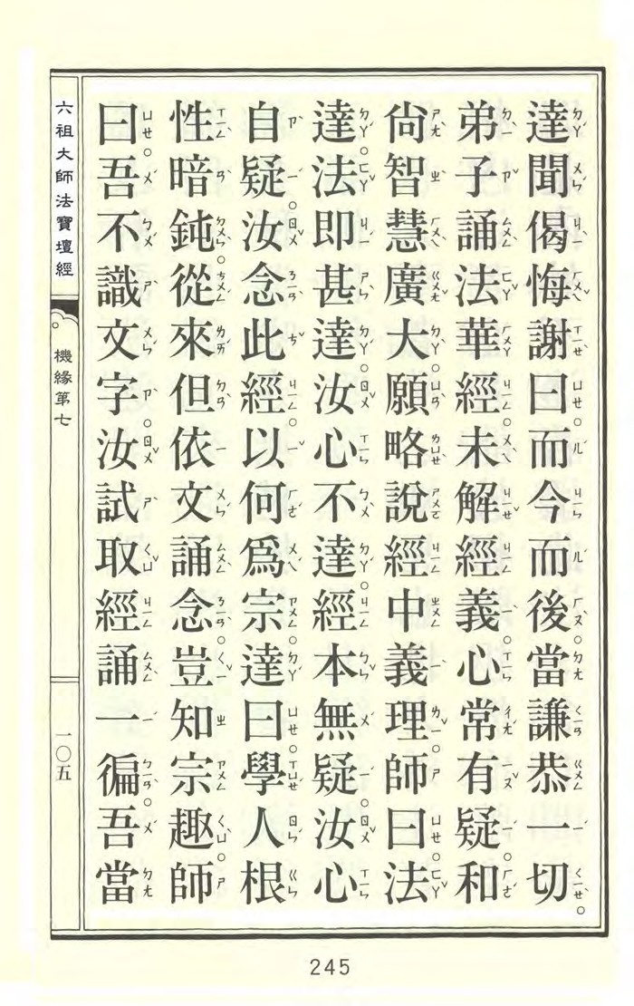 『惠能遂於菩提樹下,開東山法門。惠能於東山得法,辛苦受盡,命似懸絲,今日得與史君官僚僧尼道俗同此一會,莫非累劫之緣?亦是過去生中,供養諸佛,同種善根,方始得聞如上頓教得法之因。教是先聖所傳,不是惠能自智。願聞先聖教者,各令淨心。聞了,各自除疑,如先代聖人無別。