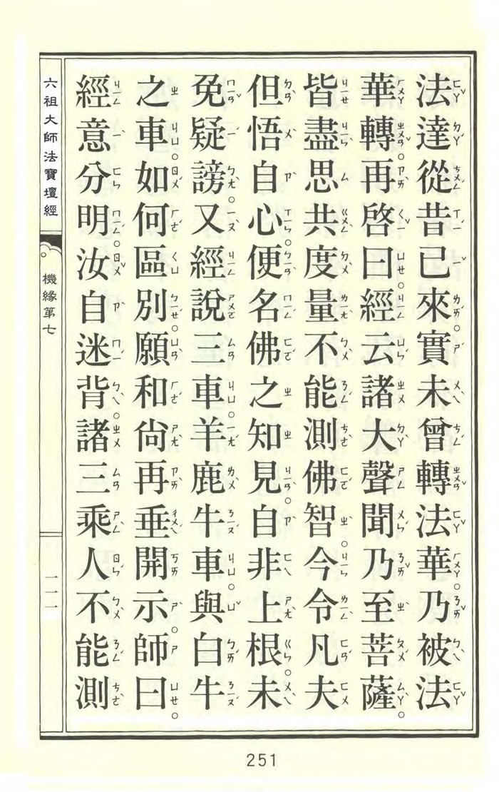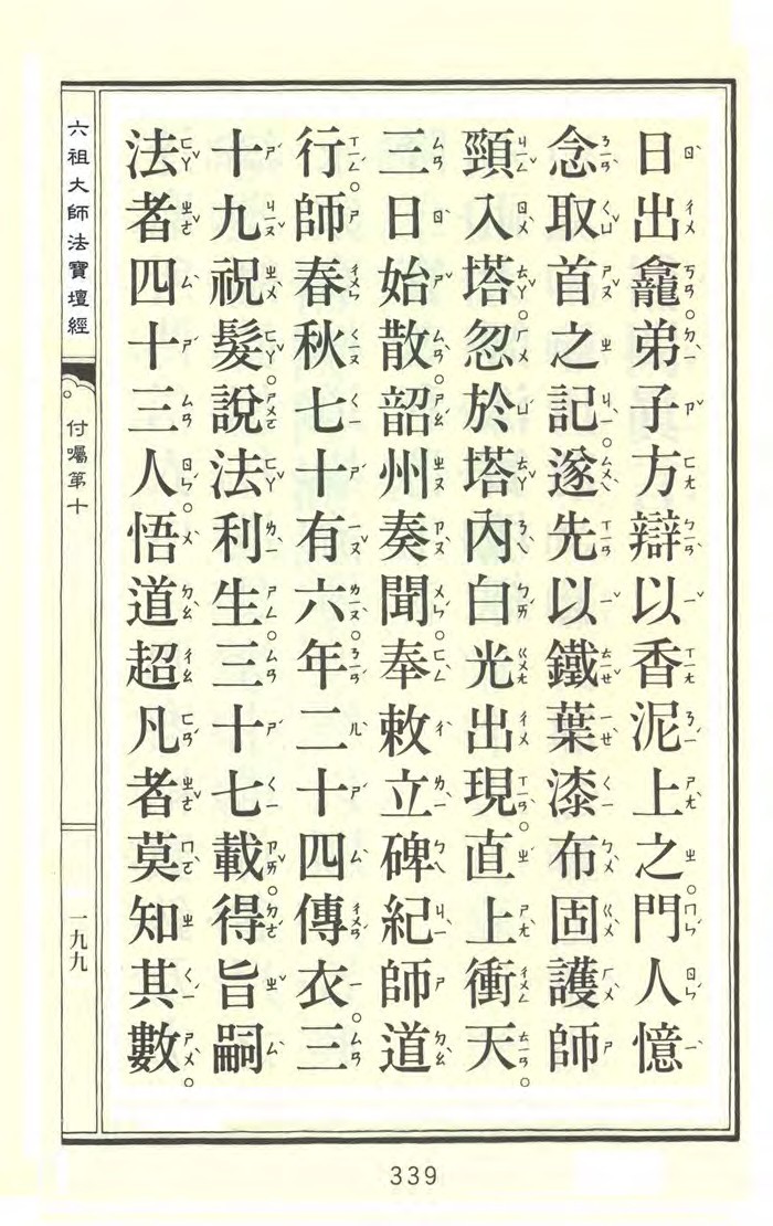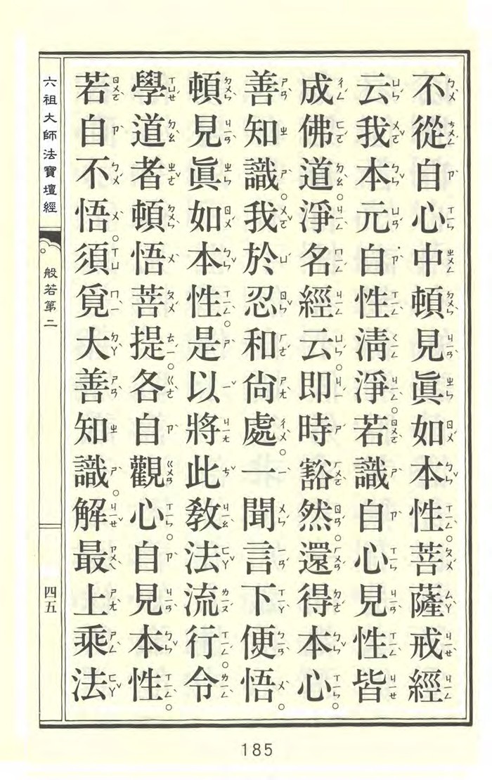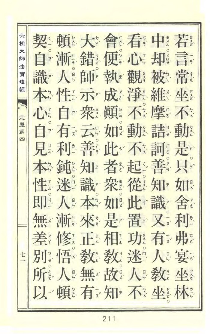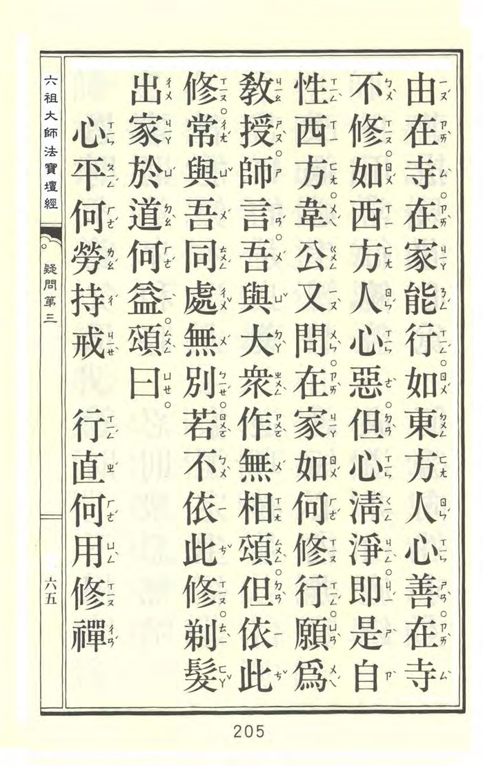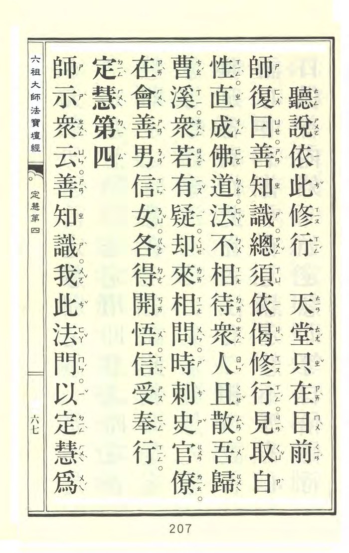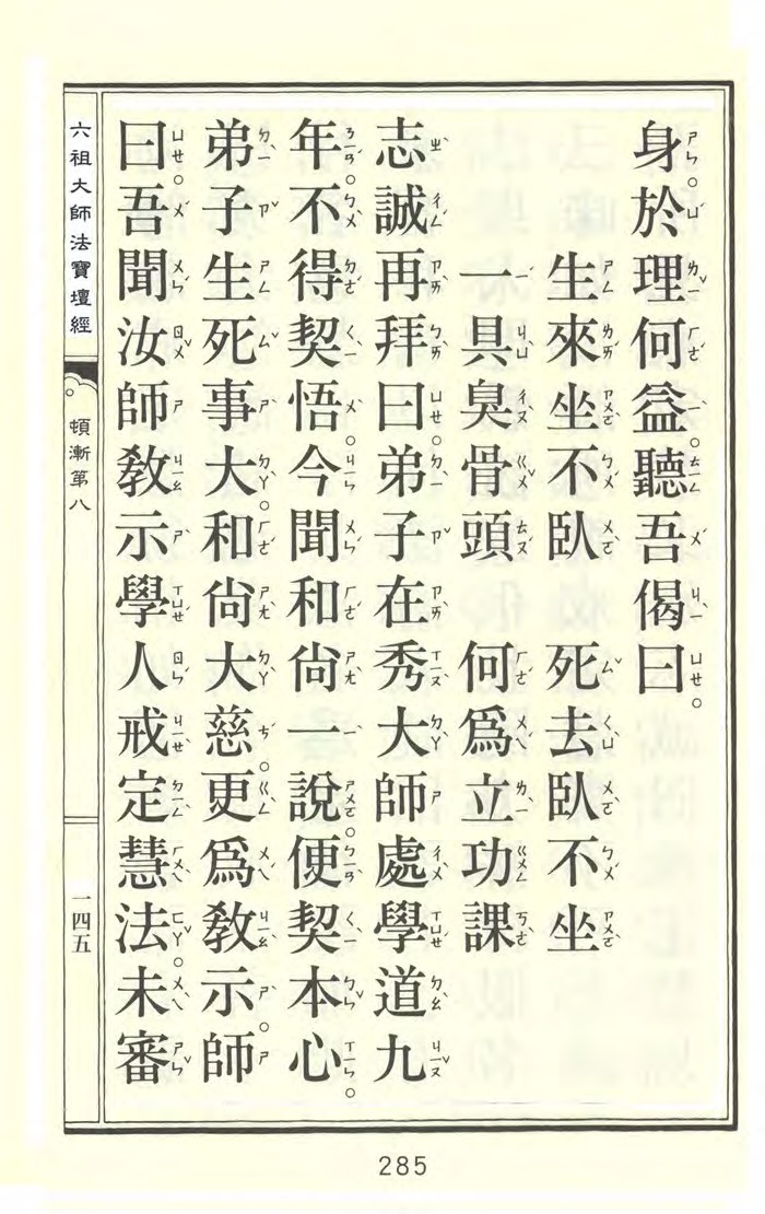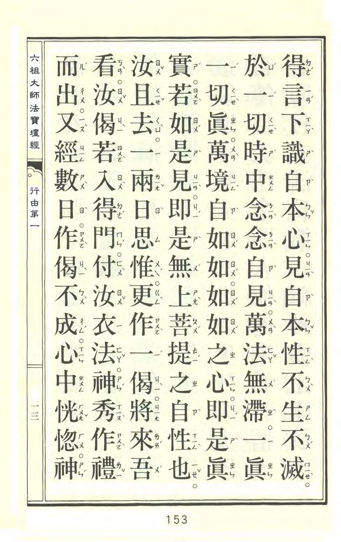 『惠能遂於菩提樹下,開東山法門。惠能於東山得法,辛苦受盡,命似懸絲,今日得與史君官僚僧尼道俗同此一會,莫非累劫之緣?亦是過去生中,供養諸佛,同種善根,方始得聞如上頓教得法之因。教是先聖所傳,不是惠能自智。願聞先聖教者,各令淨心。聞了,各自除疑,如先代聖人無別。