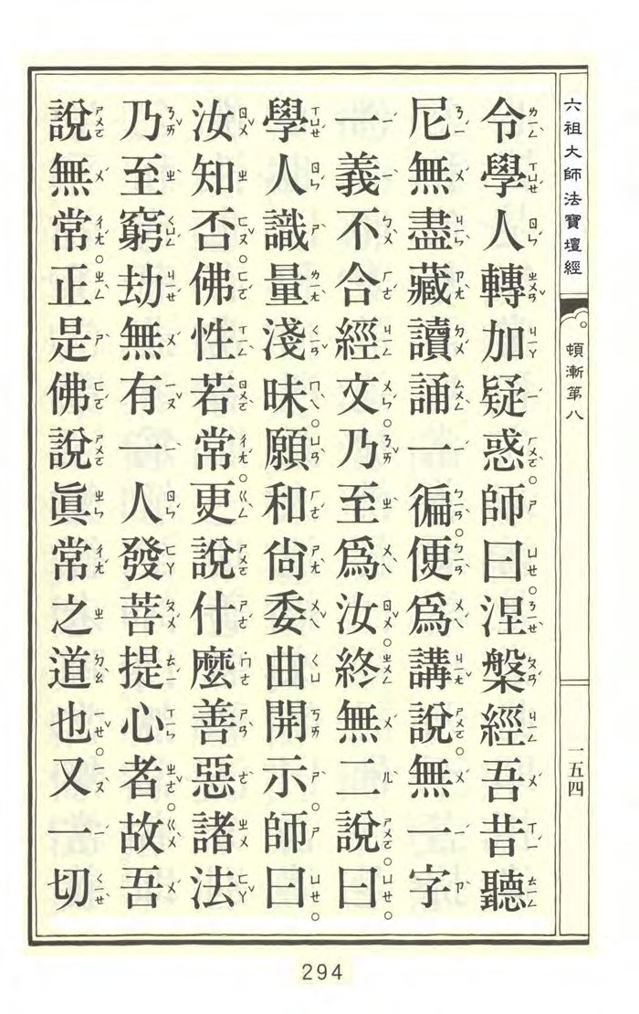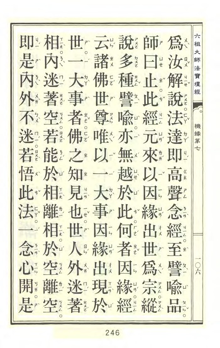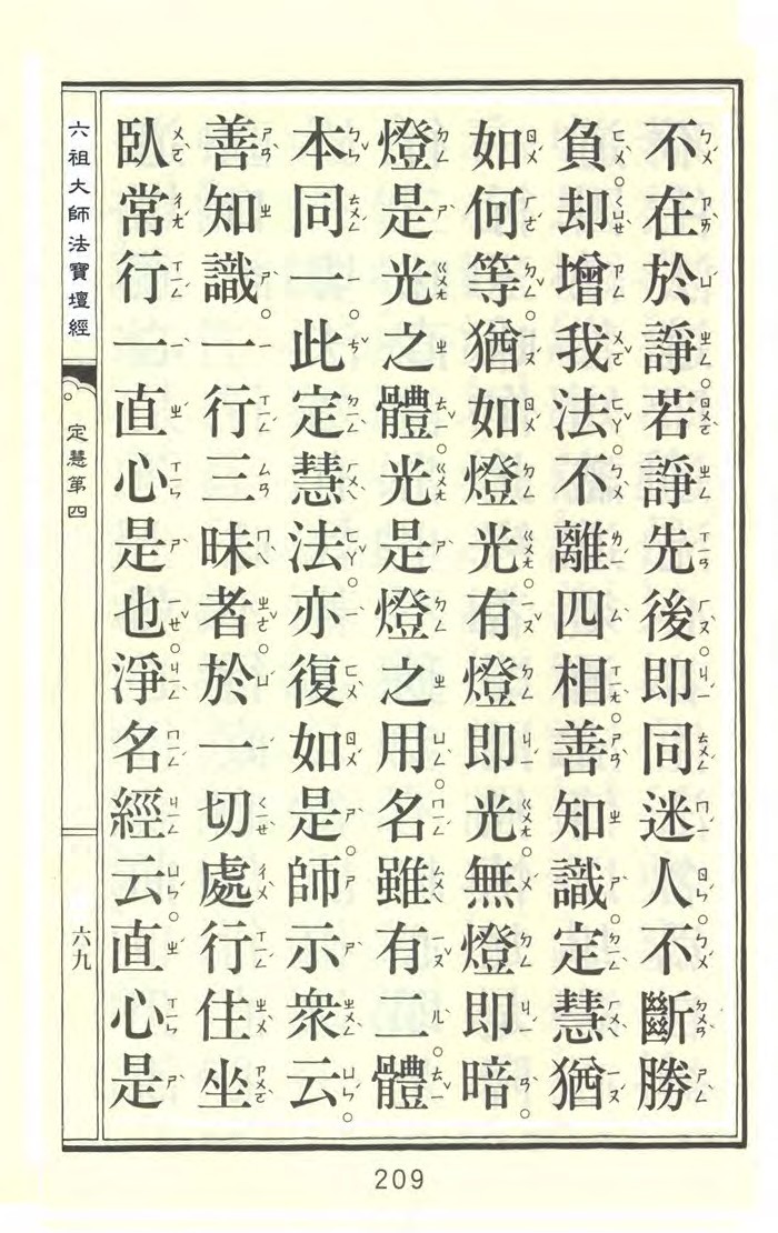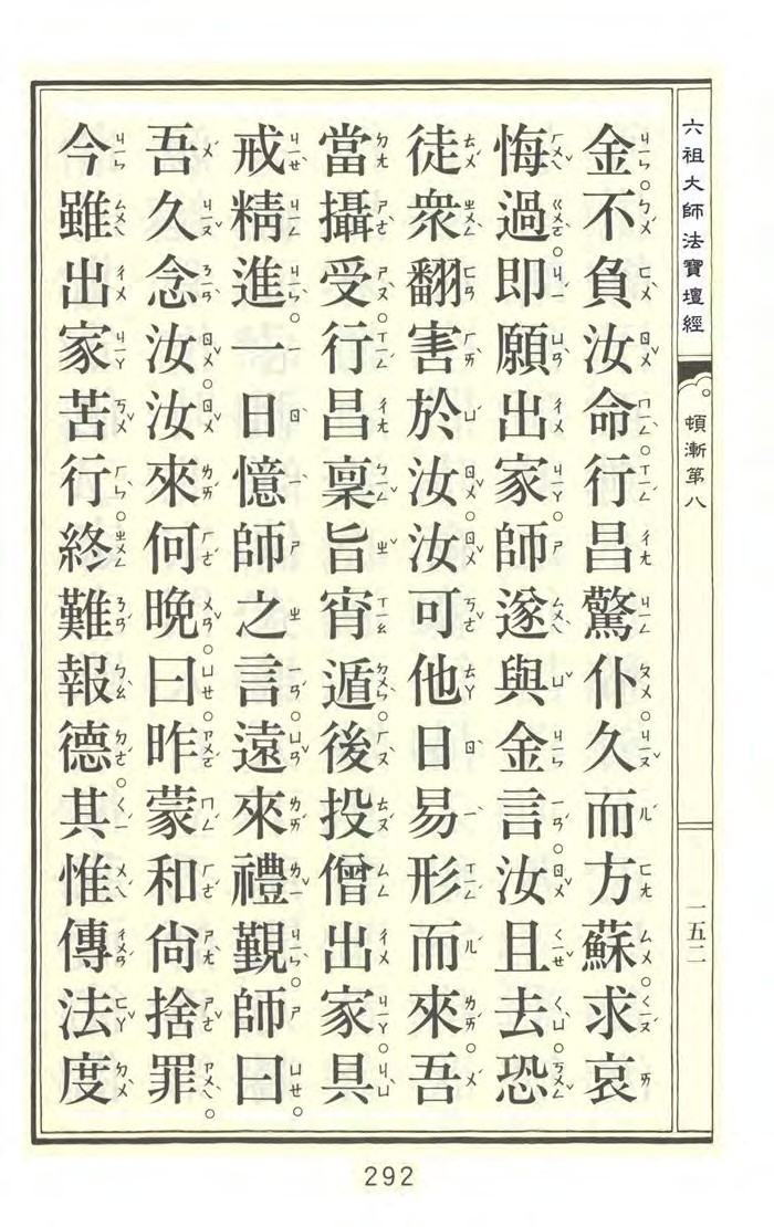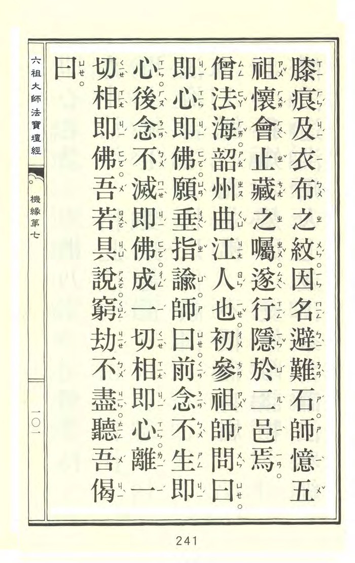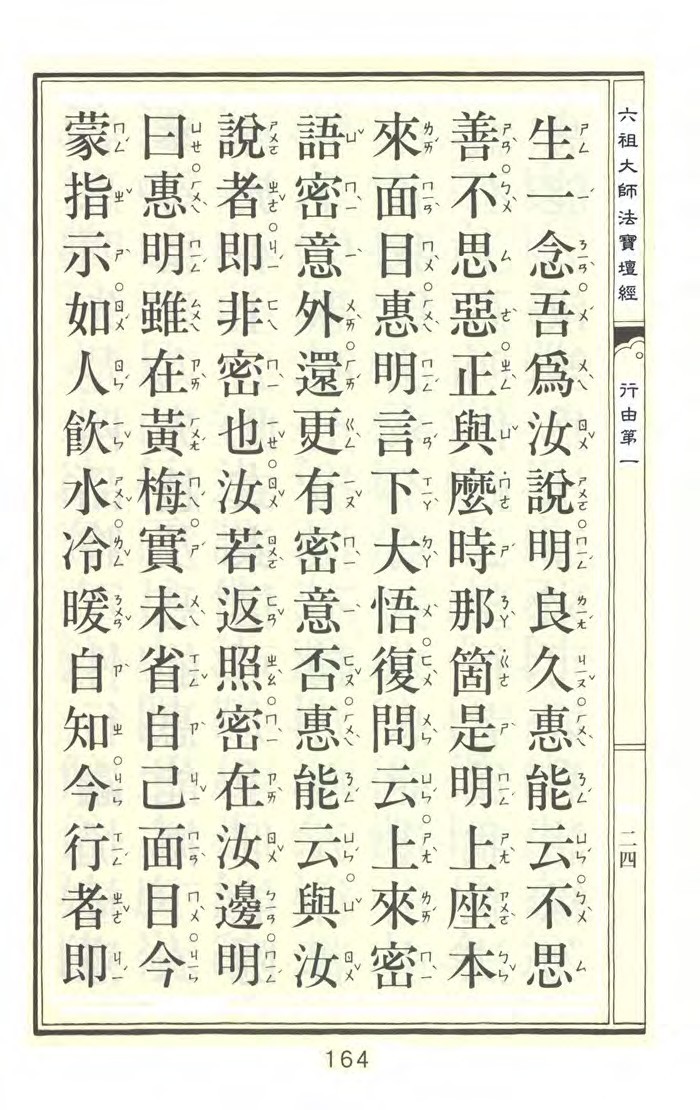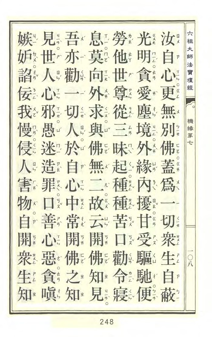 『惠能遂於菩提樹下,開東山法門。惠能於東山得法,辛苦受盡,命似懸絲,今日得與史君官僚僧尼道俗同此一會,莫非累劫之緣?亦是過去生中,供養諸佛,同種善根,方始得聞如上頓教得法之因。教是先聖所傳,不是惠能自智。願聞先聖教者,各令淨心。聞了,各自除疑,如先代聖人無別。