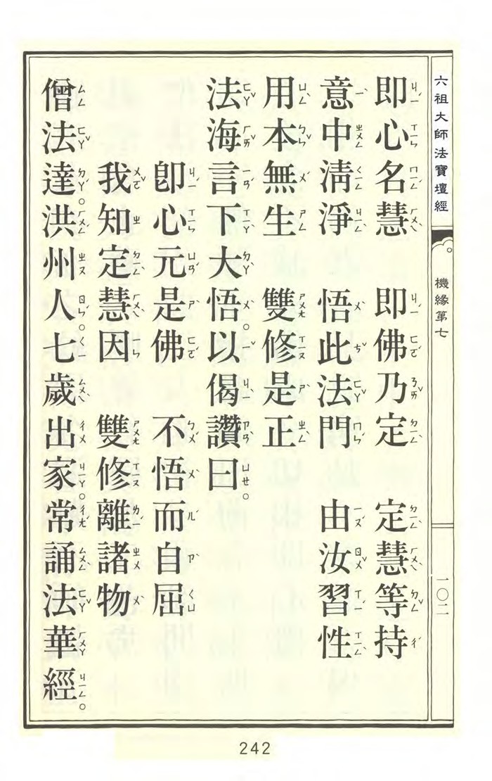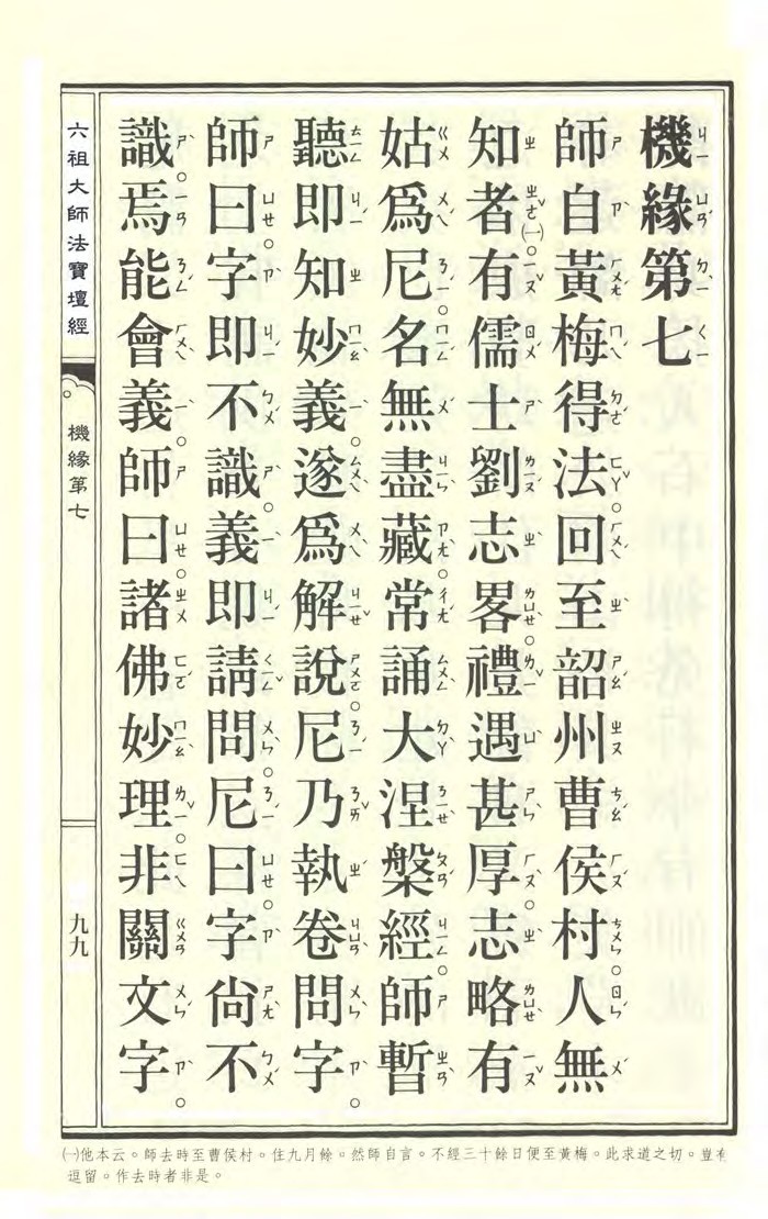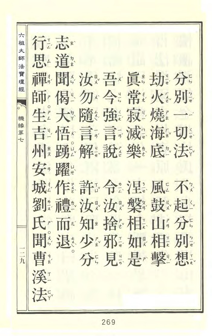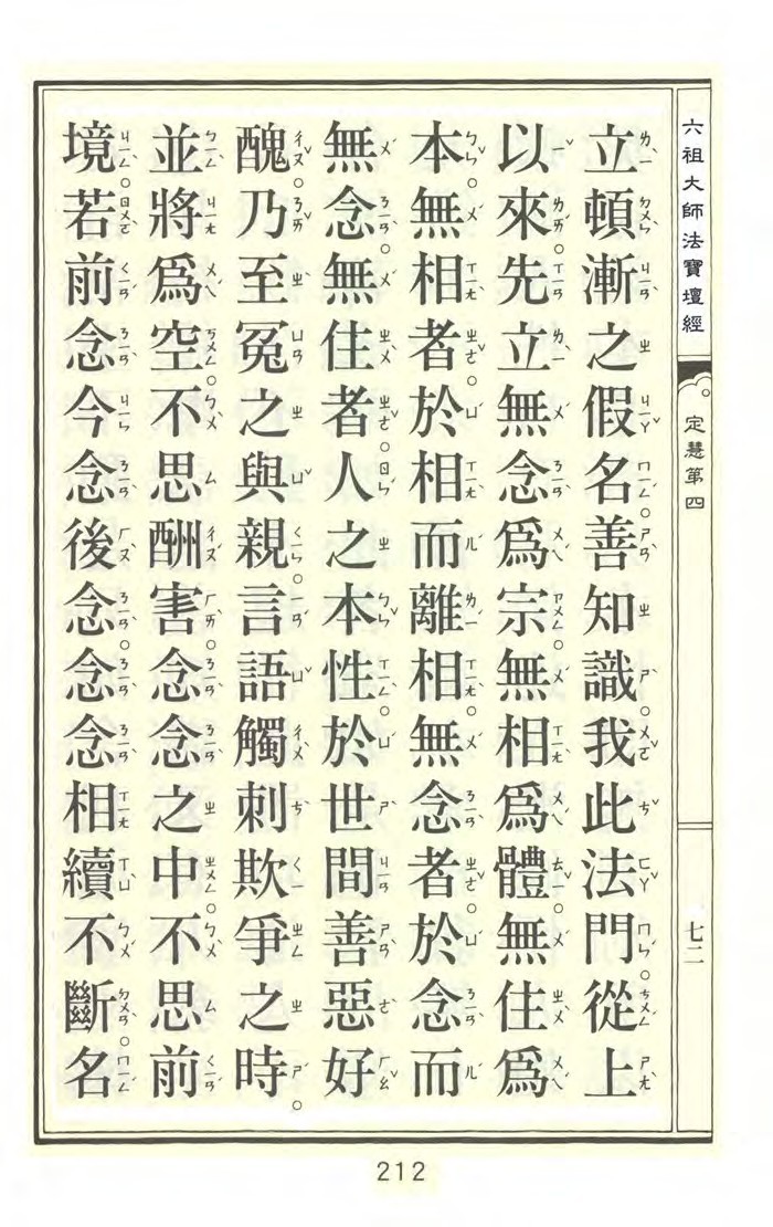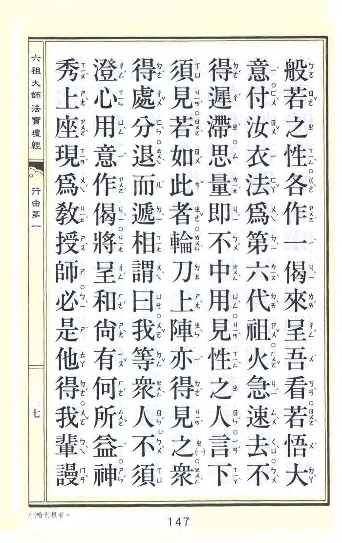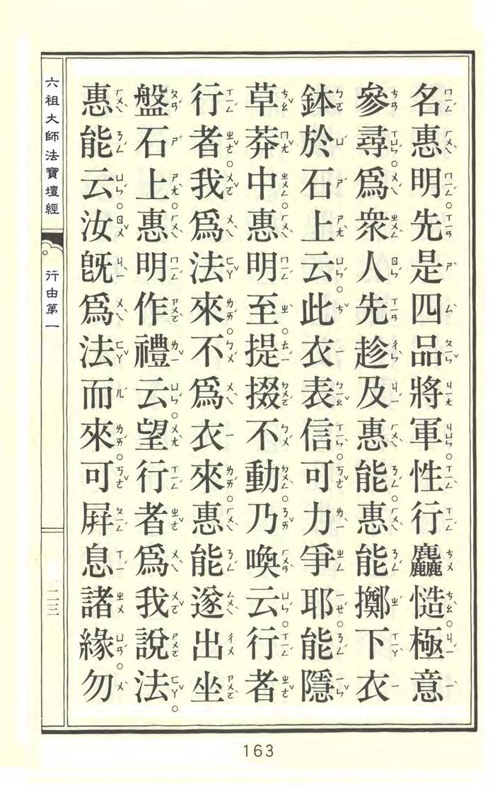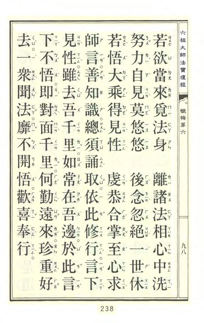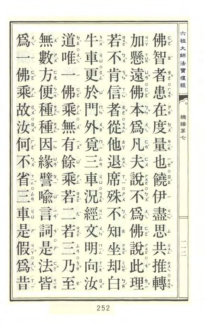 『惠能遂於菩提樹下,開東山法門。惠能於東山得法,辛苦受盡,命似懸絲,今日得與史君官僚僧尼道俗同此一會,莫非累劫之緣?亦是過去生中,供養諸佛,同種善根,方始得聞如上頓教得法之因。教是先聖所傳,不是惠能自智。願聞先聖教者,各令淨心。聞了,各自除疑,如先代聖人無別。