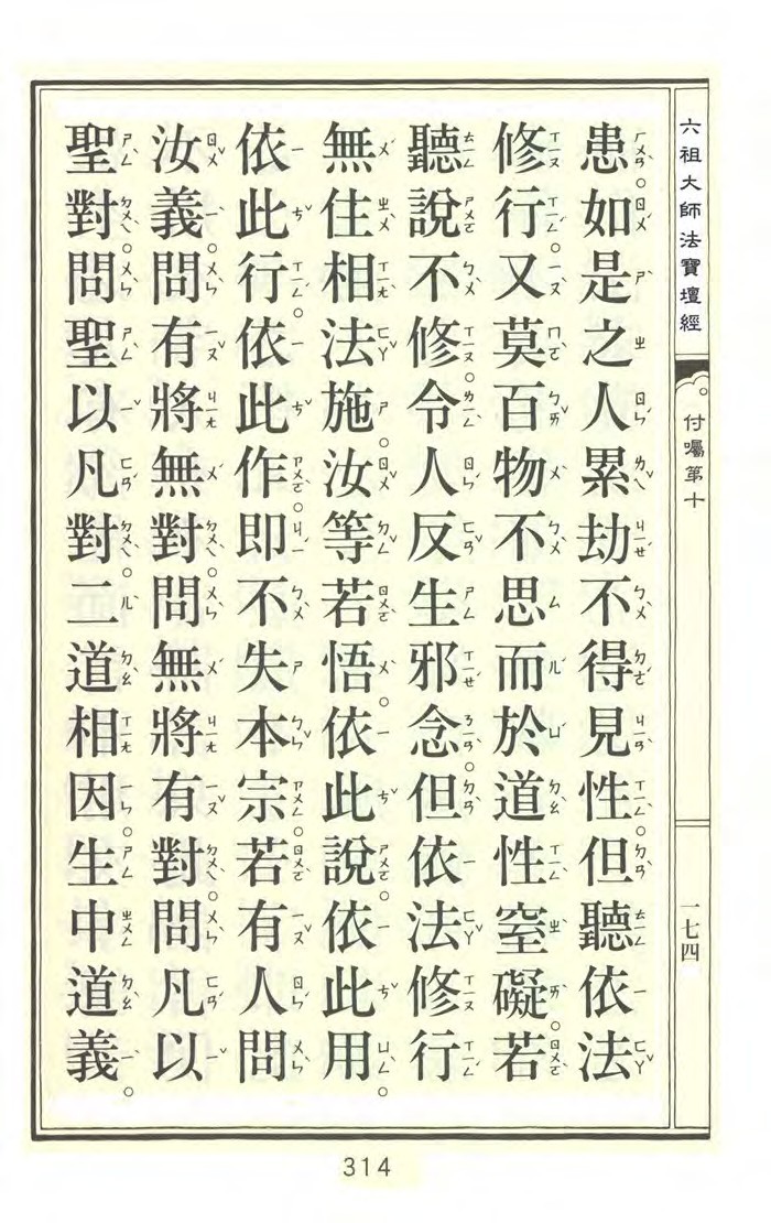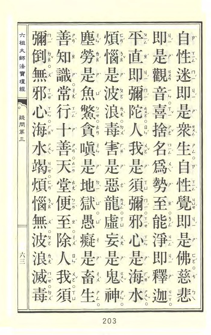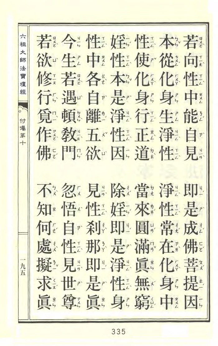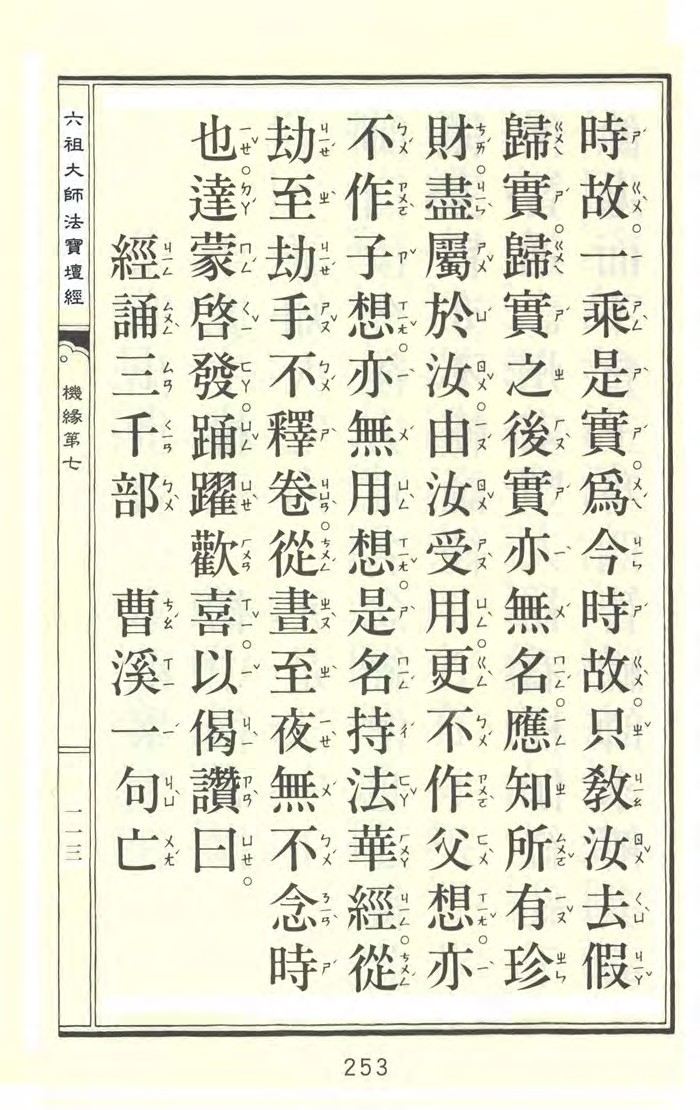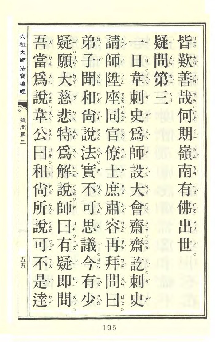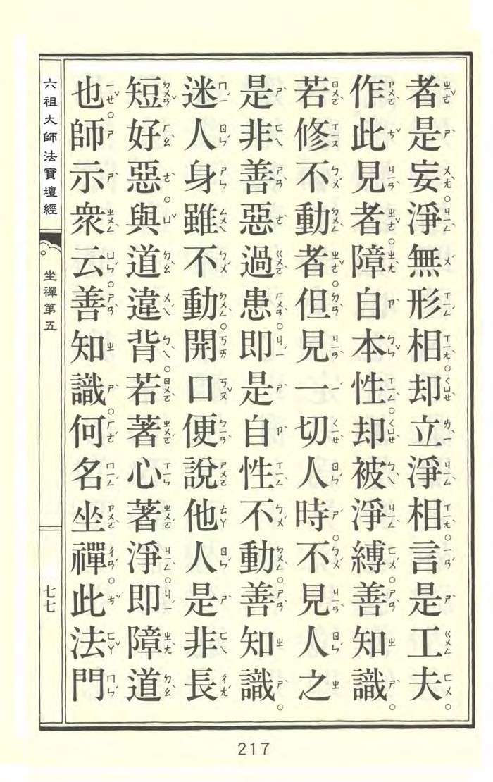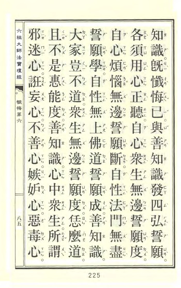 『惠能遂於菩提樹下,開東山法門。惠能於東山得法,辛苦受盡,命似懸絲,今日得與史君官僚僧尼道俗同此一會,莫非累劫之緣?亦是過去生中,供養諸佛,同種善根,方始得聞如上頓教得法之因。教是先聖所傳,不是惠能自智。願聞先聖教者,各令淨心。聞了,各自除疑,如先代聖人無別。