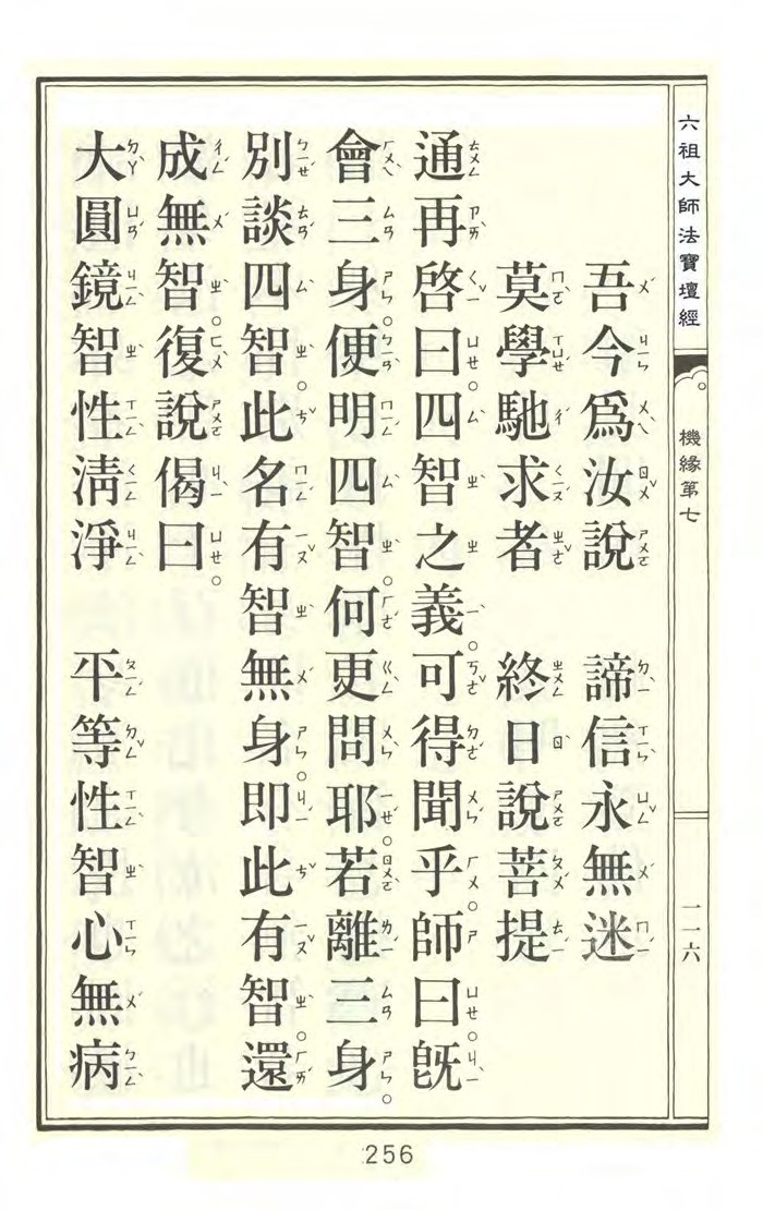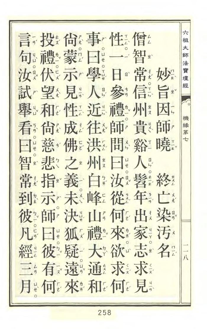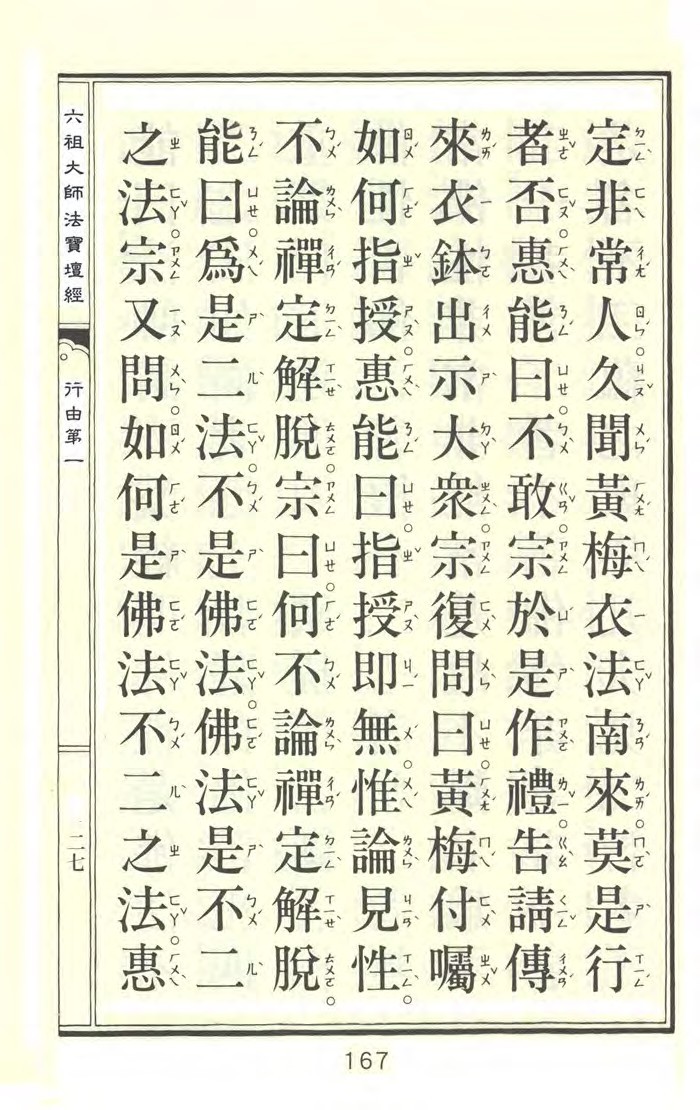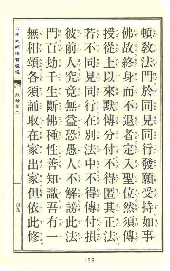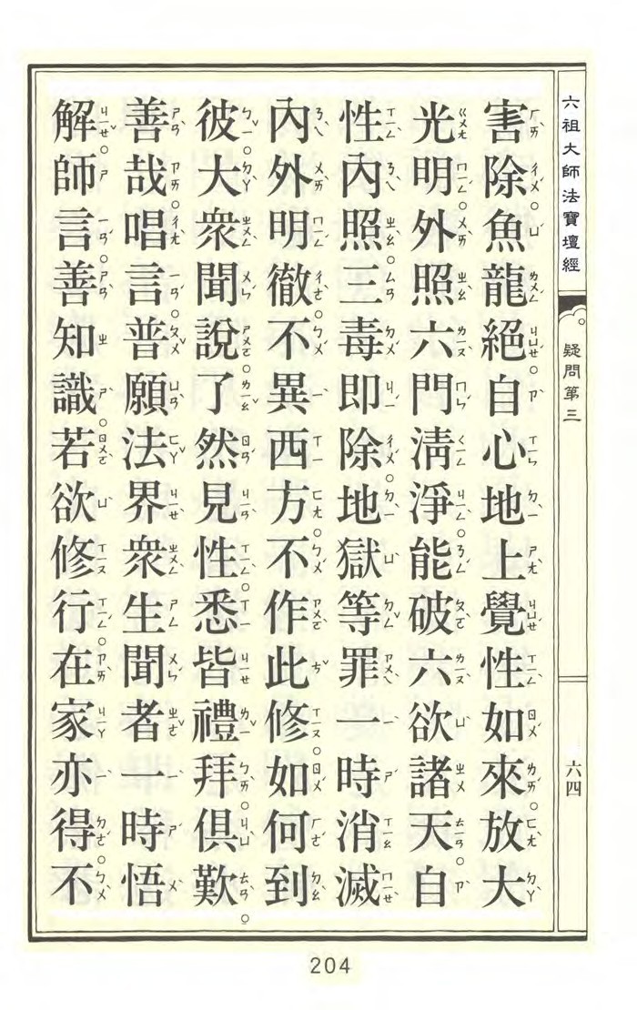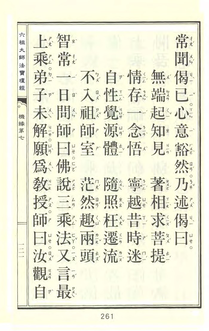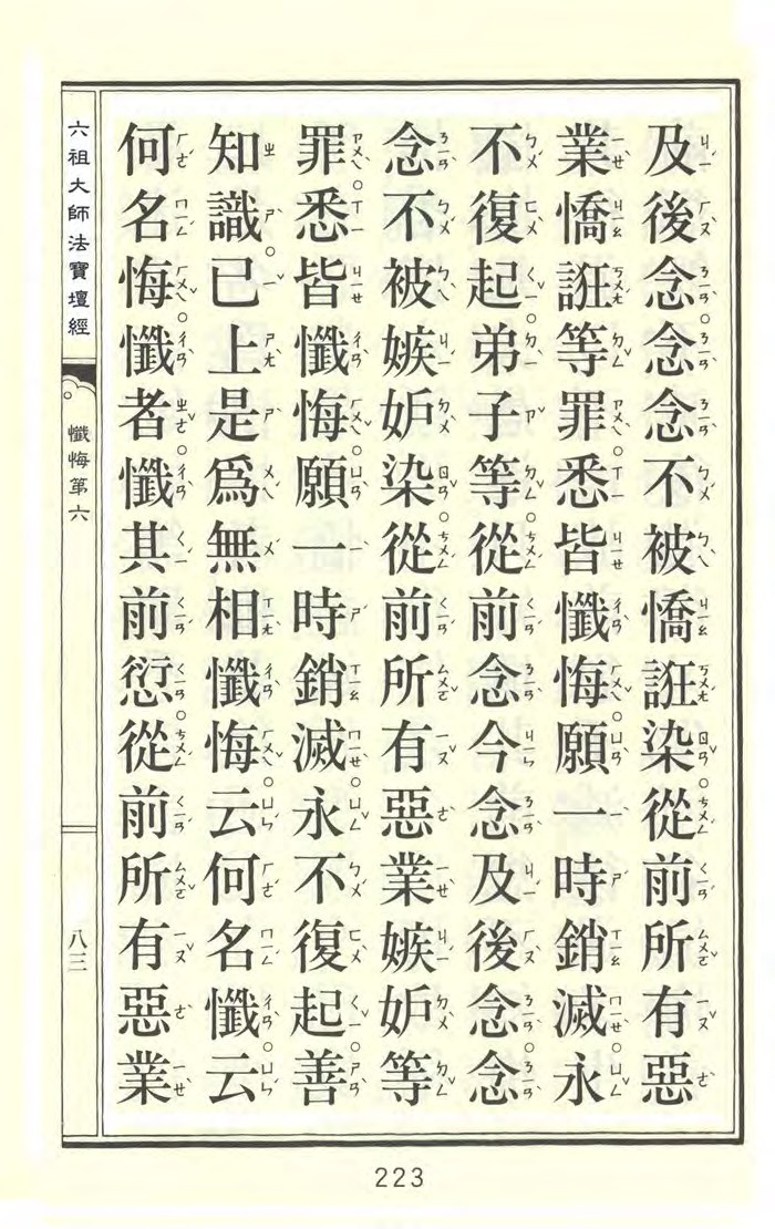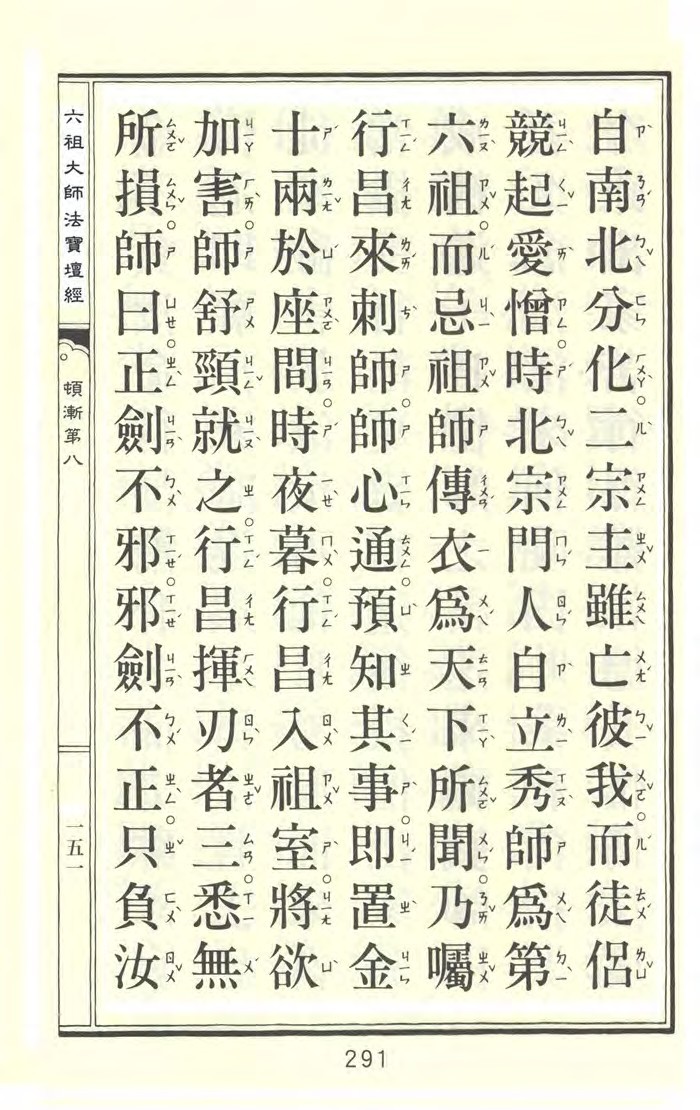 『惠能遂於菩提樹下,開東山法門。惠能於東山得法,辛苦受盡,命似懸絲,今日得與史君官僚僧尼道俗同此一會,莫非累劫之緣?亦是過去生中,供養諸佛,同種善根,方始得聞如上頓教得法之因。教是先聖所傳,不是惠能自智。願聞先聖教者,各令淨心。聞了,各自除疑,如先代聖人無別。