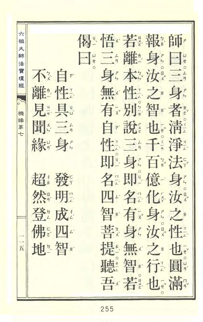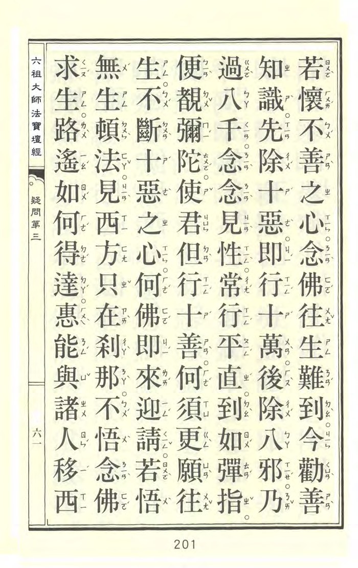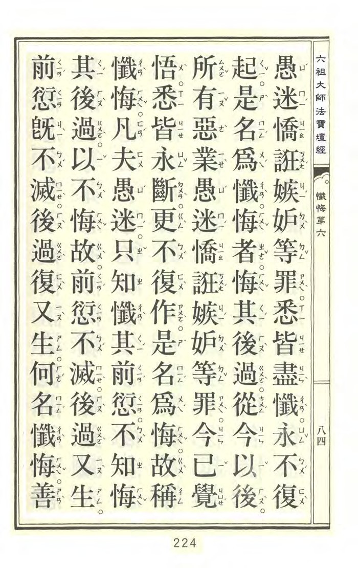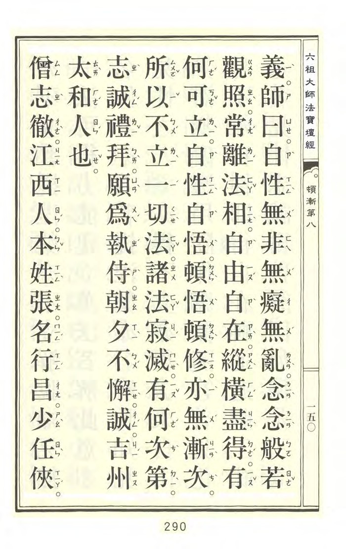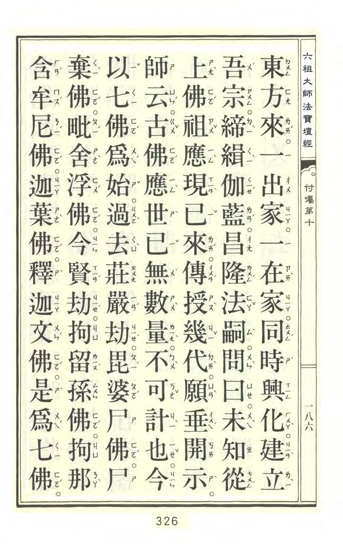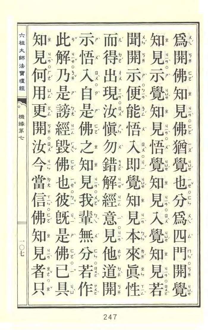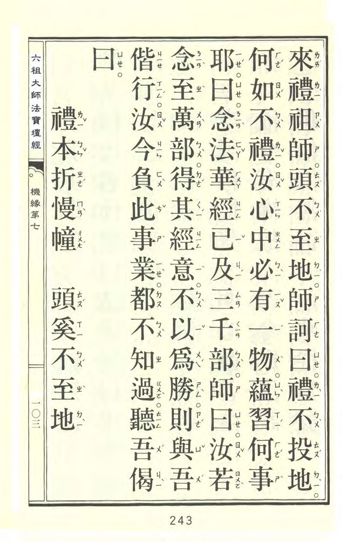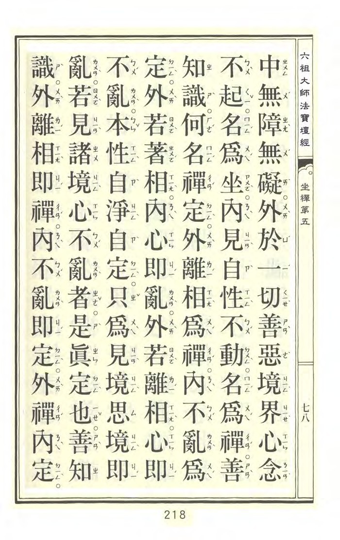『惠能遂於菩提樹下,開東山法門。惠能於東山得法,辛苦受盡,命似懸絲,今日得與史君官僚僧尼道俗同此一會,莫非累劫之緣?亦是過去生中,供養諸佛,同種善根,方始得聞如上頓教得法之因。教是先聖所傳,不是惠能自智。願聞先聖教者,各令淨心。聞了,各自除疑,如先代聖人無別。