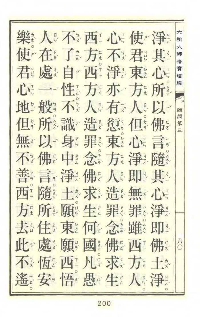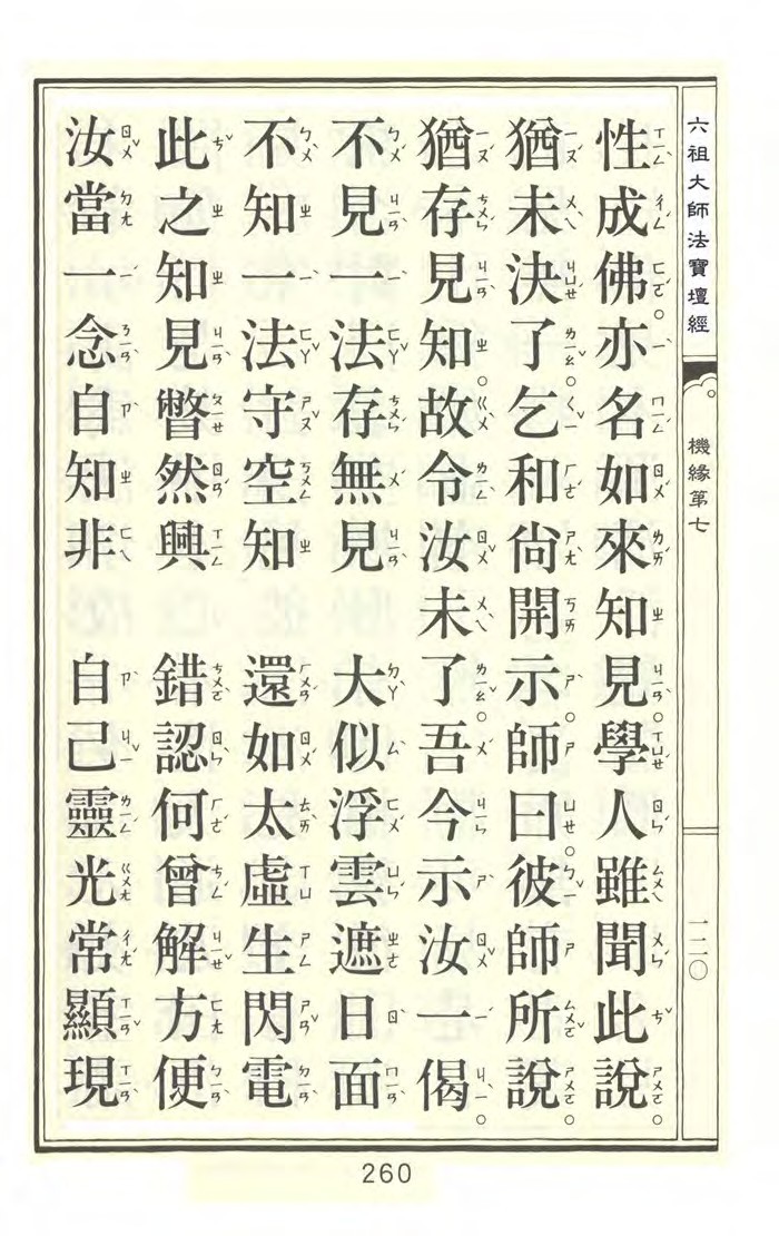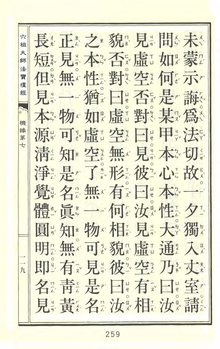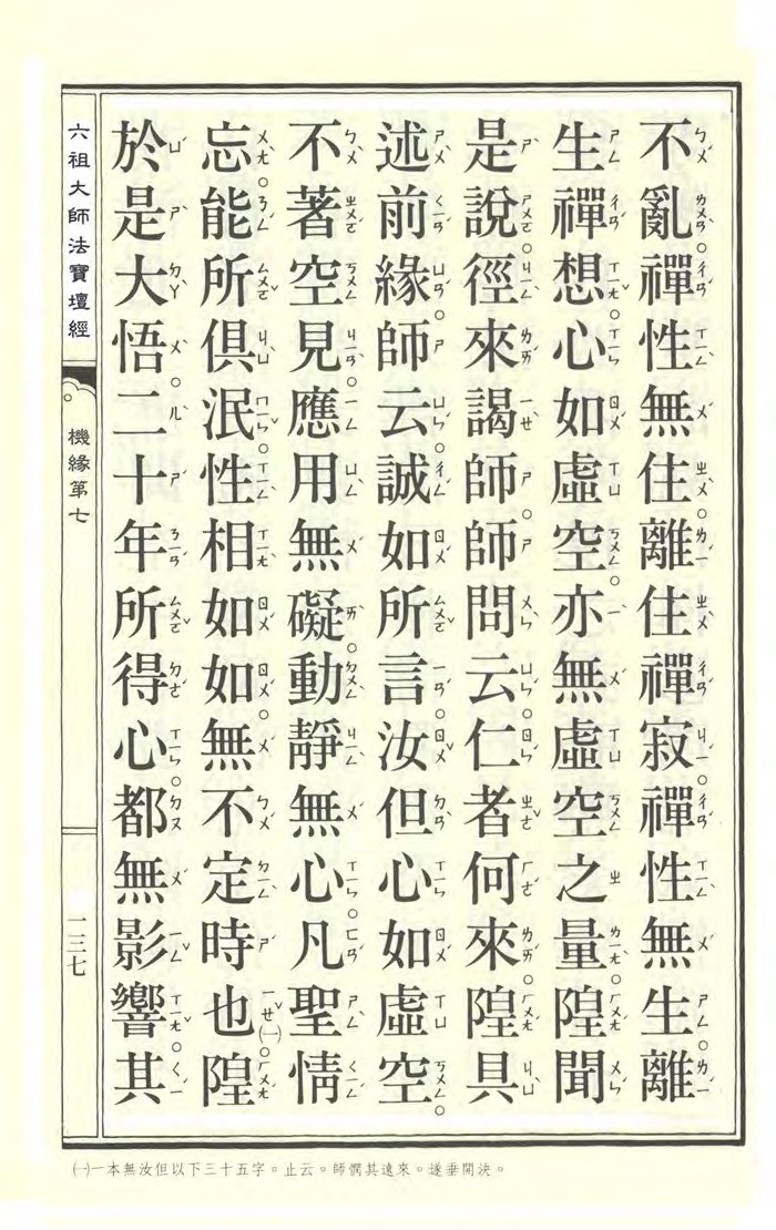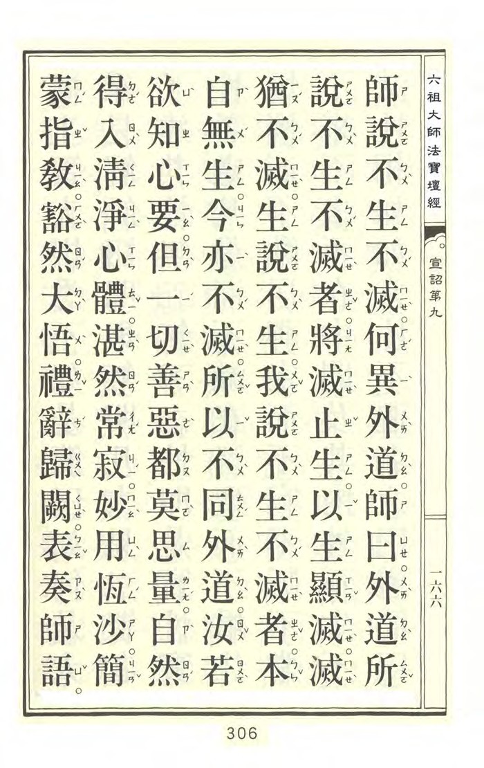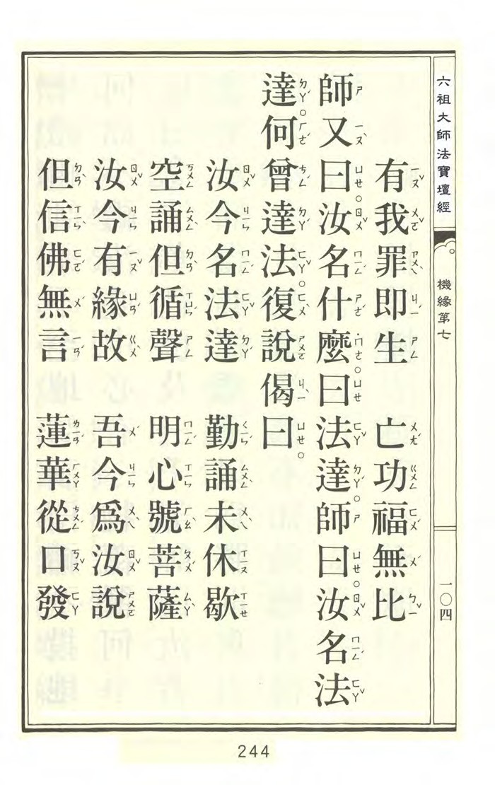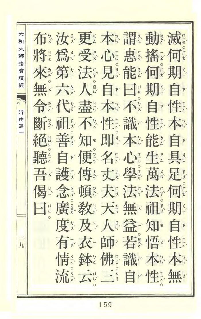 『惠能遂於菩提樹下,開東山法門。惠能於東山得法,辛苦受盡,命似懸絲,今日得與史君官僚僧尼道俗同此一會,莫非累劫之緣?亦是過去生中,供養諸佛,同種善根,方始得聞如上頓教得法之因。教是先聖所傳,不是惠能自智。願聞先聖教者,各令淨心。聞了,各自除疑,如先代聖人無別。