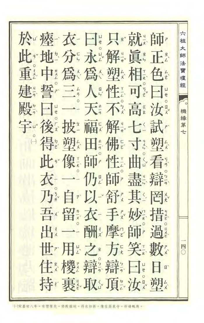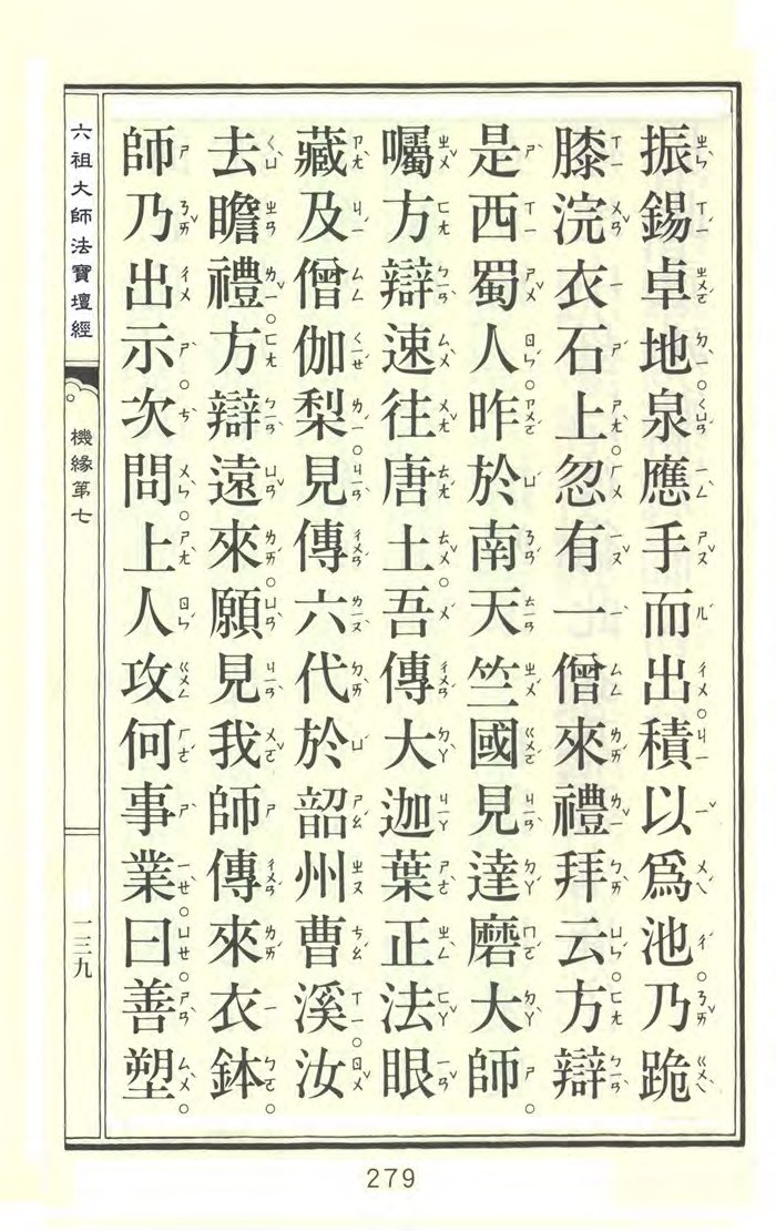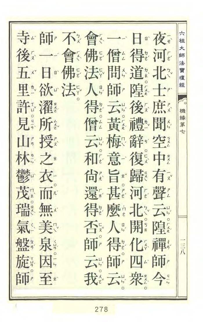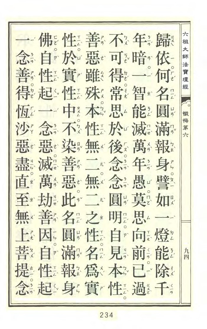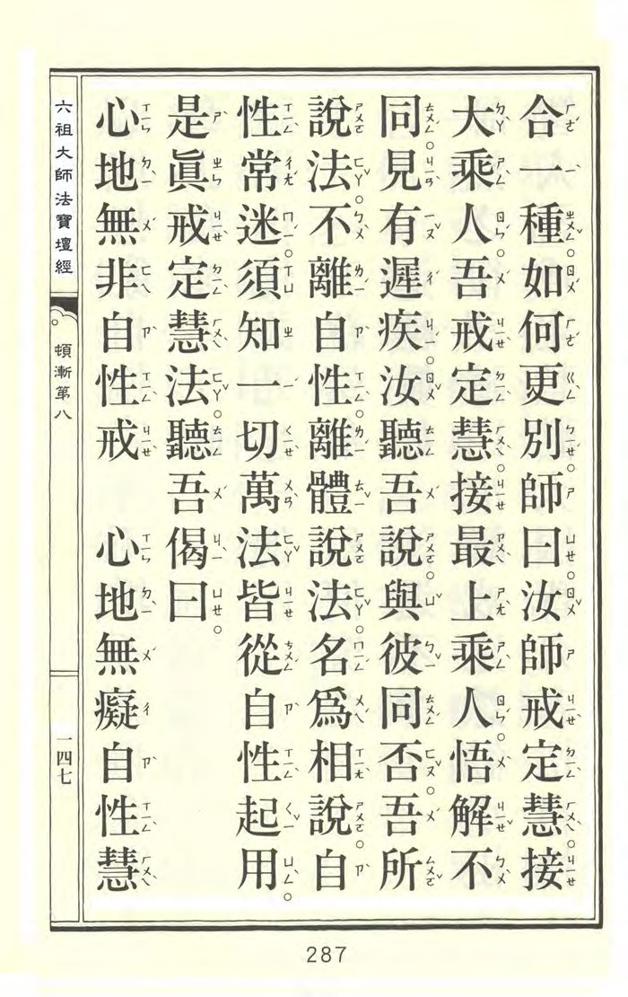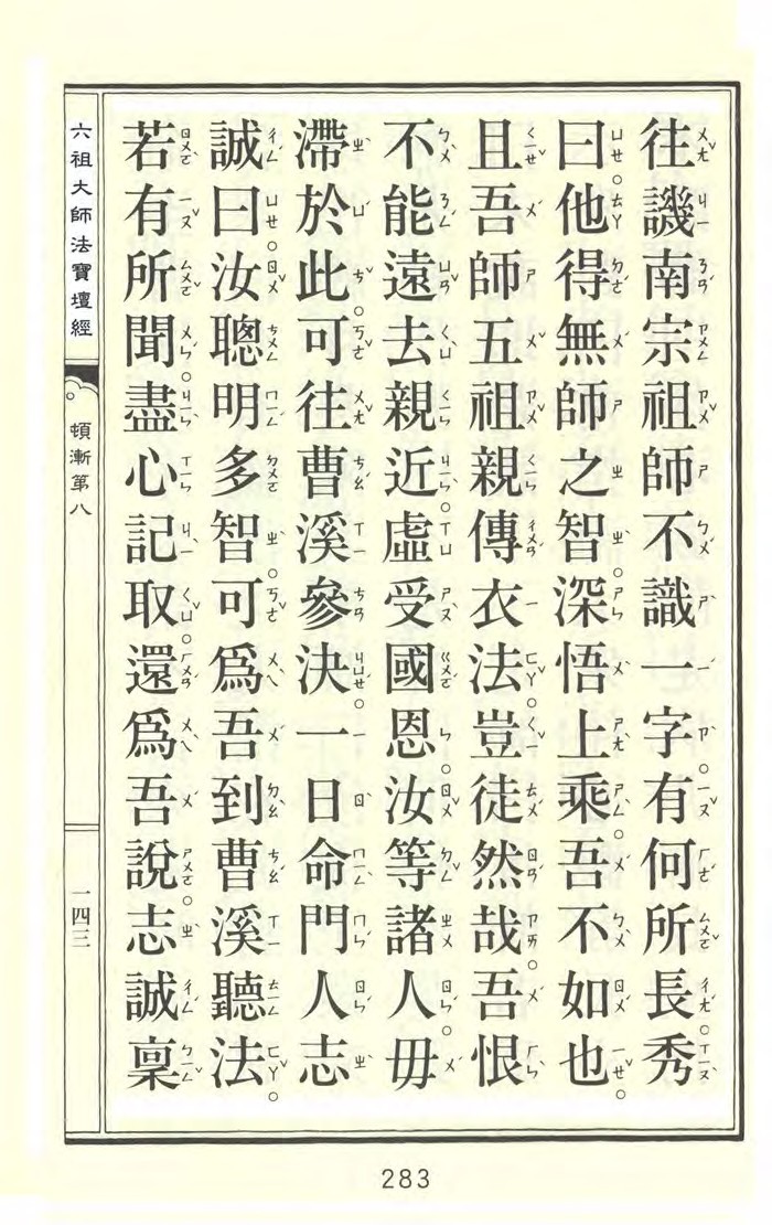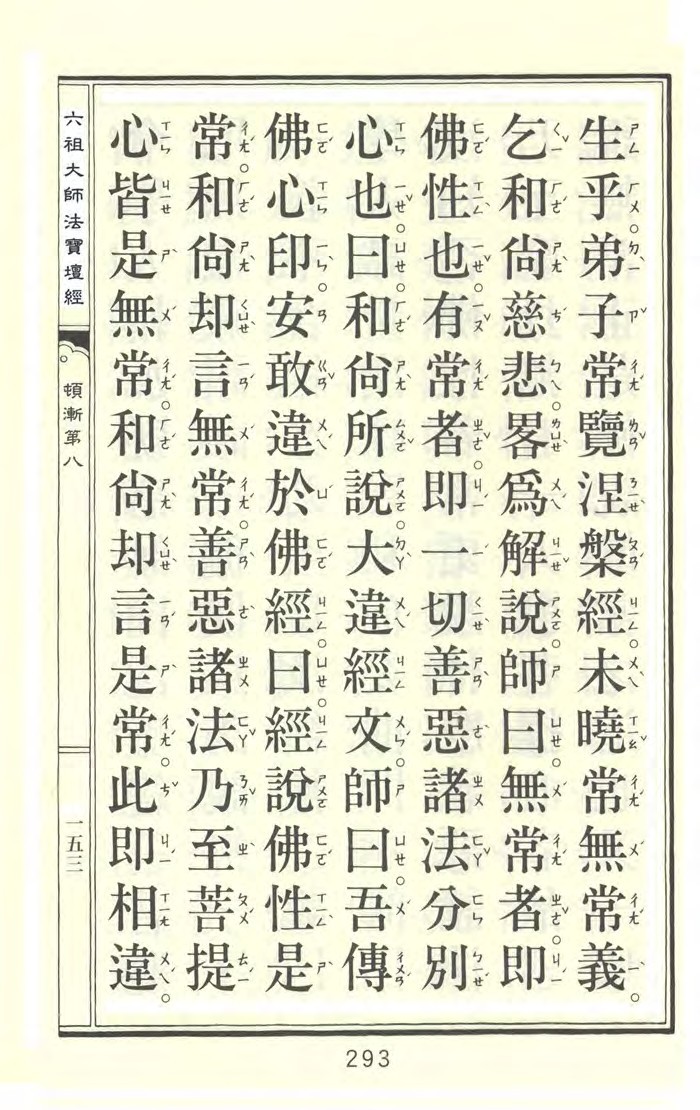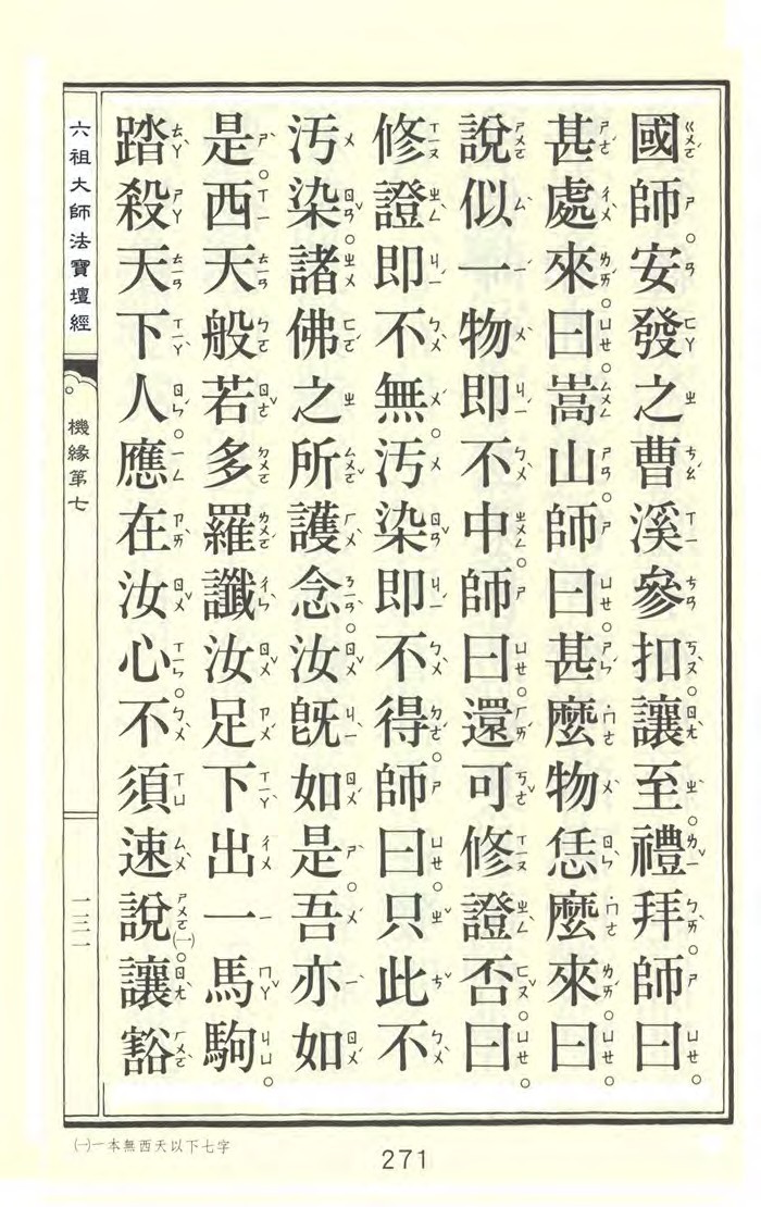 『惠能遂於菩提樹下,開東山法門。惠能於東山得法,辛苦受盡,命似懸絲,今日得與史君官僚僧尼道俗同此一會,莫非累劫之緣?亦是過去生中,供養諸佛,同種善根,方始得聞如上頓教得法之因。教是先聖所傳,不是惠能自智。願聞先聖教者,各令淨心。聞了,各自除疑,如先代聖人無別。