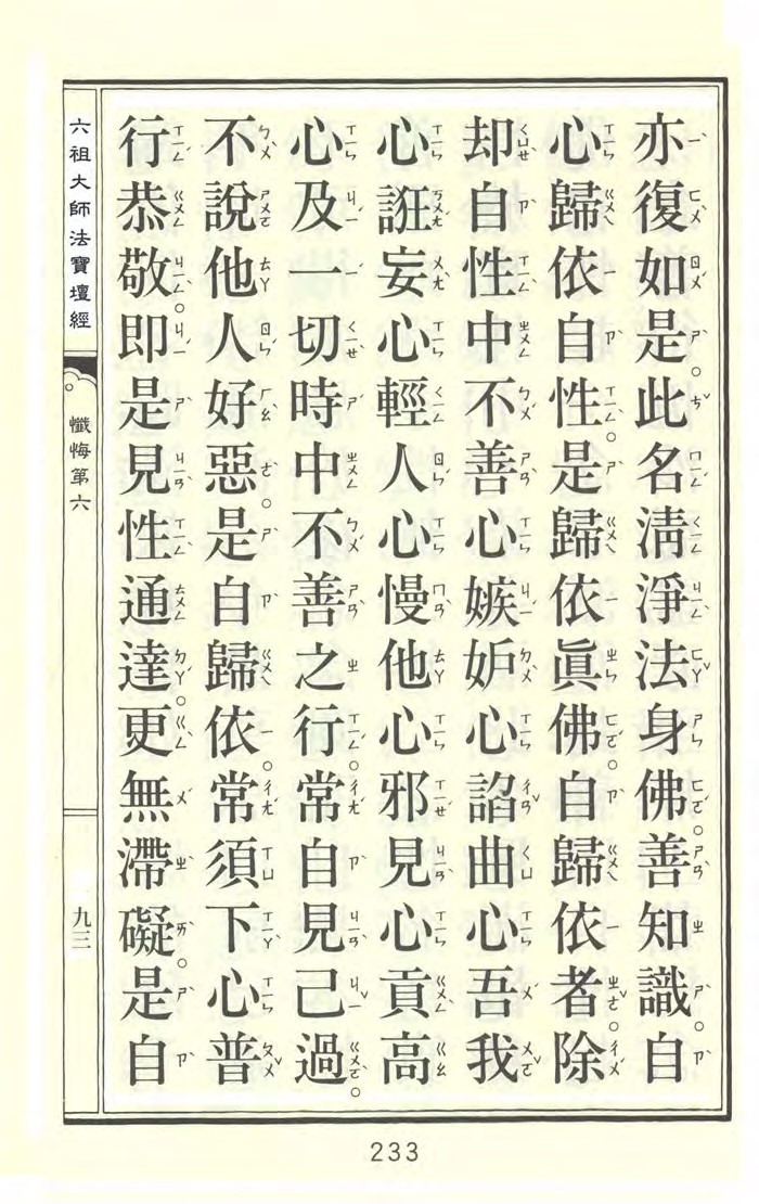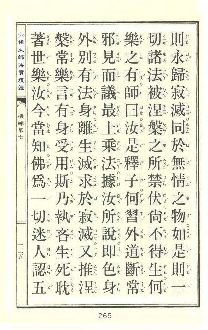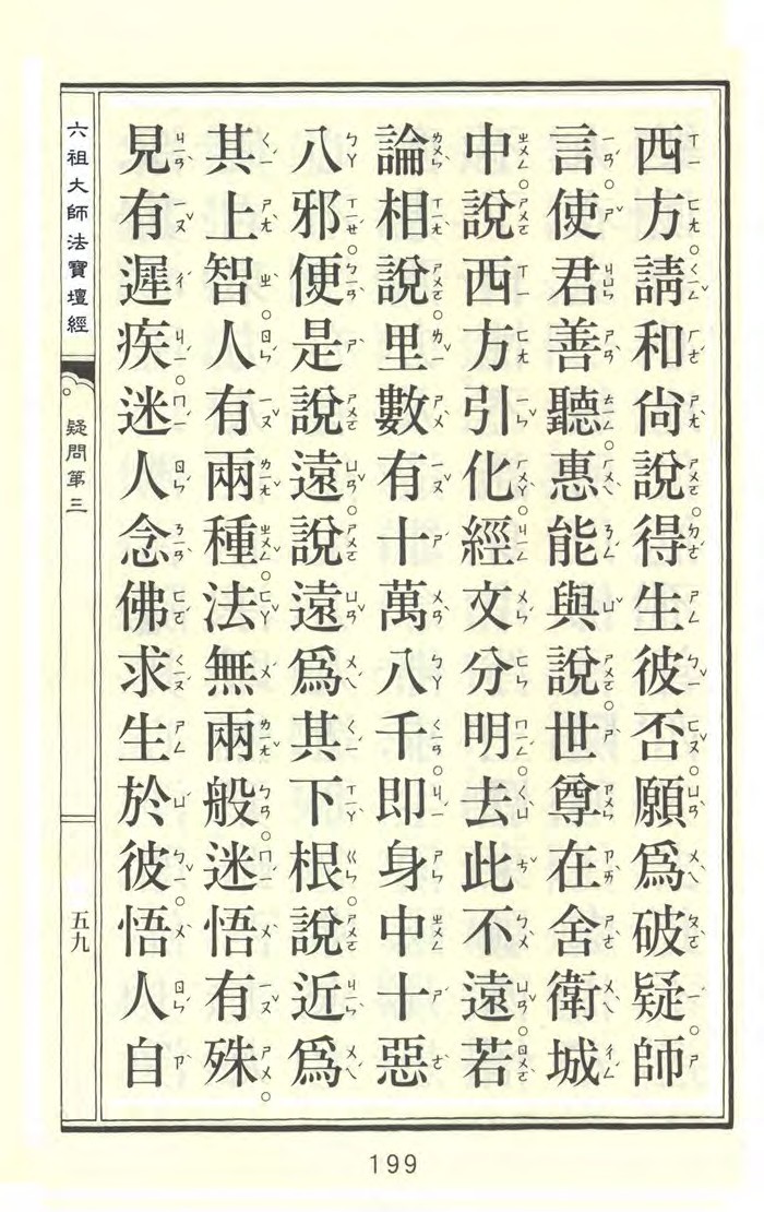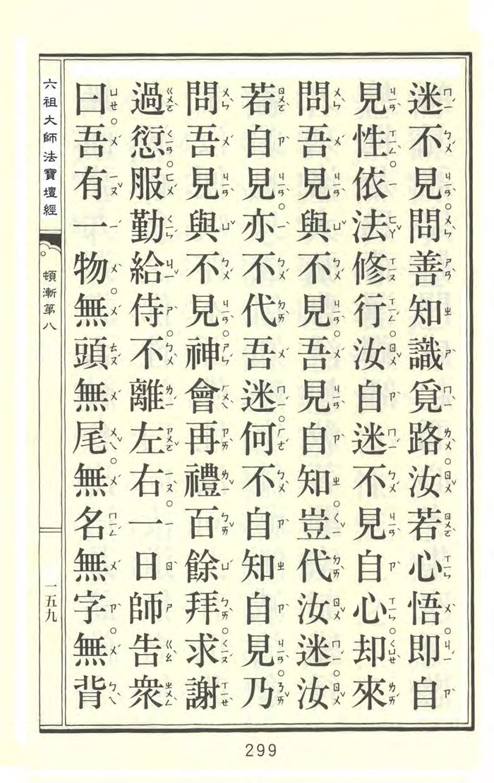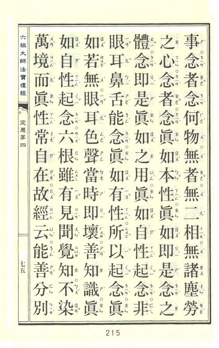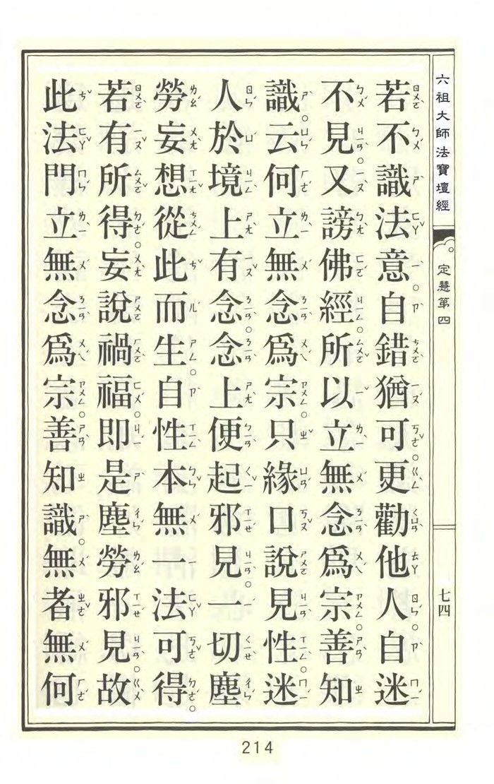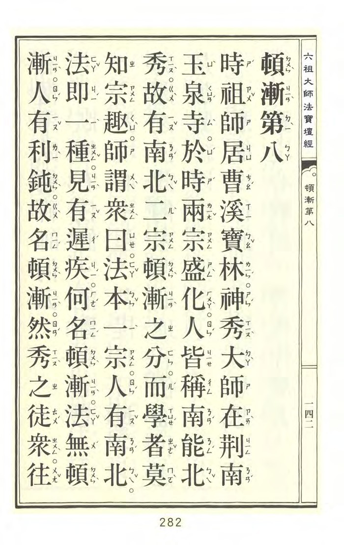 『惠能遂於菩提樹下,開東山法門。惠能於東山得法,辛苦受盡,命似懸絲,今日得與史君官僚僧尼道俗同此一會,莫非累劫之緣?亦是過去生中,供養諸佛,同種善根,方始得聞如上頓教得法之因。教是先聖所傳,不是惠能自智。願聞先聖教者,各令淨心。聞了,各自除疑,如先代聖人無別。