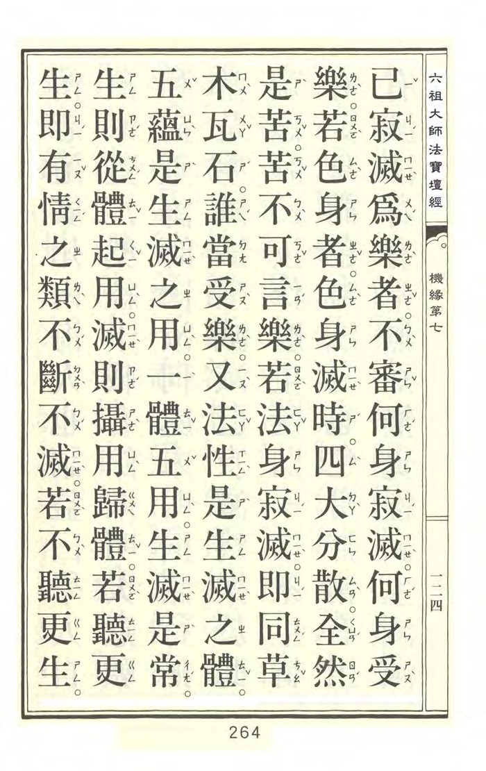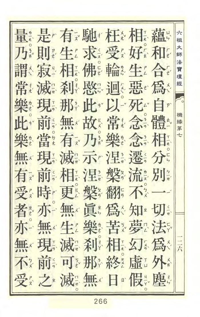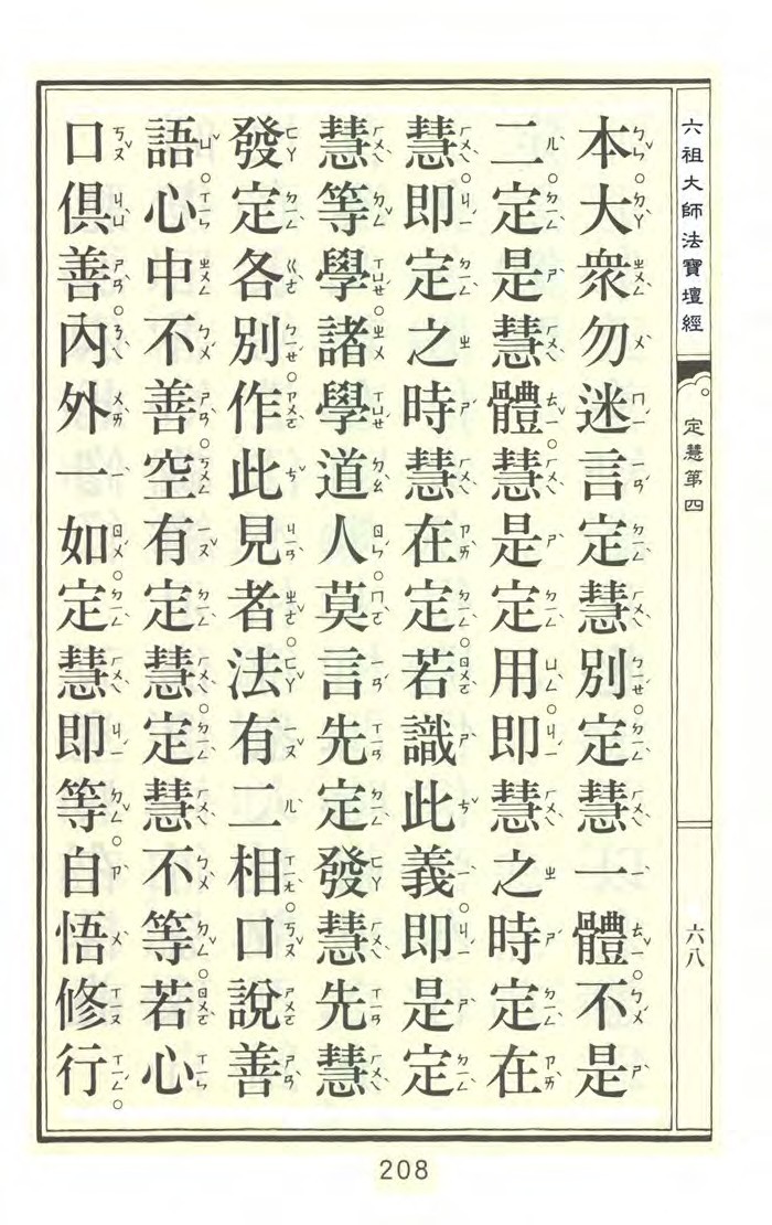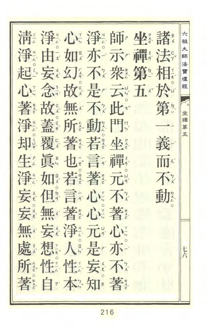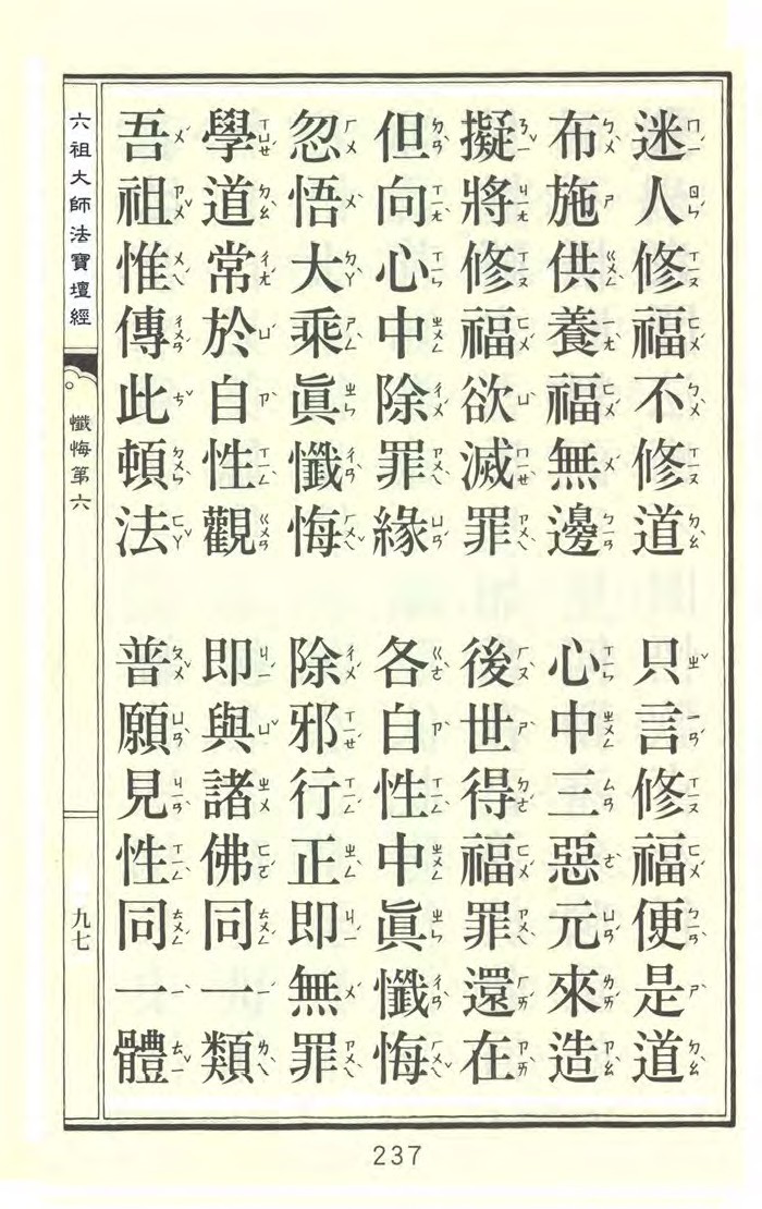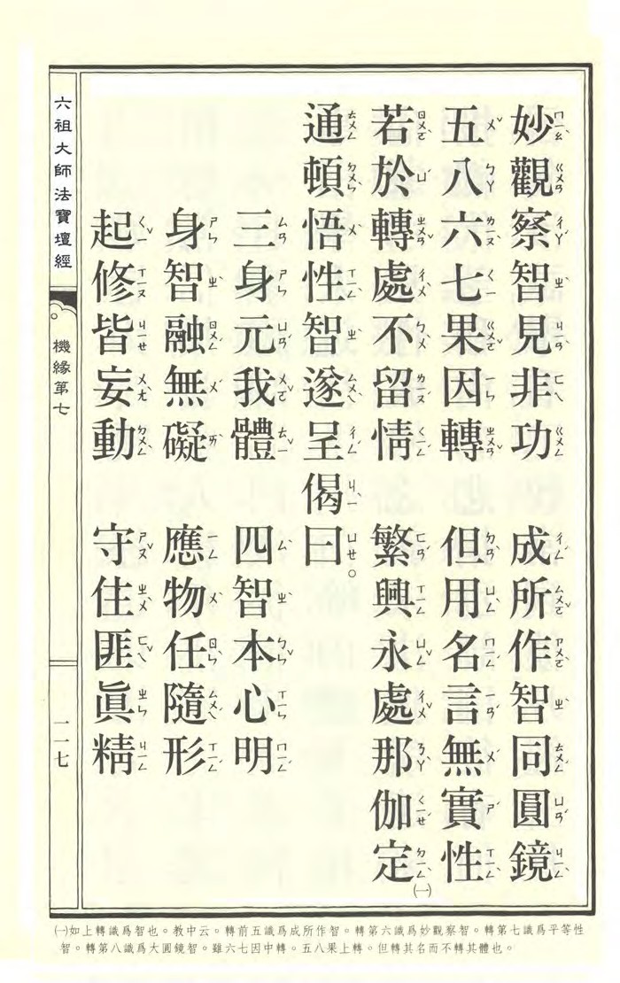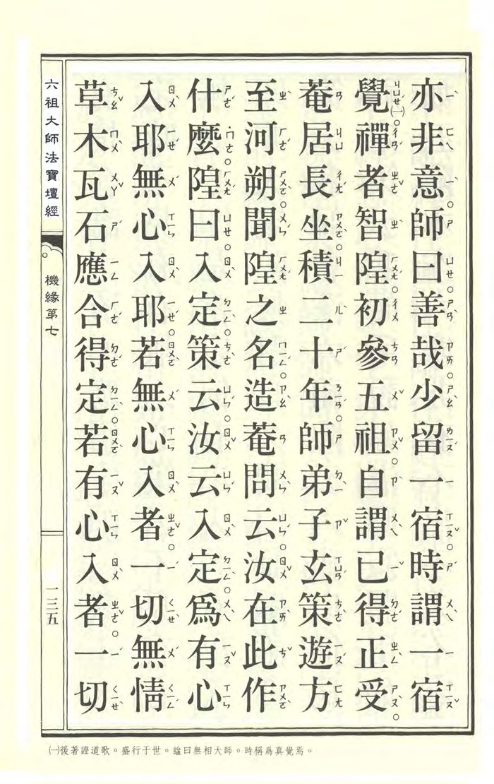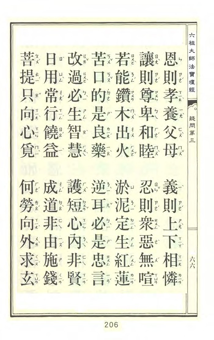 『惠能遂於菩提樹下,開東山法門。惠能於東山得法,辛苦受盡,命似懸絲,今日得與史君官僚僧尼道俗同此一會,莫非累劫之緣?亦是過去生中,供養諸佛,同種善根,方始得聞如上頓教得法之因。教是先聖所傳,不是惠能自智。願聞先聖教者,各令淨心。聞了,各自除疑,如先代聖人無別。