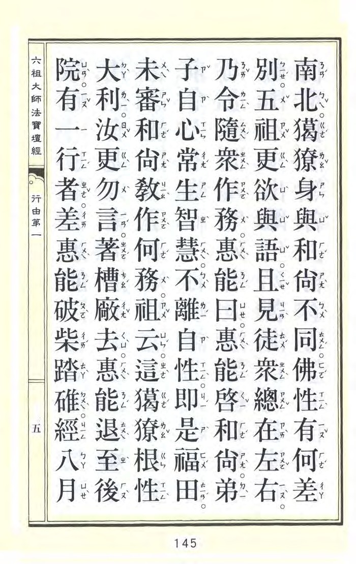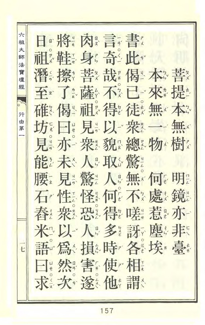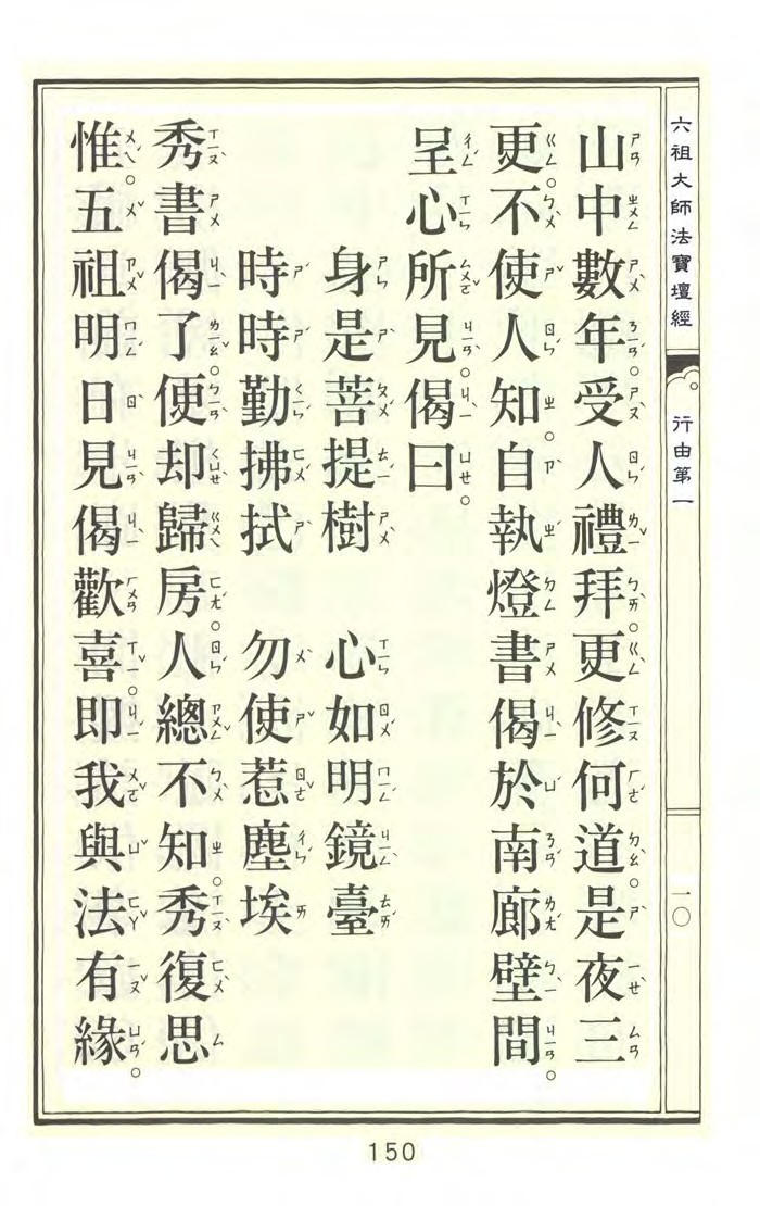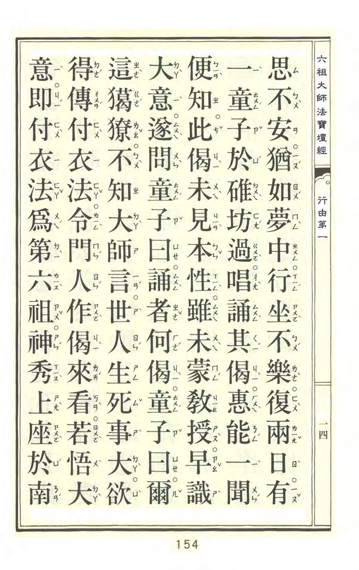 一復兩日,有一童子於碓坊過,唱誦其偈;惠能一聞,便知此偈未見本性,雖未蒙教授,早識大意。遂問童子曰:『誦者何偈?』童子曰:『爾這獦獦不知,大師言,世人生死事大,欲得傳付衣法,令門人作偈來看。若悟大意,即付衣法為第六祖。神秀上座,於南廊壁上,書無相偈,大師令人皆誦,依此偈修,免墮惡道;依此偈修,有大利益。』