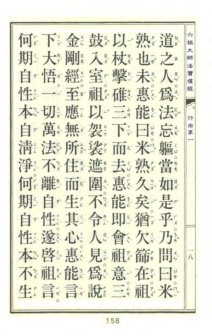 祖曰:『汝作此偈,未見本性,只到門外,未入門內。如此見解,覓無上菩提,了不可得;無上菩提,須得言下識自本心,凡自本性,不生不滅。於一切時中,念念自凡,萬法無滯,一其勿一其,萬境白如如。如如之心,印是其實,若如是見,即是無上菩提之自性也。汝且去,一兩日思惟,更作一偈,將來吾看;汝偈若入得門,付汝衣法。』