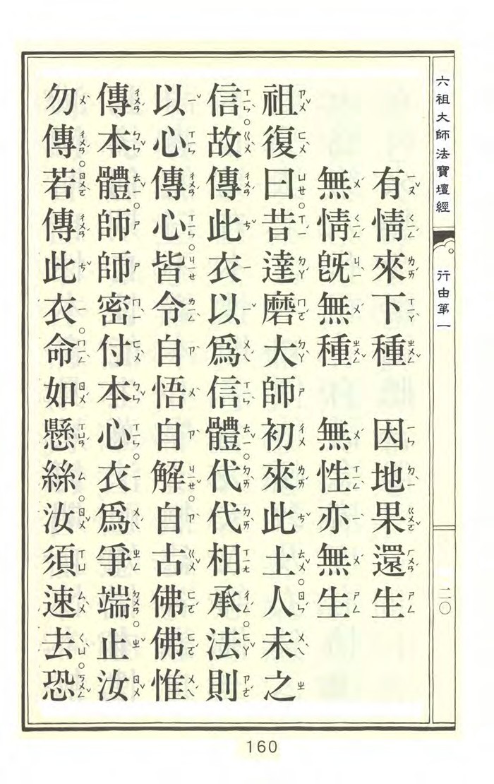 祖復曰:『昔達摩大師,初來此土,人未之信,故傳此衣,以為信體,代代相承。法則以心傳心,皆令自悟自解。自古,佛佛惟傳本體,師師密付本心;衣為爭端,止汝勿傳。若傳此衣,命如懸絲,汝須速去,恐人害汝。』