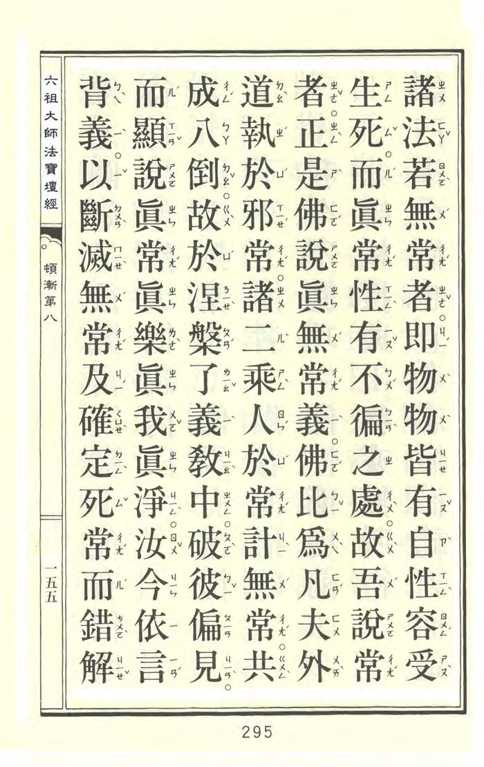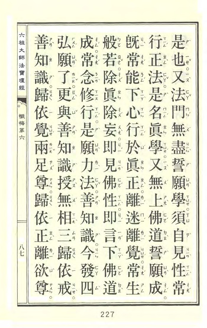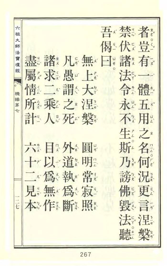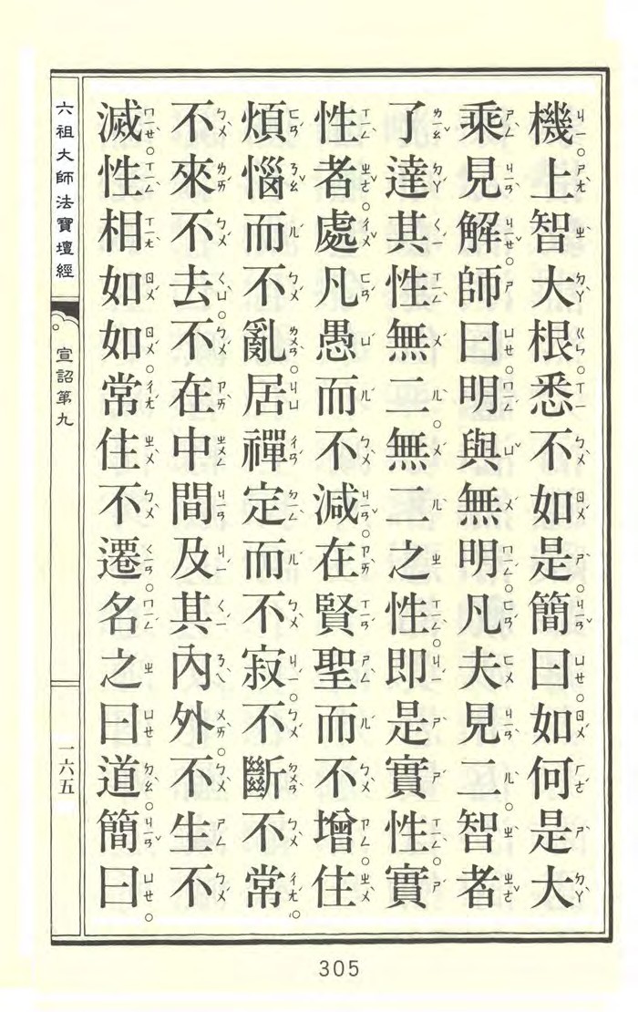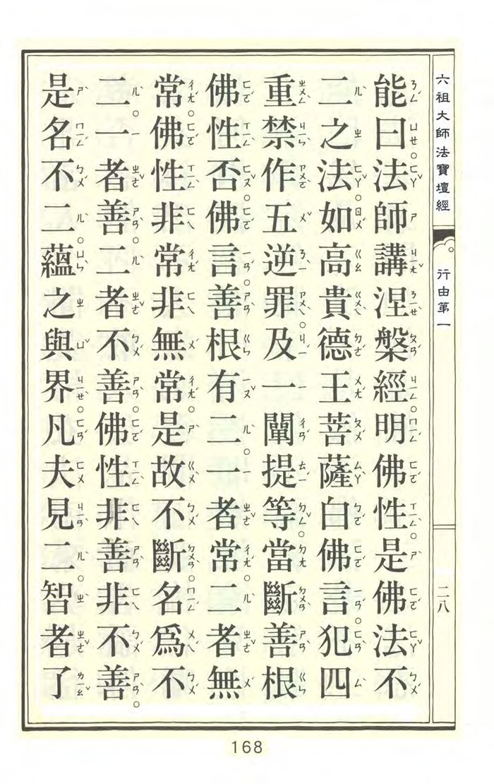 惠能曰:『法師講涅槃經,明佛性是佛法不二之法。如高貴德王菩薩白佛言:『犯四重禁,作五逆罪,及一闡提等,當斷善根佛性否?』佛言:「善根有二:一者常,二者無常;佛性非常非無常,是故不斷,名為不二。」一者善,二者不善;佛性非善非不善,是名不二。蘊之與界,凡夫見二,智者了達其性無二;無二之性,即是佛性。』