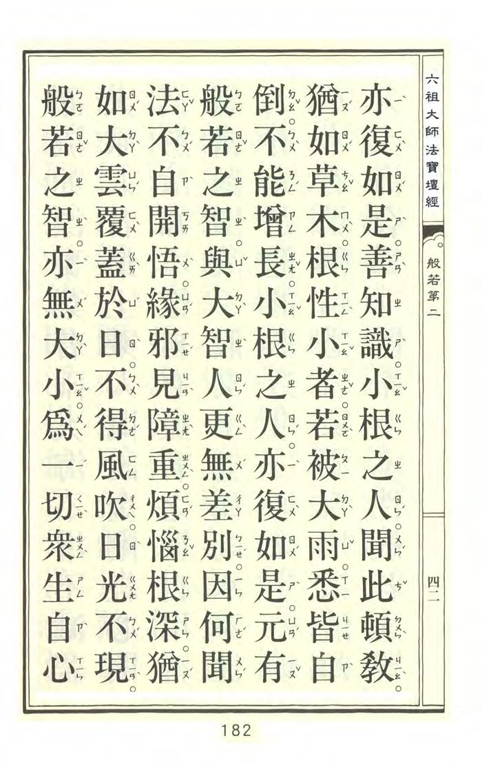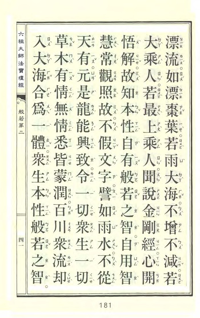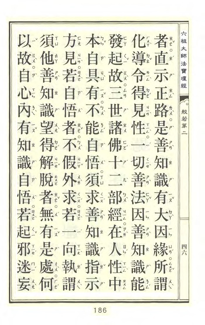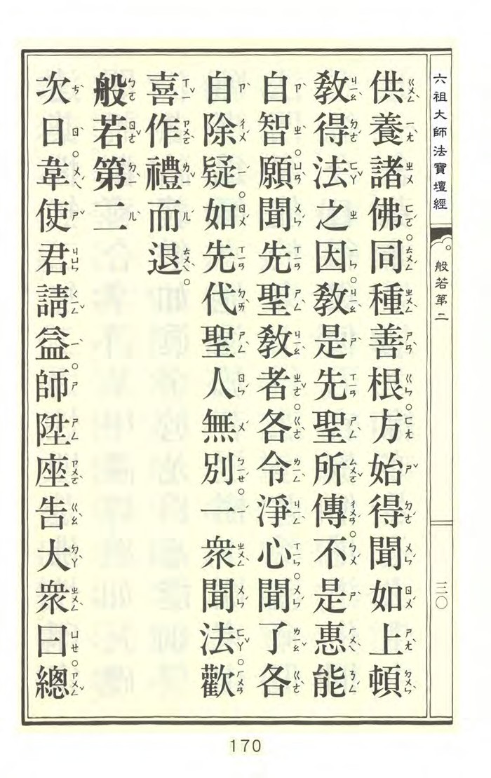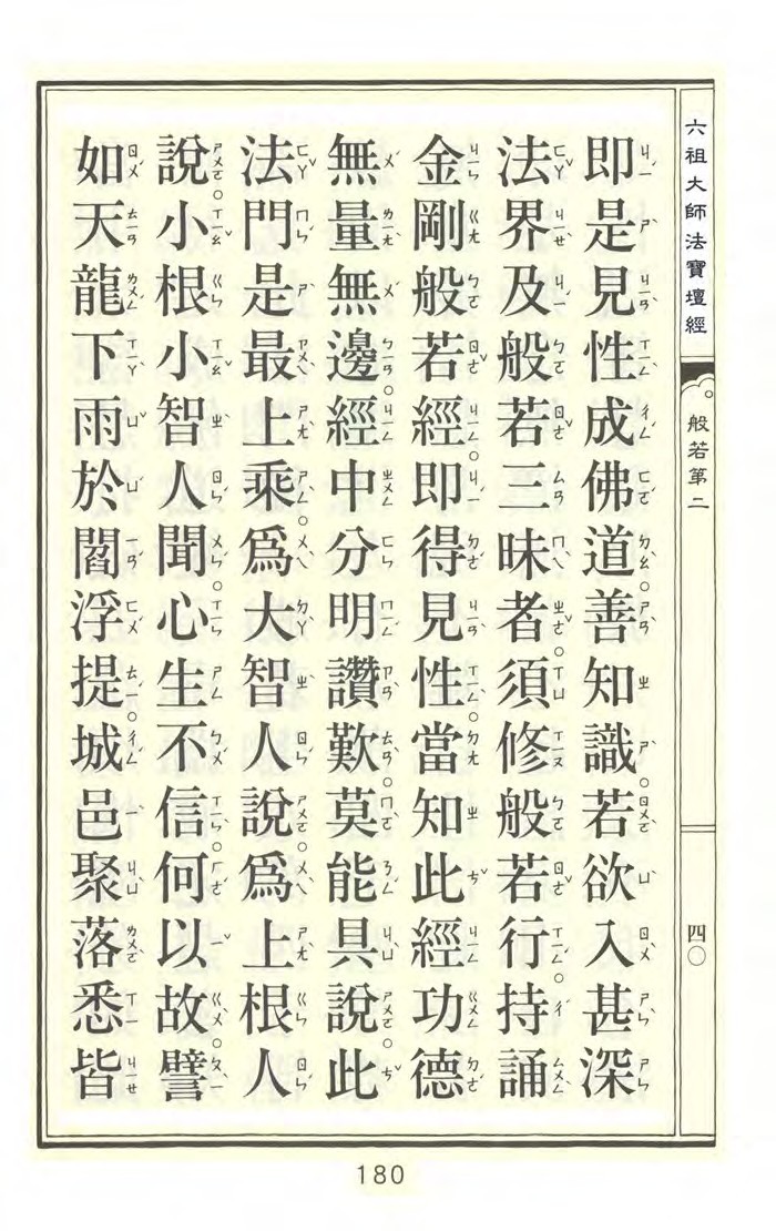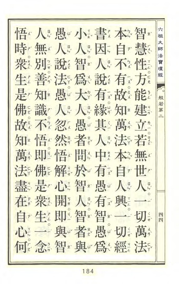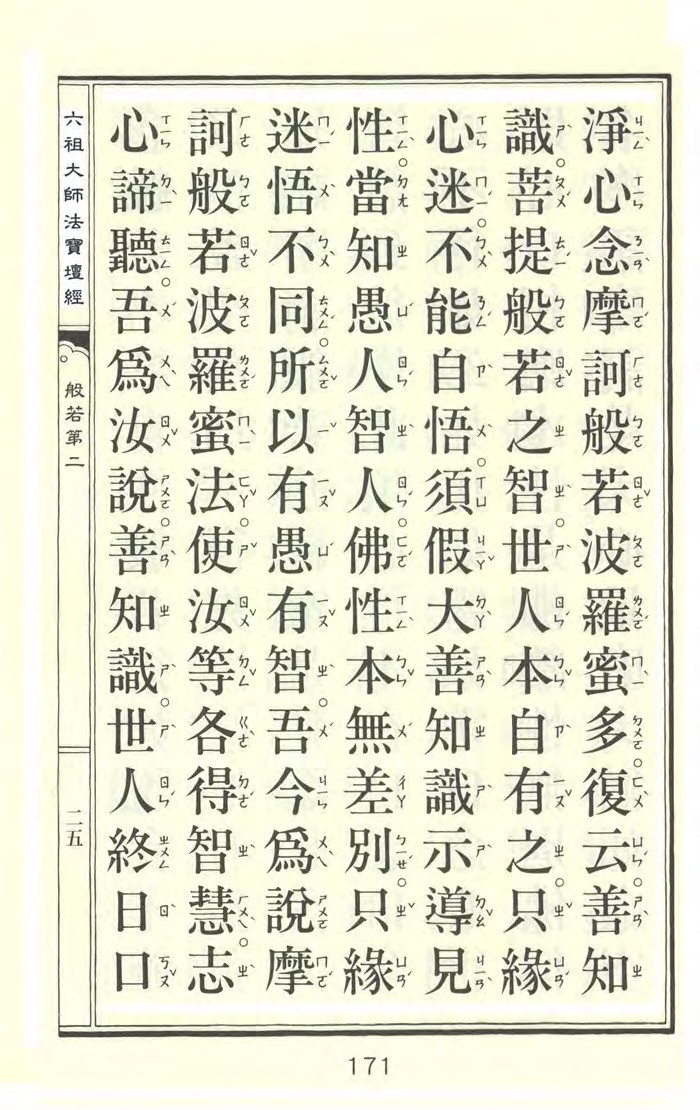次日,韋使君請益。師陞坐,告大眾曰:「總淨心念摩訶般若波羅蜜多。」復云:「善知識,菩提般若之智,世人本自有之,只緣心迷,不能自悟,須假大善知識,示導見性。當知愚人智人,佛性本無差別,只緣迷悟不同,所以有愚有智。吾今為說「摩訶般若波羅蜜」法,使汝等各得智慧。志心諦聽,吾為汝說。
