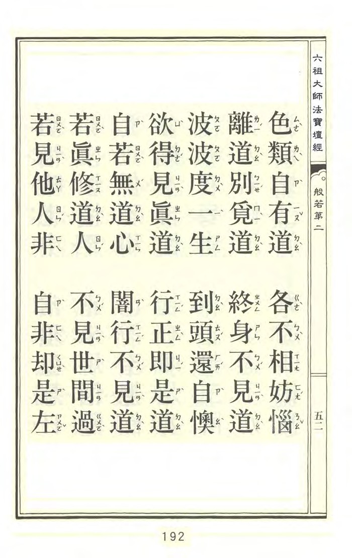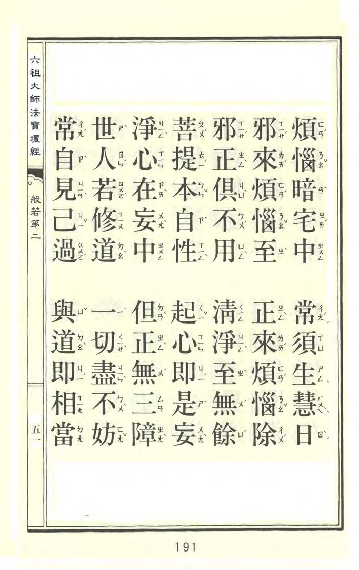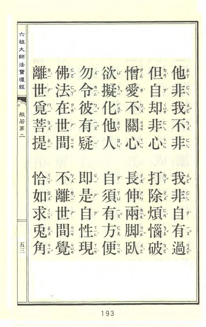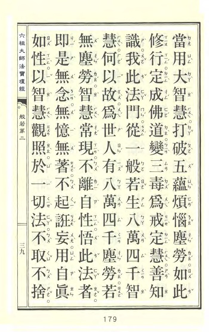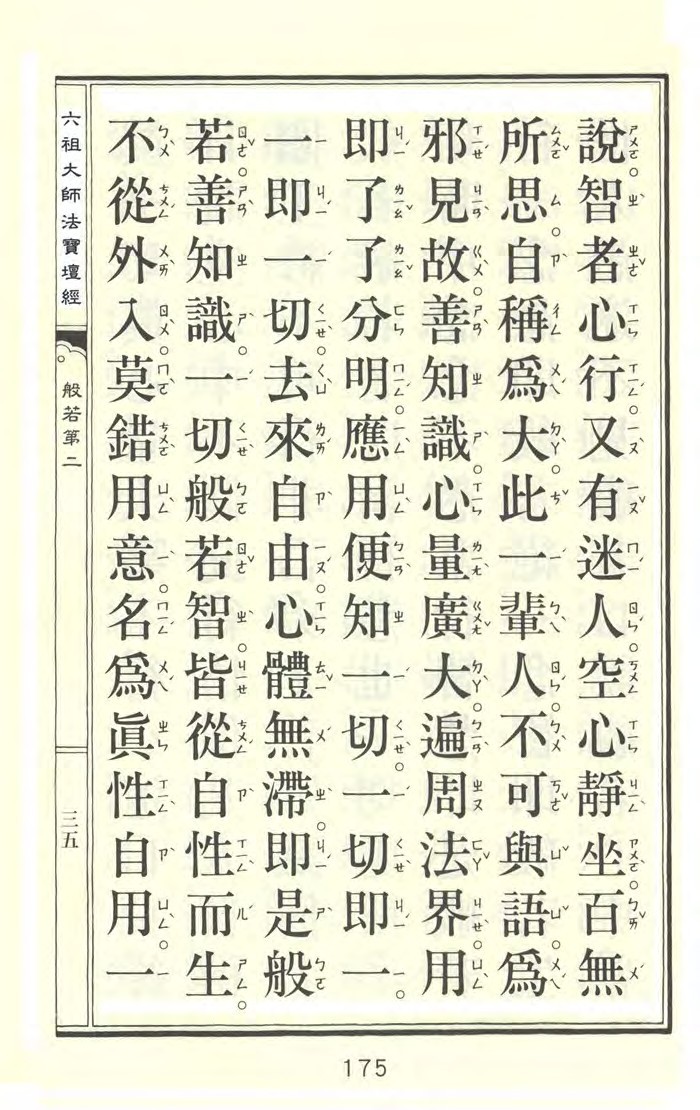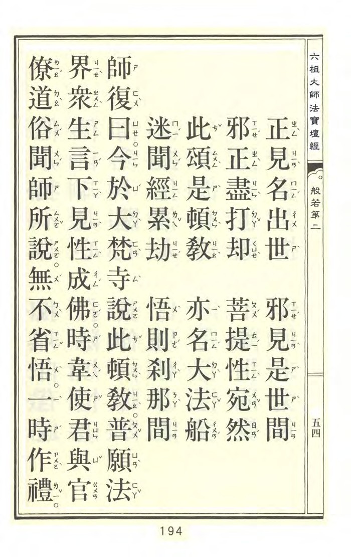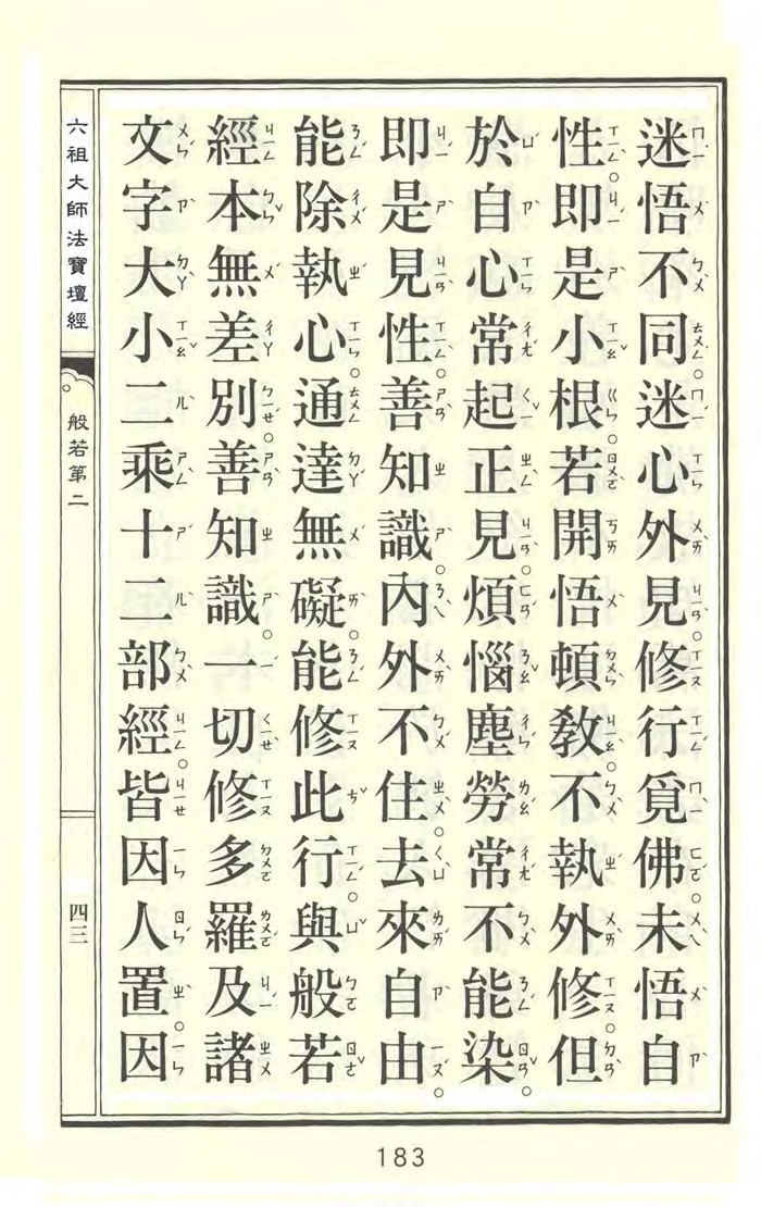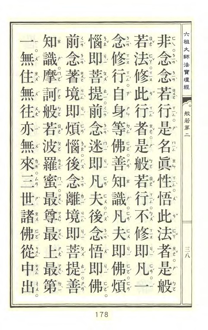 次日,韋使君請益。師陞坐,告大眾曰:「總淨心念摩訶般若波羅蜜多。」復云:「善知識,菩提般若之智,世人本自有之,只緣心迷,不能自悟,須假大善知識,示導見性。當知愚人智人,佛性本無差別,只緣迷悟不同,所以有愚有智。吾今為說「摩訶般若波羅蜜」法,使汝等各得智慧。志心諦聽,吾為汝說。