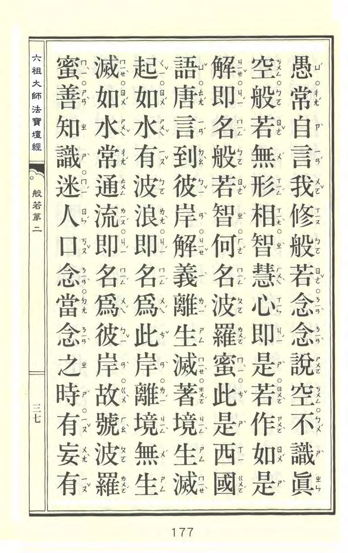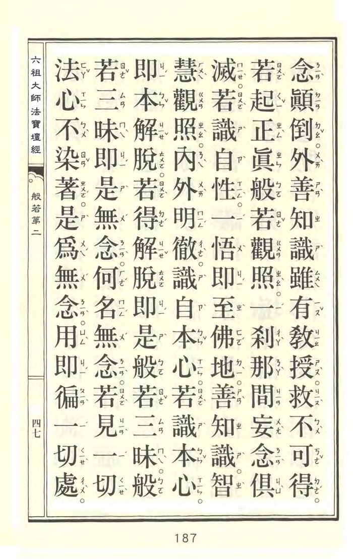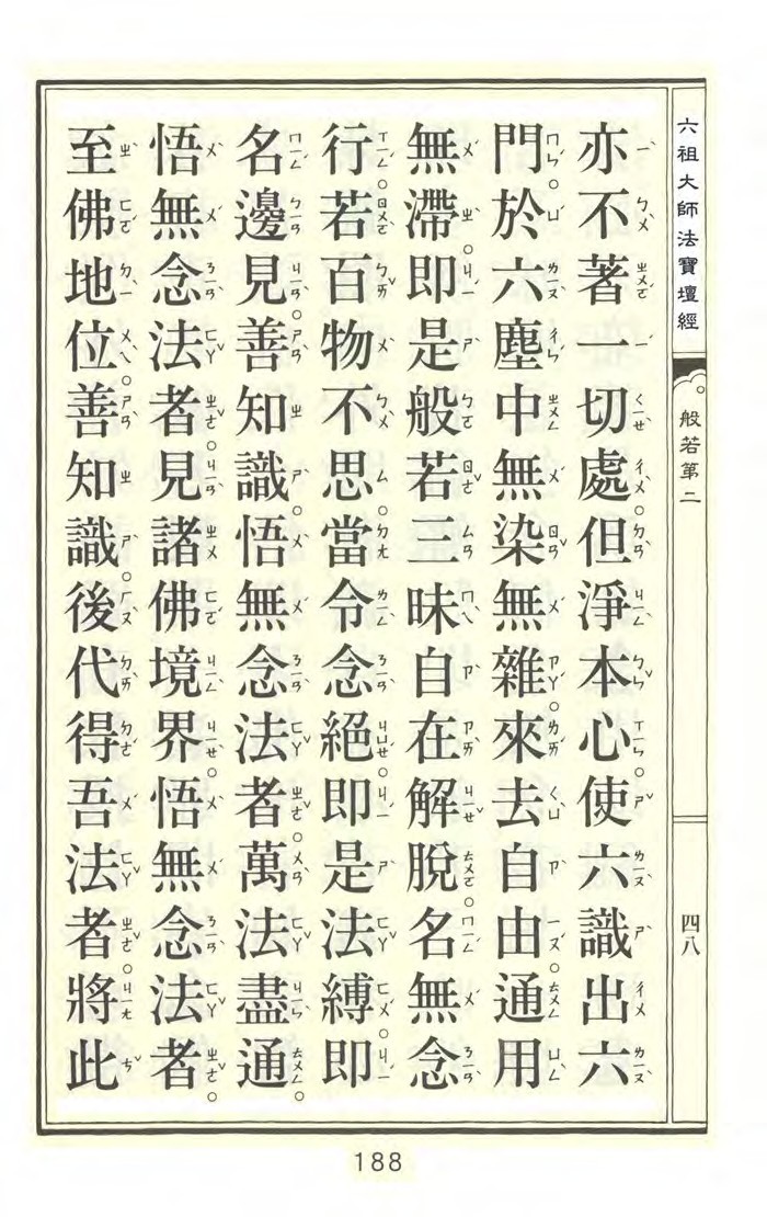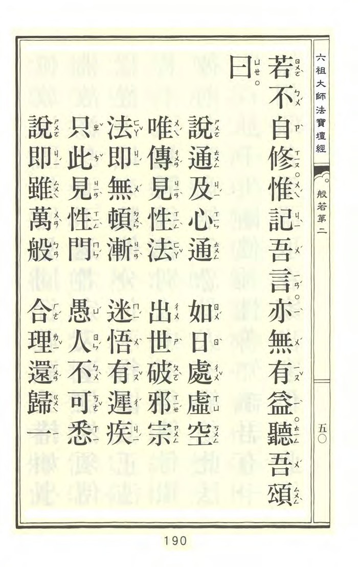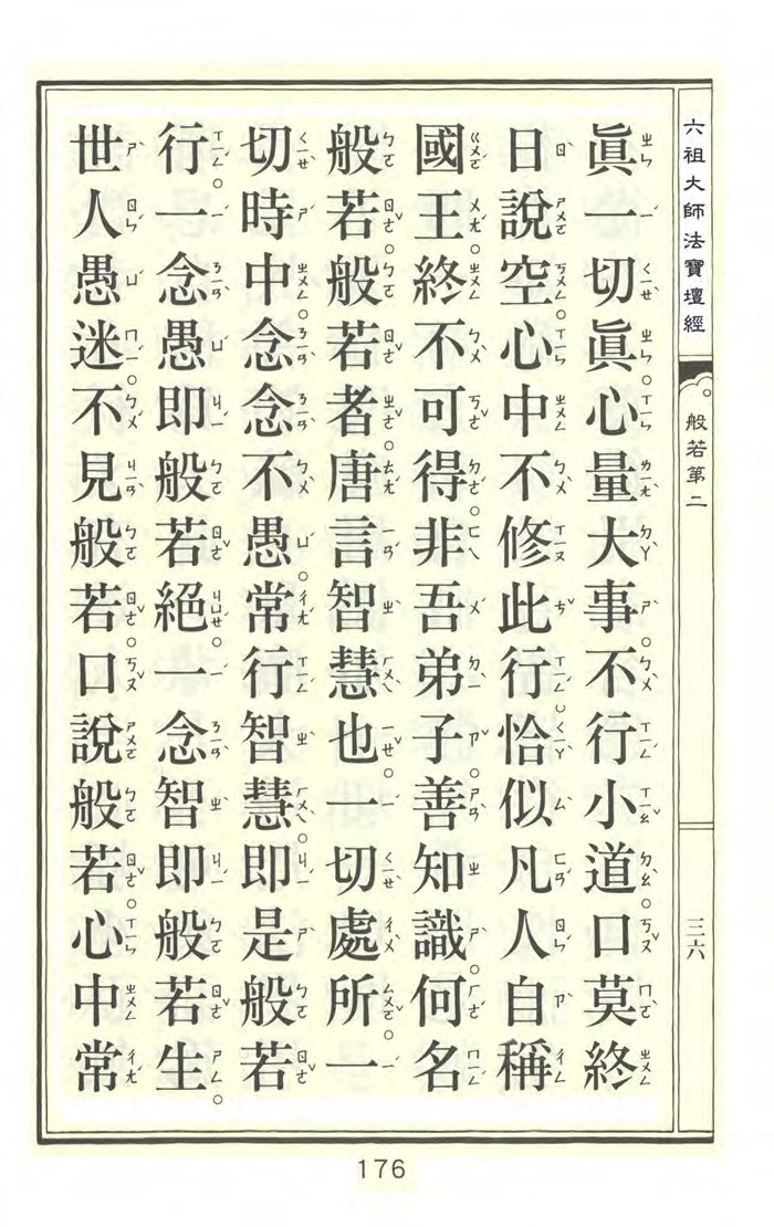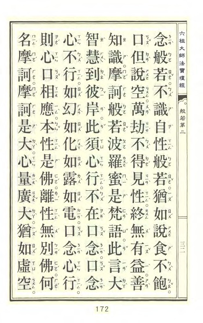善知識,世人終日口念般若,不識自性般若;猶如說食不飽,口但說空,萬劫不得見性,終無有益。善知識,「摩訶般若波羅蜜」是梵語,此言大智慧到彼岸。此須心行,不在口念。口念心不行,如幻如化,如露如電。口念心行,則心口相應,本性是佛,離性無別佛。