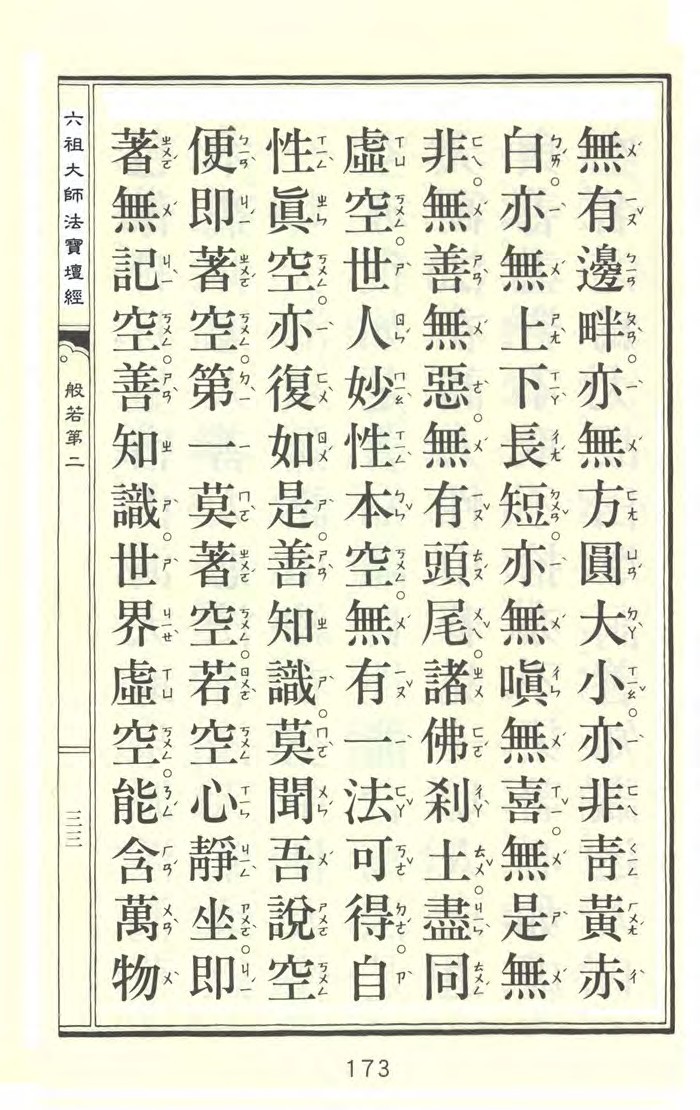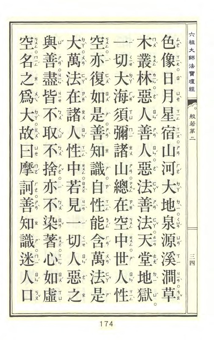 善知識,莫聞吾說空,便即著空。第一莫著空,若空心靜坐,即著無記空。善知識,世界虛空,能含萬物色像。日月星宿,山河大地、泉源溪澗、草木叢林、惡人善人、惡法善法、天堂地獄、一切大海、須瀰諸山、總在空中;世人性空,亦復如是。