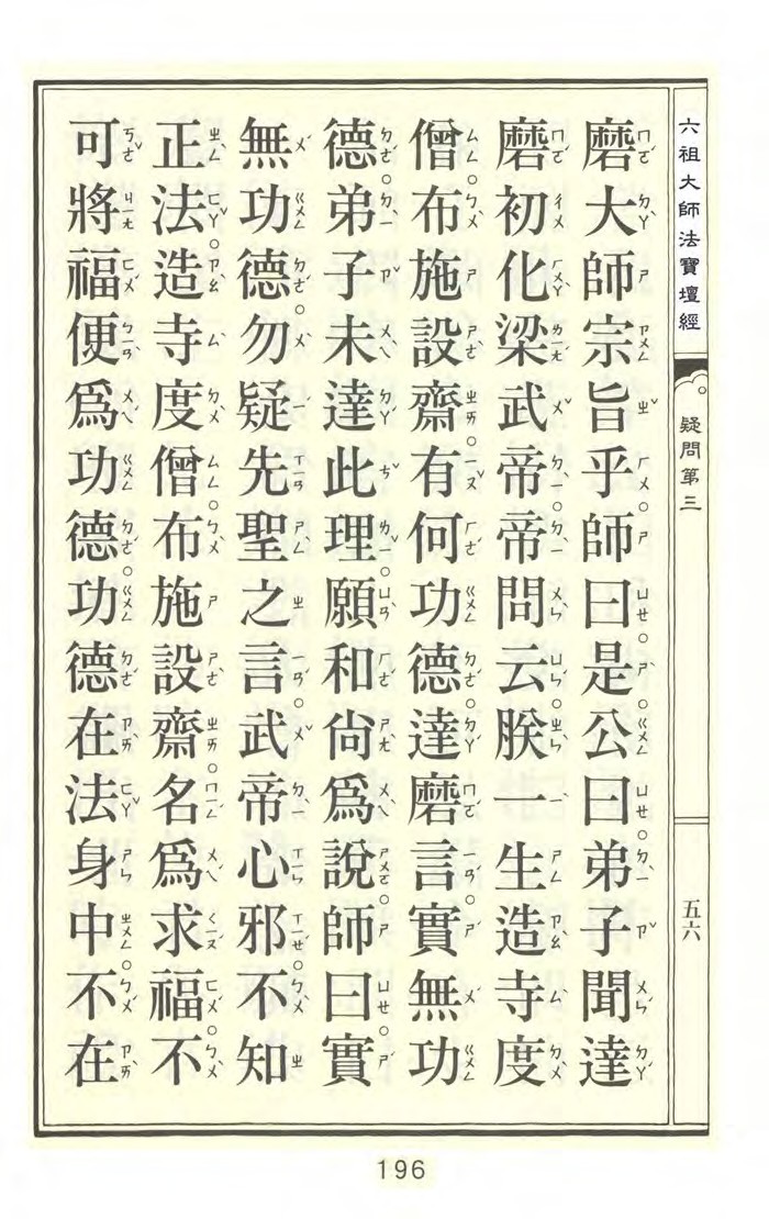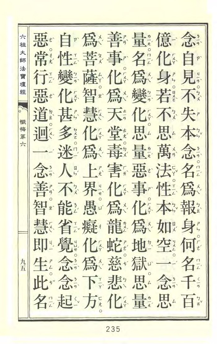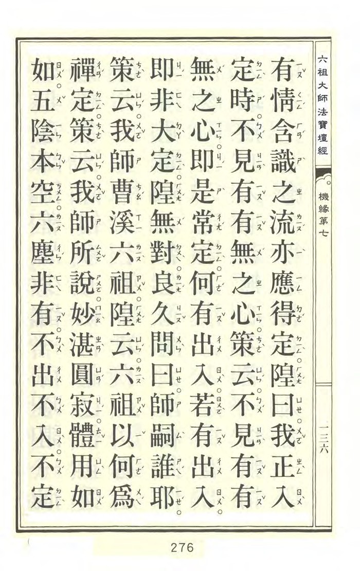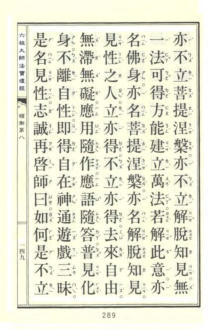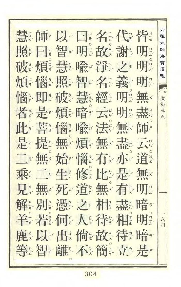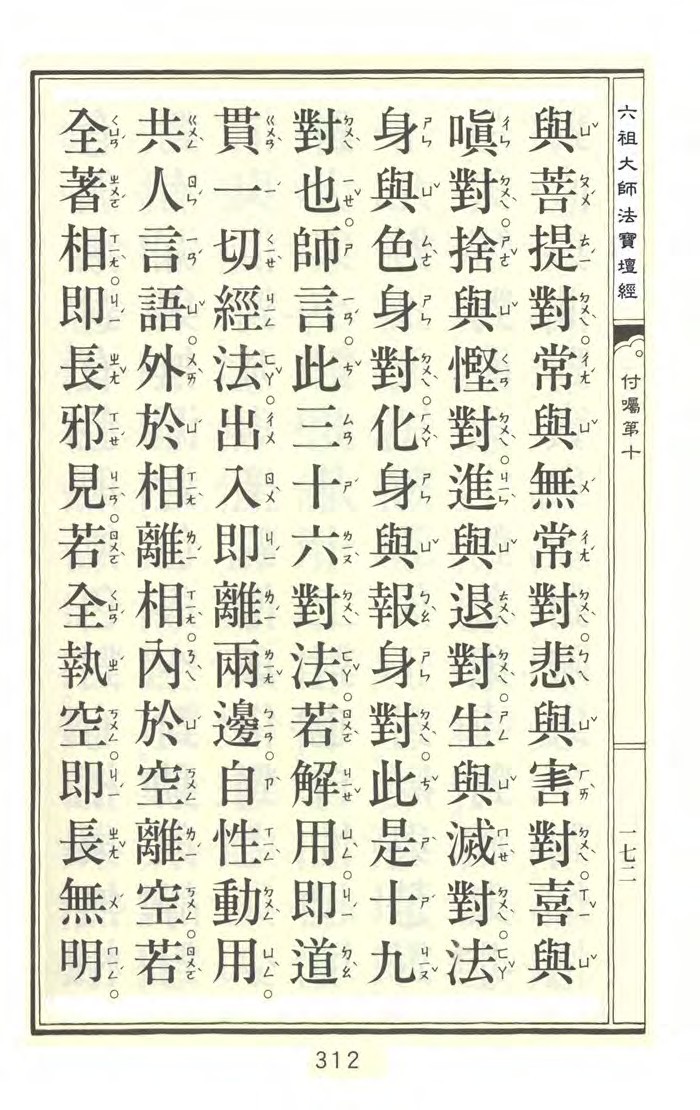 師言:「此三十六對法若解用,即通貫一切經法,出入即離兩邊,自性動用,共人言語,外於相離相,內於空離空,若全著相。即長邪見,若全執空,即長無明。執空之人,有謗經直言不用文字,即云不用文字,人亦不合語言,只此語言,便是文字之相。又云直道不立文字,即此不立兩字,亦是文字,見人所說,便即謗他言著文字。汝等須知,自迷猶可,又謗佛經,不要謗經,罪障無數。若著相於外,而作法求真,或廣立道場,說有無之過患,如是之人,累劫不可見性,但聽依法修行,又莫百物不思,而於道性窒礙。若聽說不修,令人反生邪念,但依法修行,無住相法施。汝等若悟,依此說,依此用,依此行,依此作,即不失本宗。若有人問汝義,問有,將無對;問無,將有對;問凡,以聖對;問聖,以凡對。二道相因,生中道義,汝一問一對,餘問一依此作,即不失理也。設有人問:『何名為暗?』答云:『明是因,暗是緣,明沒則暗,以明顯晦,以暗顯明,來去相因,成中道義。餘問,悉皆如此。』汝等於後傳法,依此轉相教授,勿失宗旨。」