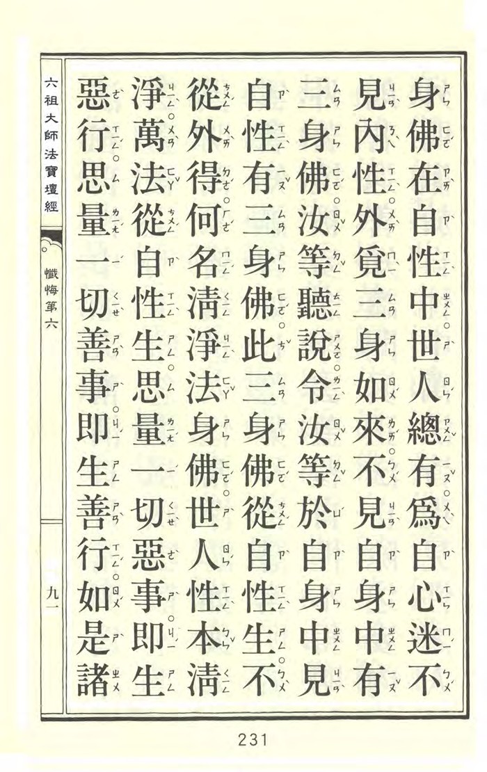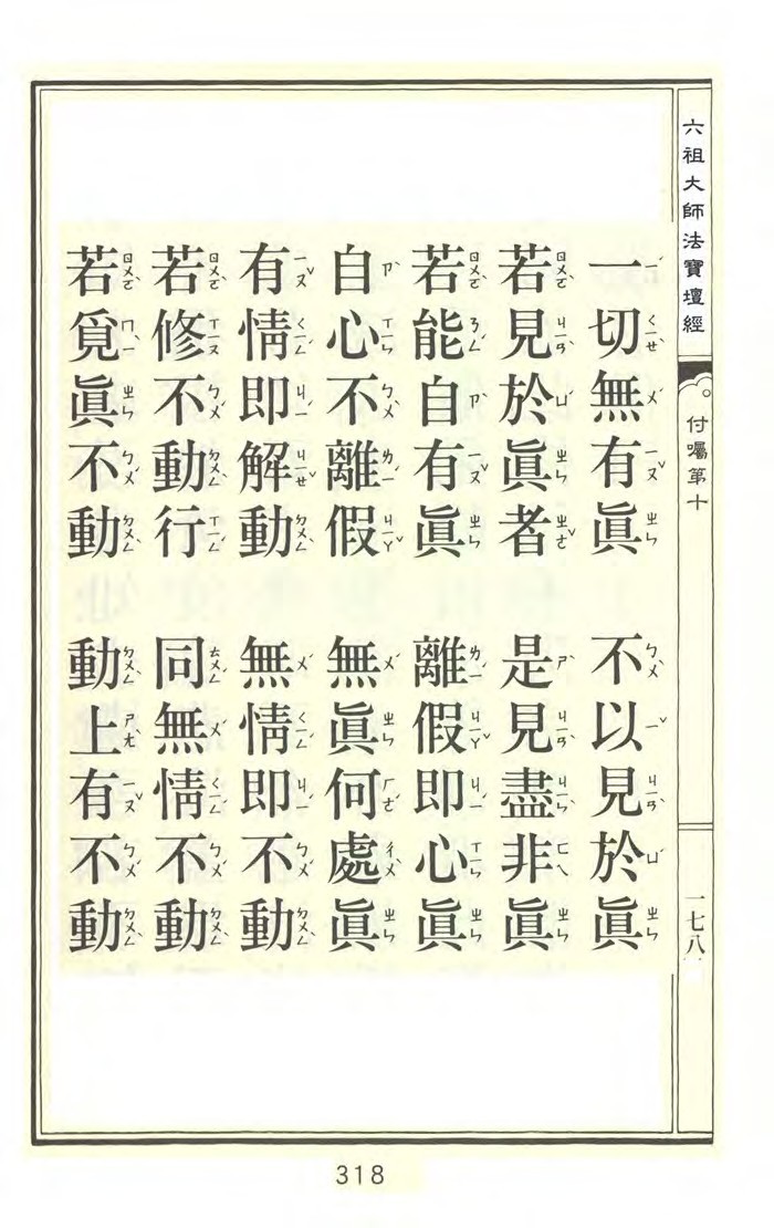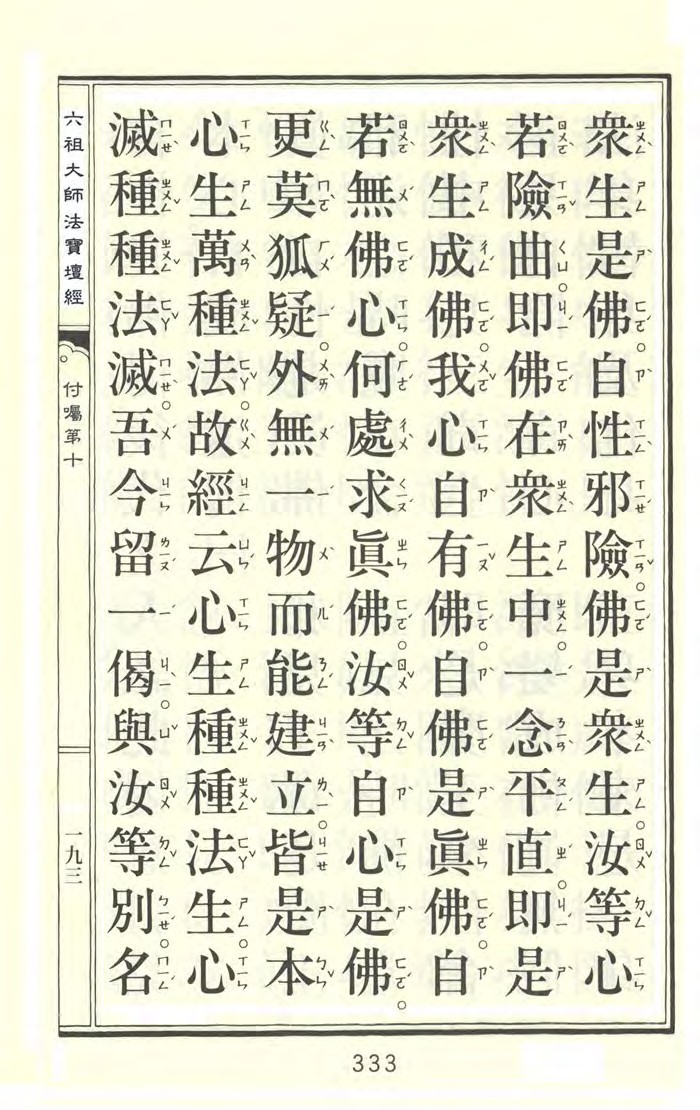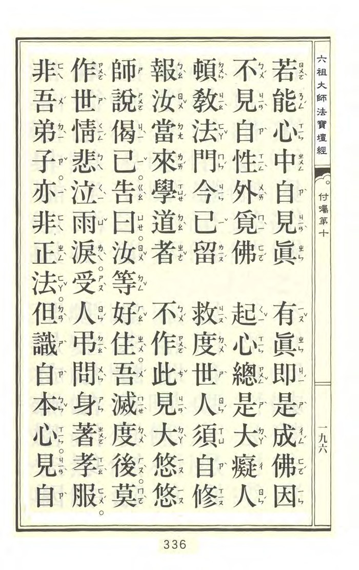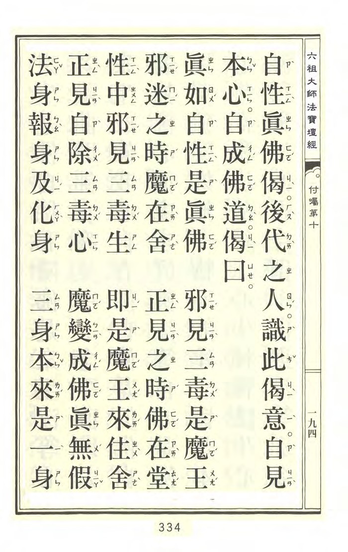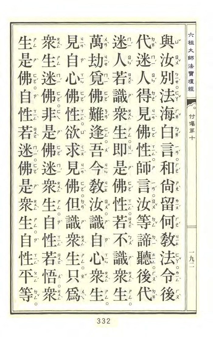 師言:「汝等諦聽,後代迷人,若識眾生,即是佛性;若不識眾生,萬劫覓佛難逢。吾今教汝識自心眾生,見自心佛性。欲求見佛,但識眾生;只為眾生迷佛,非是佛迷眾生。自性若悟,眾生是佛;自性若迷,佛是眾生。自性平等,眾生是佛;自性邪險,佛是眾生。汝等心若險曲,即佛在眾生中,一念平直,即是眾生成佛。我心自有佛,自佛是真佛,自若無佛心,何處求真佛?汝等自心是佛,更莫狐疑,外無一物而能建立,皆是本心生萬種法。故經云:『心生,種種法生;心滅,種種法滅。』吾今留一偈,與汝等別,名『自性真佛偈』。後代之人,識此偈意,自見本心,自成佛道。偈曰: