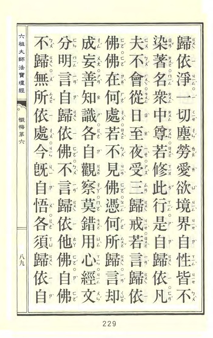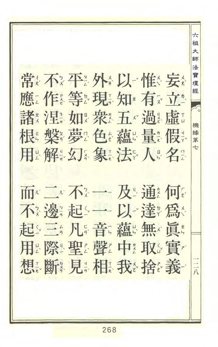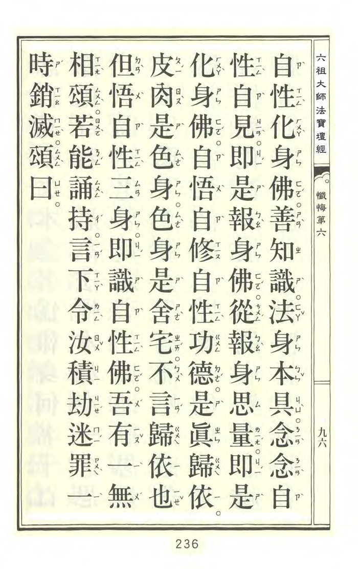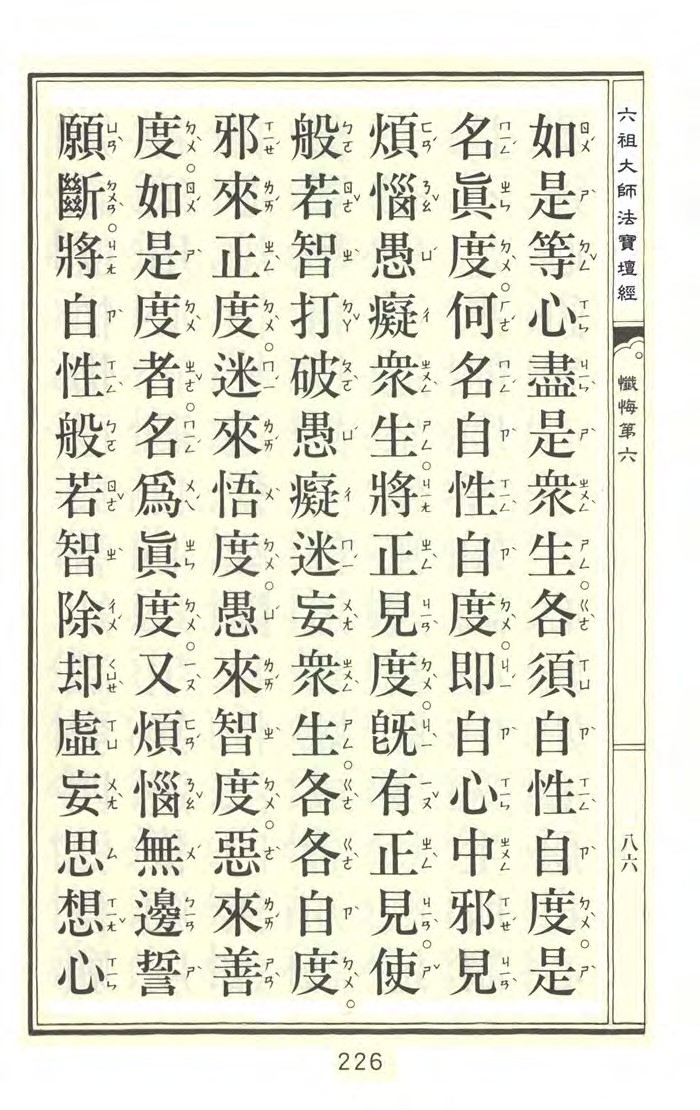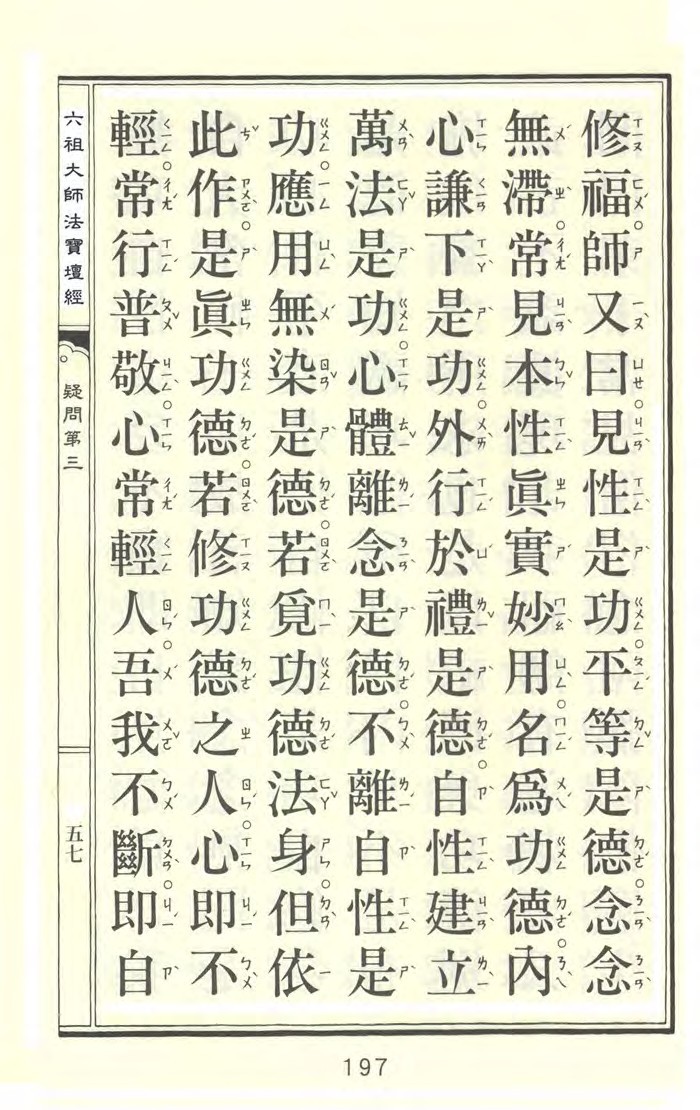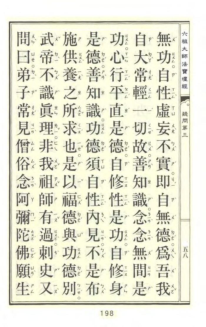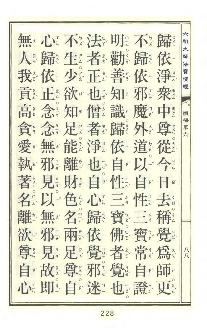 師言:「汝等諦聽,後代迷人,若識眾生,即是佛性;若不識眾生,萬劫覓佛難逢。吾今教汝識自心眾生,見自心佛性。欲求見佛,但識眾生;只為眾生迷佛,非是佛迷眾生。自性若悟,眾生是佛;自性若迷,佛是眾生。自性平等,眾生是佛;自性邪險,佛是眾生。汝等心若險曲,即佛在眾生中,一念平直,即是眾生成佛。我心自有佛,自佛是真佛,自若無佛心,何處求真佛?汝等自心是佛,更莫狐疑,外無一物而能建立,皆是本心生萬種法。故經云:『心生,種種法生;心滅,種種法滅。』吾今留一偈,與汝等別,名『自性真佛偈』。後代之人,識此偈意,自見本心,自成佛道。偈曰: