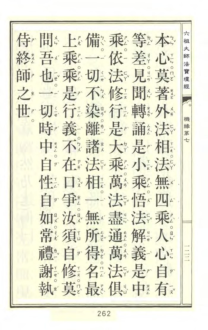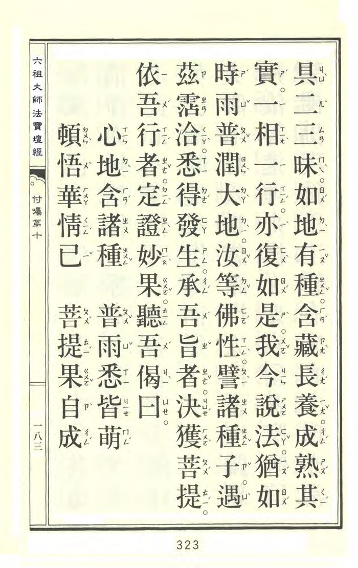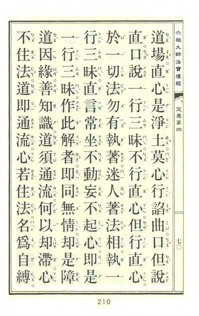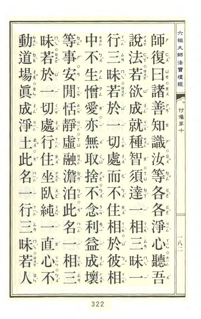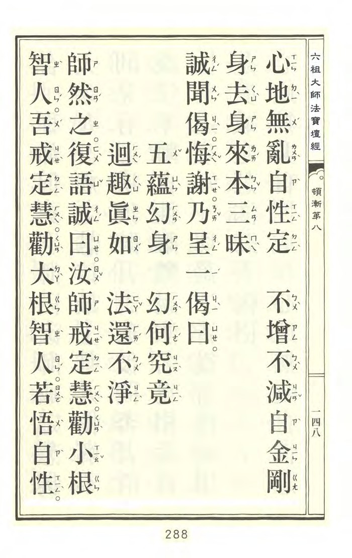 師復曰:「汝等若欲成就種智,須達一相三昧,一行三昧。若於一切處而不住相,於彼相中不生憎愛,亦無取捨,不念利益成壞等事,安閑恬靜,虛融澹泊,此名一相三昧。若於一切處行住坐臥,純一直心不動道場,其成淨土,此名一行三昧。若人具二三昧,如地有種,今藏長養,成熟其實,一相一行,亦復如是。我今說法,猶如時雨,普潤大地,汝等佛性,譬諸種子,遇茲霑洽,悉皆發生。承吾旨者,決獲菩提;依吾行者,定證妙果。聽吾偈曰: