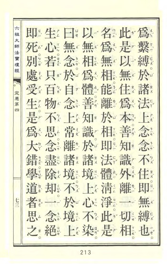 師說偈已,曰:「其法無二,其心亦然,其道清淨,亦無諸相。汝等慎勿觀靜,及空其心;此心本淨,無可取捨,各自努力,隨緣好去。」