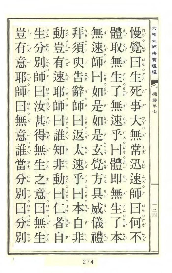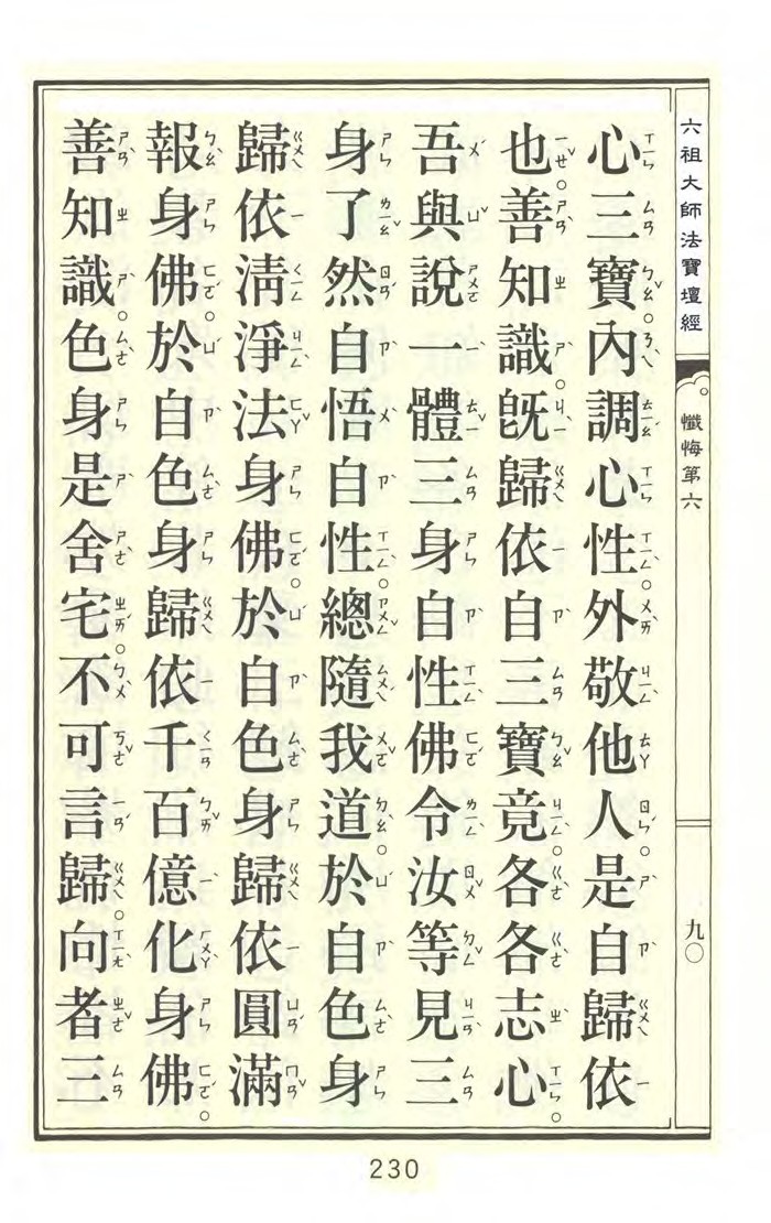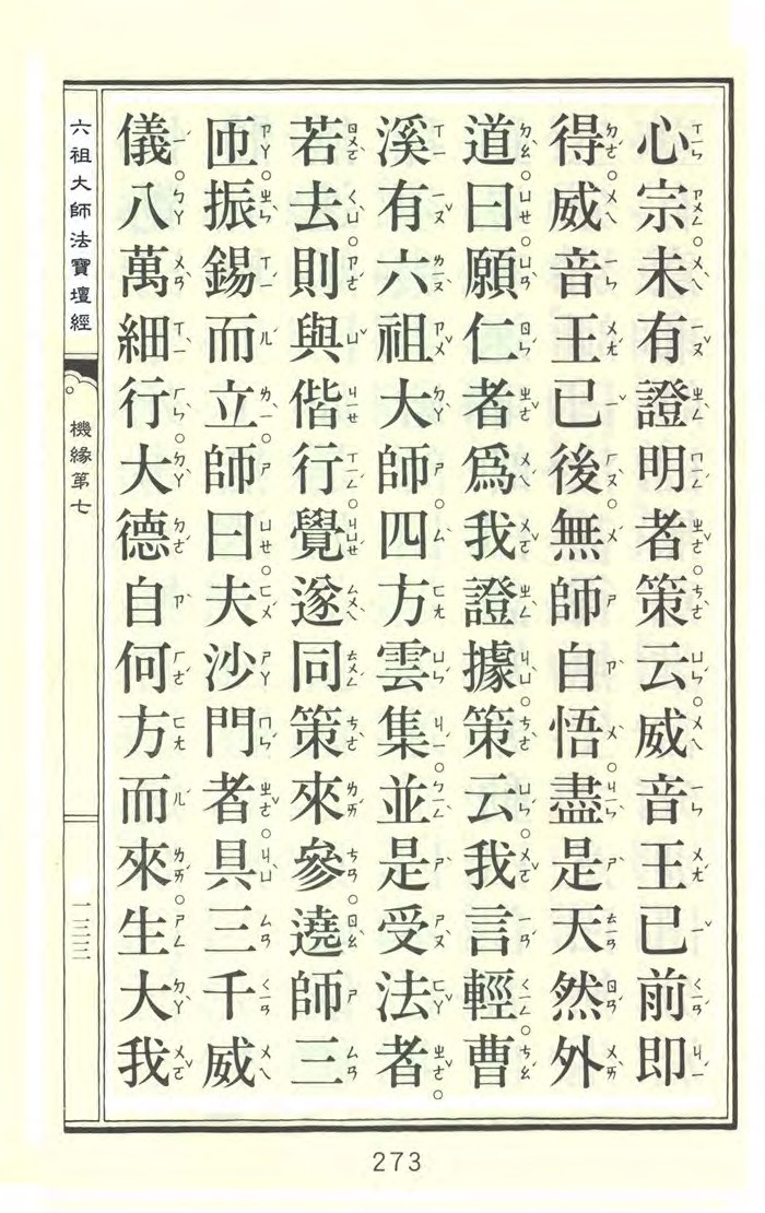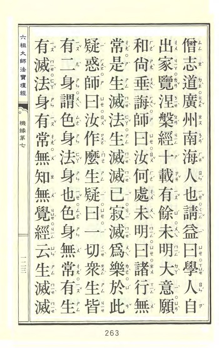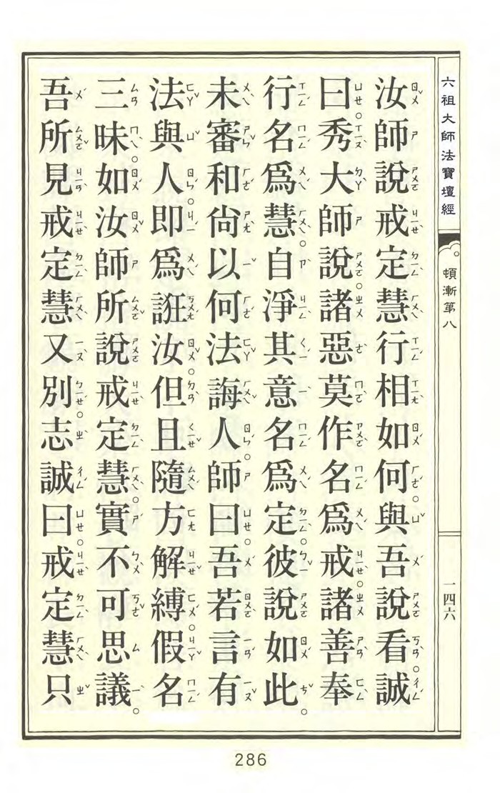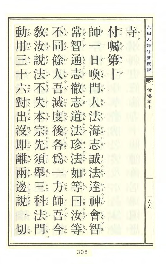 師,一日喚門人法海、志誠、法達、神會、智常、智通、志徹、志道、法珍、法如等曰:「汝等不同餘人,吾滅度後,各為一方師。吾今教汝說法,不失本宗,先須舉三科法門,動用三十六對,出沒即離兩邊,說一切法莫離自性。忽有人問汝法,出語盡雙,皆取對法,來去相因,究竟三法盡除,更無去處。」