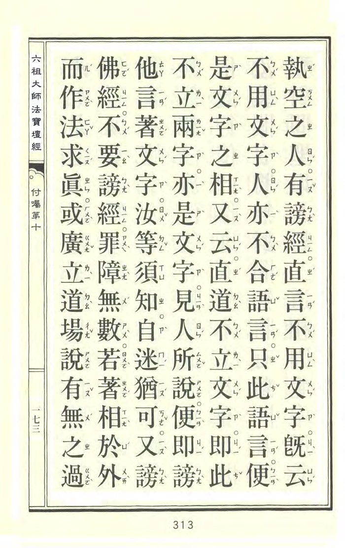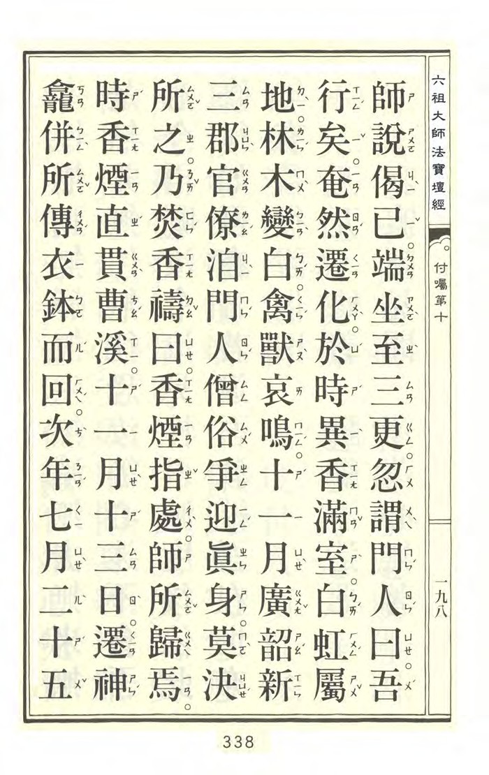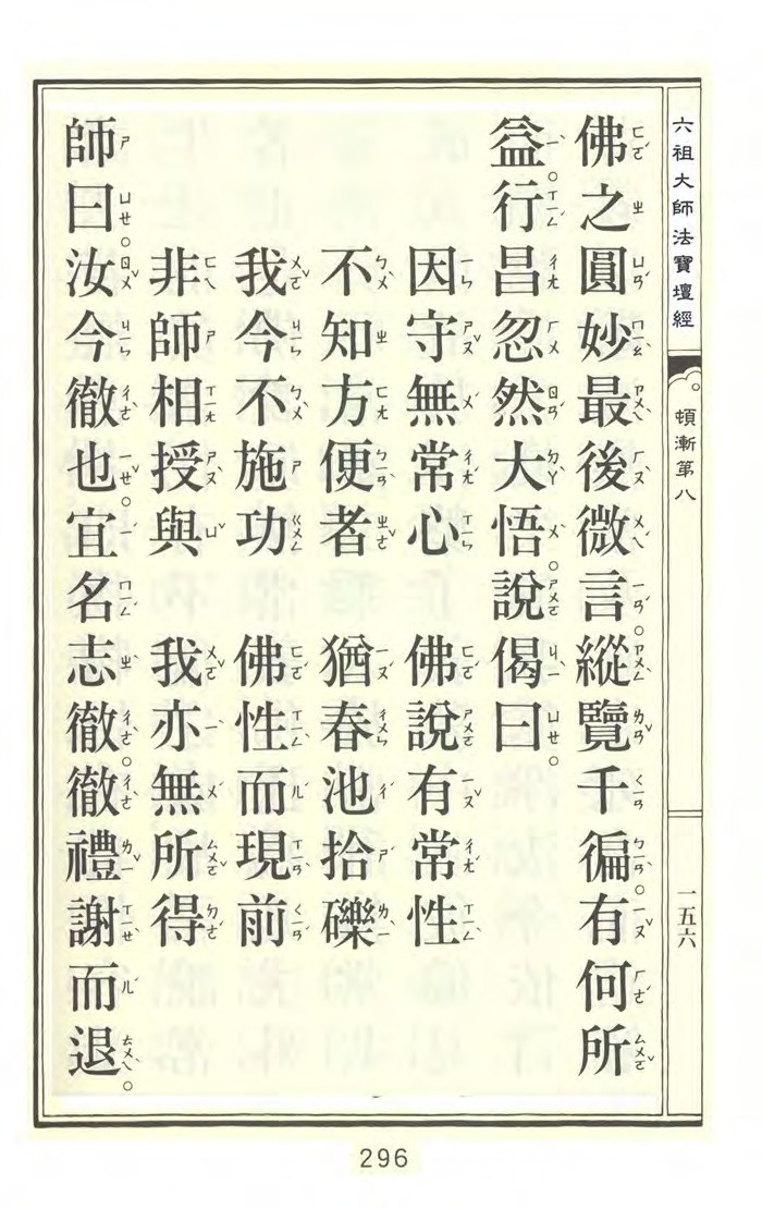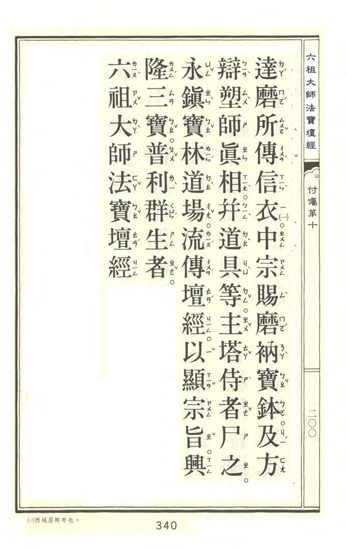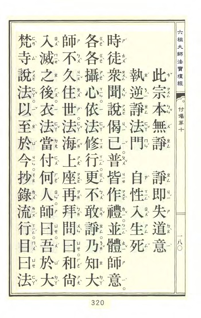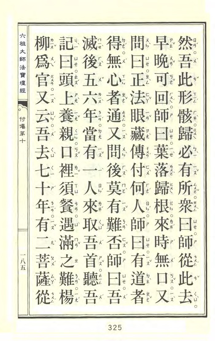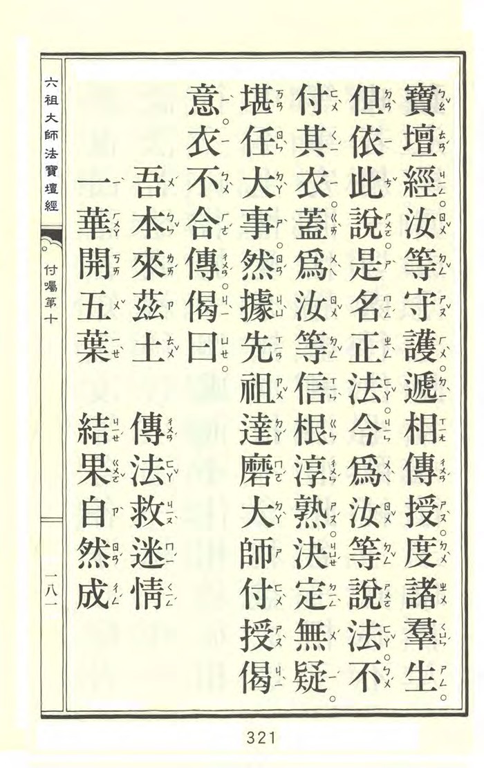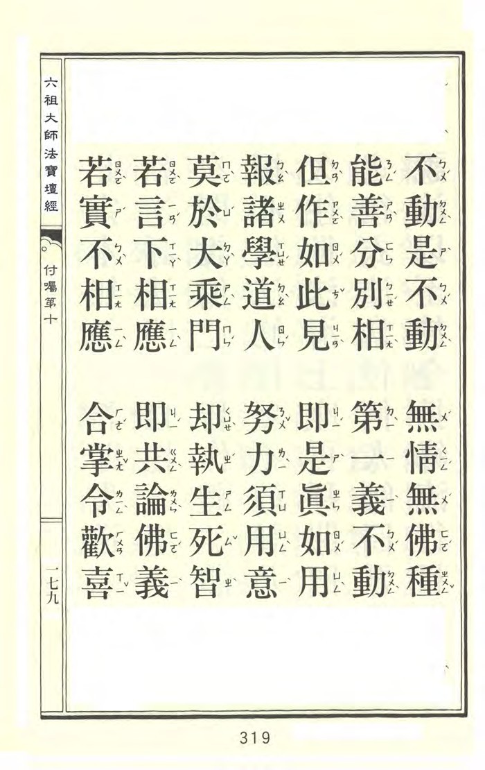 師曰:「吾於大梵寺說法以至于今,抄錄流行,目曰:『法寶壇經』,汝等守護,遞相傳授,度諸群生,但依此說,是名正法。今為汝等說法,不付其衣,蓋為汝等信根淳熟,決定無疑堪任大事。然據先祖達摩大師付授偈意,衣不合傳。侷曰: