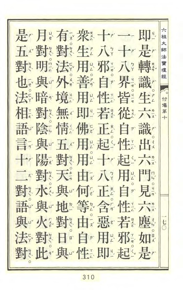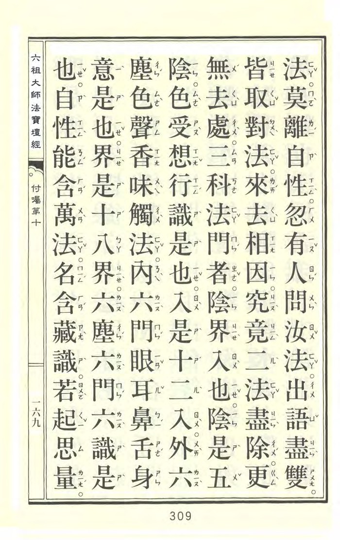 「三科法門者,陰界入也。陰是五陰:色受想行識是也。入是十二入,外六塵:色、聲、香、味、觸、法;內六門:眼、耳、鼻、舌、身、意是也。界是十八界:六塵、六門、六識是也。自性能含萬法,名含藏識;若起思量,即是轉識。生六識,出六門,見六塵,如是一十八界,皆從自性起用。自性若邪,起十八邪;自性若正,走十八正。含惡用即眾生用,善用即佛用。用由何等,由自性有。」