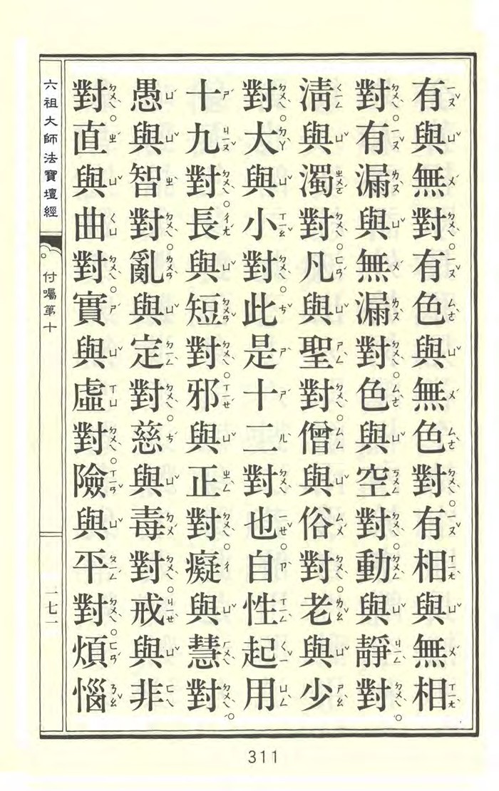 「對法外境,無情五對:天與地對,日與月對,明與暗對,陰與陽對,水與火對,此是五對也。法相語言十二對:語與法對,有與無對,有色與無色對,有相與無相對,有漏與無漏對,色與空對,動與靜對,清與濁對,凡與聖對,僧與俗對,老與少對,大與小對,此是十二對也。自性起用十九對:長與短對,邪與正對,癡與慧對,愚與智對,亂與定對,慈與毒對,戒與非對,直與曲對,實與虛對,險與平對,煩惱與菩提對,常與無常對,悲與害對,喜與嗔對,捨與慳對,進與退對,生與滅對,法身與色身對,化身與報身對,此是十九對也。」