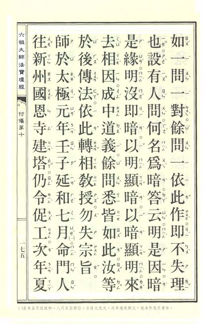 師曰:「吾滅後五六年,當有一人,欲取吾首。聽吾讖曰:『頭上養親,口裡須餈,遇滿之難,楊柳為官。』」大師,先天二年癸丑歲八月初三日-是年十二月,改元開元-於國恩寺齋罷,謂諸徒眾曰:「汝等各依位坐,吾與汝別。」