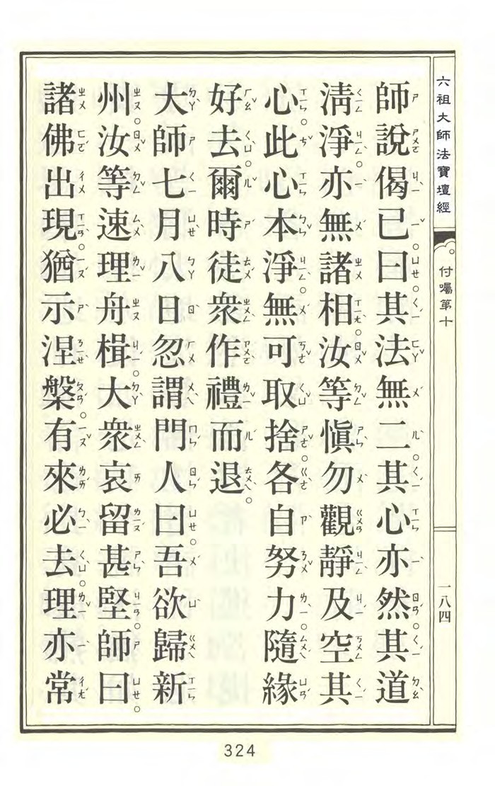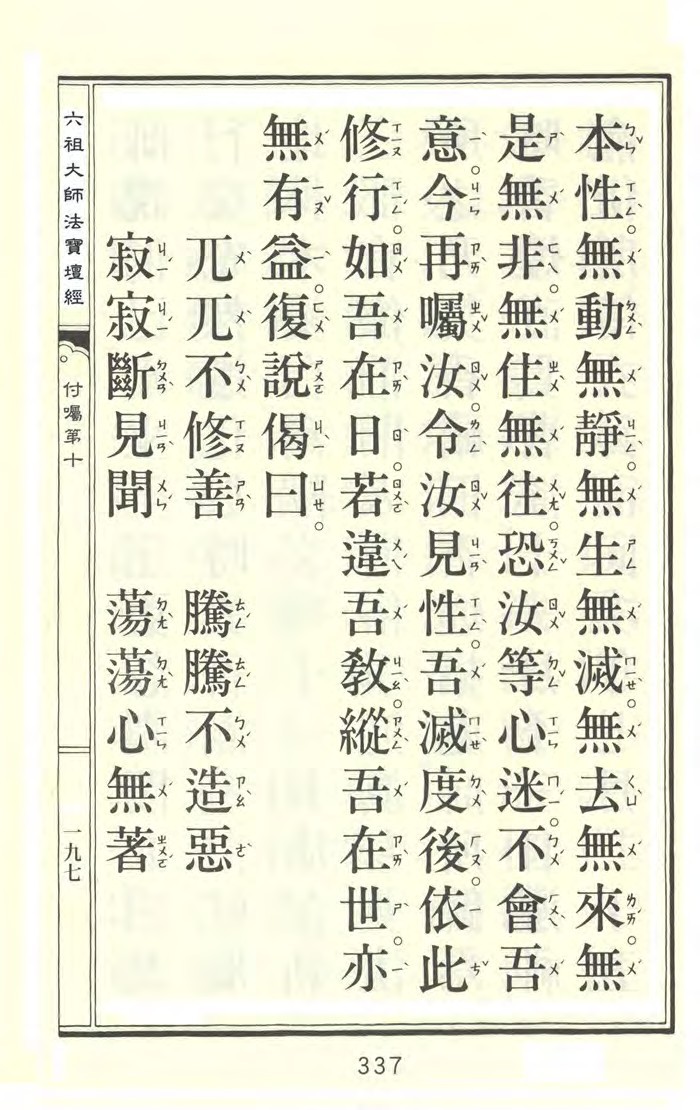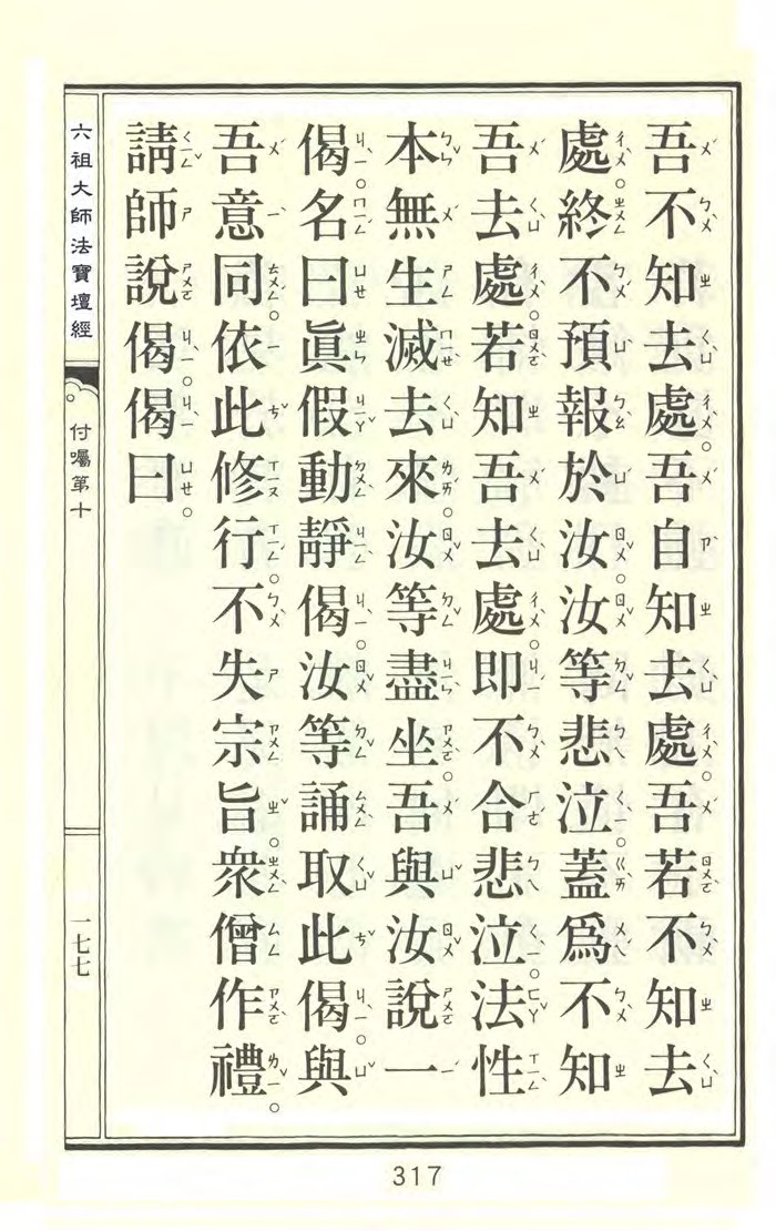 師說偈已,告曰:「汝等好住,吾滅度後,莫作世情悲泣雨淚,受人弔問。身著孝服,非吾弟子,亦非正法。但識自本心,見自本性,無動無靜,無生無滅,無去無來,無是無非,無住無往。恐汝等心迷,不會吾意,今再囑汝,令汝見性。吾滅度後,依此修行,如吾在日;若違吾教,縱吾在世,亦無有益。」