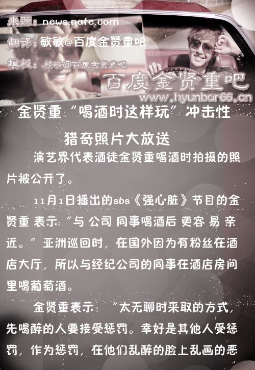 酒醉被整的是公司的同事吧, 我看有幾家報紙都報導金賢重醉後被整 ,有的還出照片 ,一看就知道不是金賢重. 現在是天下新聞一大抄, 抄到後來就 變味了.