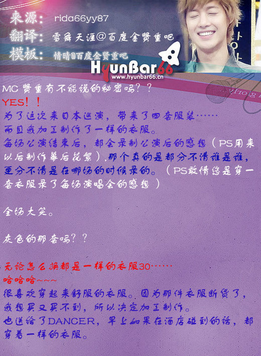 賢重唱抒情歌還是要再放感情和注意細微...老大講話的聲音很好聽但唱歌時音質顯得不夠厚重,他是目前我覺得唱歌和講話兩者有不同的韓國歌手,不知道原因是什麼??也有可能是我的要求太嚴格~因為我聽過Davichi,2AM,李賢,SJ-K.R.Y現場唱歌過,所以...sorry^^;;;因為老大說三十歲以後要改當抒情歌手~那要再下苦功,抒情歌手競爭很激烈