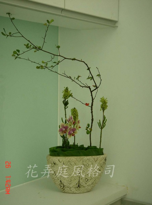 插花造型的成型要素,表現點、線、面、塊、體。造型是一種形色的有機安排,單以基本要素成型過於單調,可透過造型的對稱、變化、比例、漸層、節奏、反復、對比、完整、強調、調和、統一、平衡十二種原理加以組合,並注意色彩的機能運用與造型要素應用。