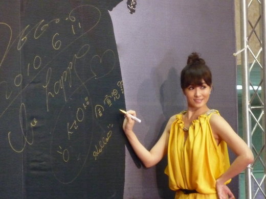 得知台灣的粉絲近8 成是女性,金宣兒有些驚訝。記者會主持人周子元安慰她說,好在今天台下有許多攝影大哥。金宣兒立刻做勢要拉起裙襬說:「早知應穿短一點」,又逗得全場哈哈大笑。為自己的大型看板簽名時,她也促狹地說:「因為知道要轉身簽名,所以穿了背後有文章的衣服」。讓大家見識到她的調皮。