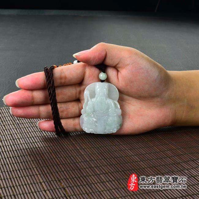 662B06F2810F98C4- 這一款吊墜是翡翠分級裡面,屬於「糯種」的種地。內裡棉質化晶體密布,玉墜質地和隨渾厚。色底白綠交織,淡綠色澤,顏色明亮清新,細膩純淨,淡綠與白皙交織,營造出淡雅的氣氛,白皙色澤猶如晨間暖陽,明快人心,綠草如茵,鮮活有力,飛揚跳脫,激勵人心。玉墜放置燈光下其結構細膩,微透光,表面呈油脂光澤,整只玉墜所雕刻的孚佑帝君,其輪廓飽滿立體。綠色翡翠在歷史上代表財富,是最純正的帶有安定力量的翡翠品種。