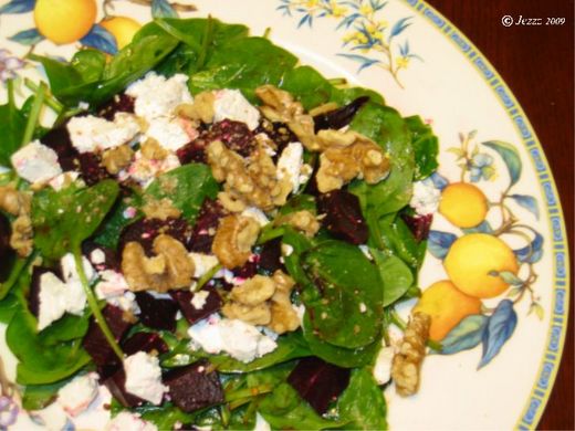 先放拌過的菠菜葉,起士丁,甜菜根丁,最後放上烤過的核桃仁,撒上少許現磨黑胡椒。起士已有鹹味,所以不用放塩。