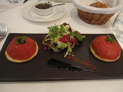 這家謝忠道大力推薦的餐廳,離羅浮宮不遠,附近是辦公區,很難訂位,試了三次才訂到位子。吃完很失望,大概只適合喜歡俗又大碗,胃口很大的人,牛排大塊的嚇人,甜點是一般的兩倍。和別的餐廳比起來,菜是粗糙了點,服務也很粗糙。