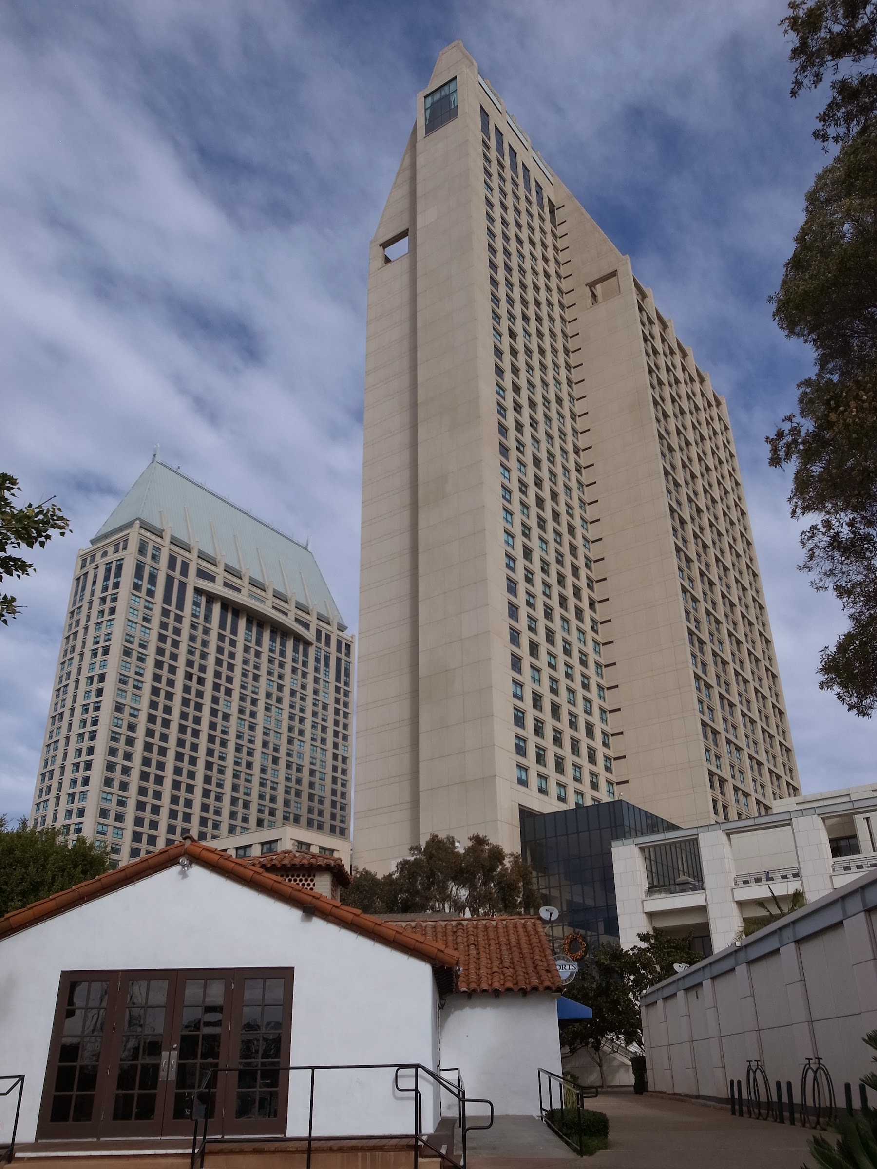 這家就在聖地牙哥海灣裡,和Coronado半島遙遙相對。旅館真的是超級大,大到房間散布在兩座白色巨塔裡。塔高的好處是房間的景色也好,海灣美景一覽無遺。它的位置就在城區裡,進出也方便。不過我對這家最有微詞的是它們電梯的數量實在是跟不上旅館的尺寸。進進出出沒有一次不用排隊等電梯的。這個在退宿的時候讓我和櫃檯狠狠的抱怨了一下,旅館很心虛的回信答覆說是因為有一台電梯故障的原因,承諾下次入宿時免費昇等。這個免費昇等應該是用不上了,不過那個電梯故障的藉口連我都看得出來很牽強。它們最大的問題是電梯的速度太慢了。人家拉斯維加斯的高樓層大旅館那家沒裝最先進的快速電梯,「貨流」才動得快嘛!