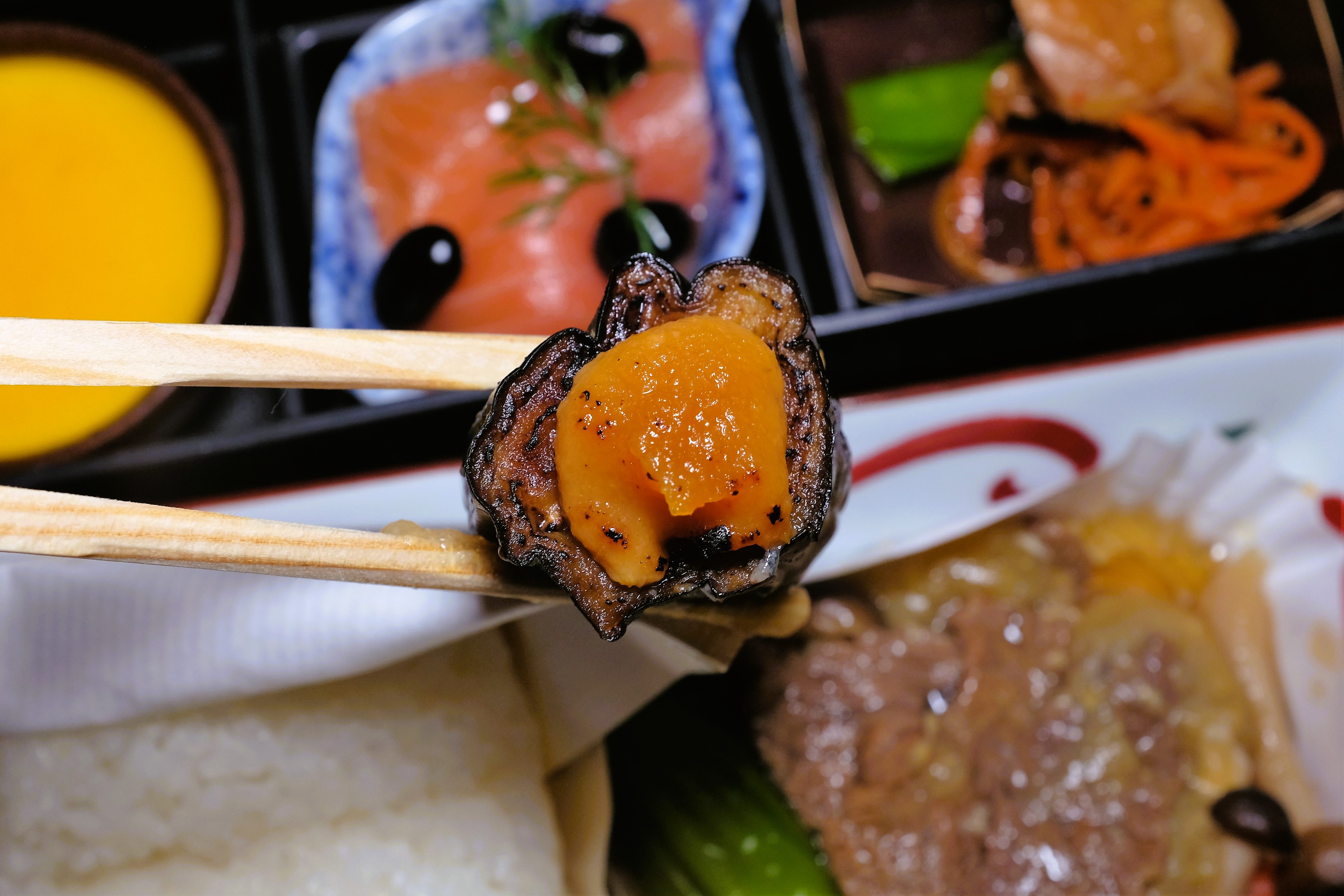 我吃的日式套餐。前菜裡有烤鮭魚,炸甘貝,金目鯛,鮑魚,雪蟹,和鴨肉丸子。