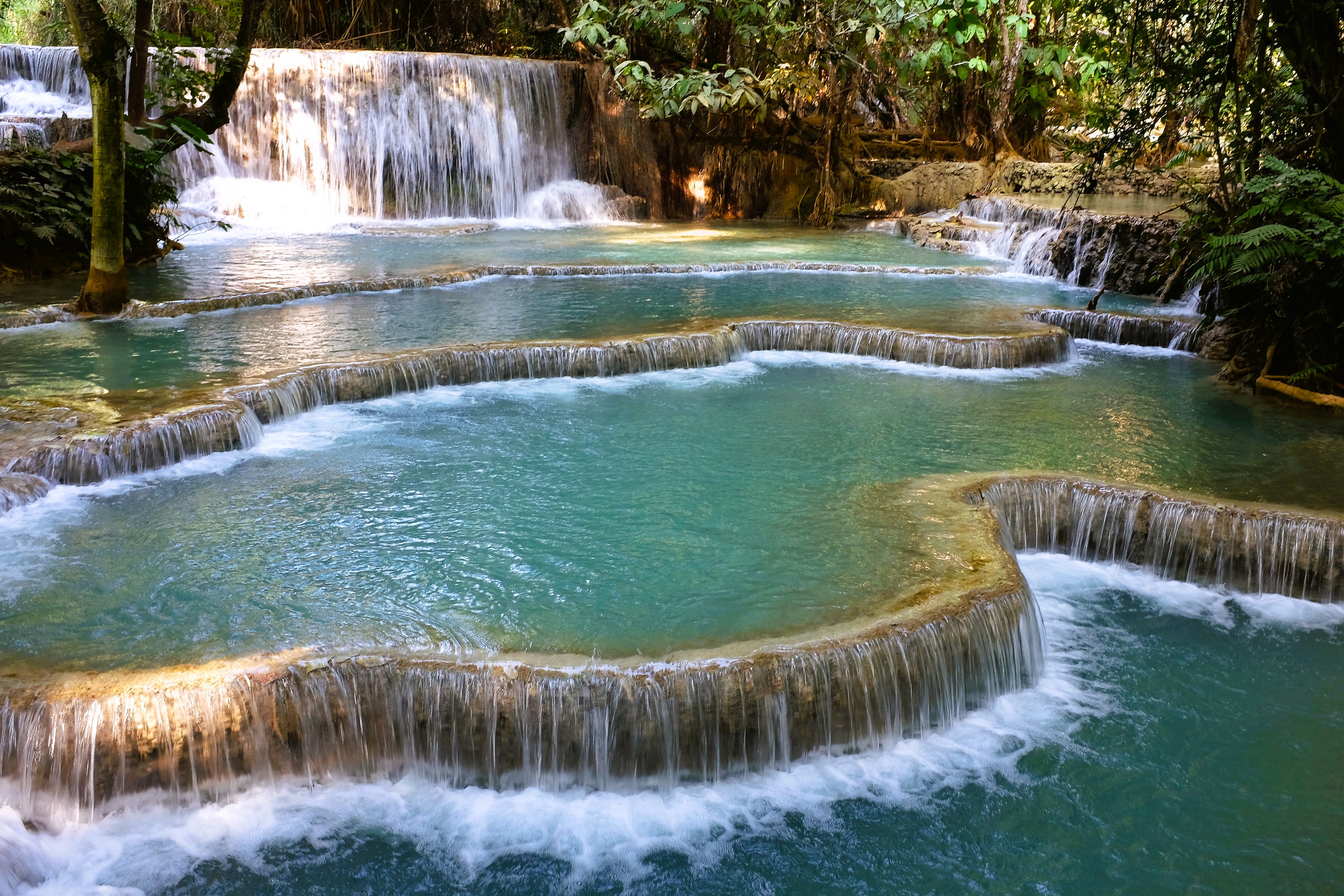 《關西瀑布》(《光西瀑布》)Kuang Si Waterfall是寮國最出名的瀑布之一,也是寮國最美的瀑布之一。這座瀑布有點像中國的九寨溝或是麗江玉龍雪山一帶的瀑布一樣帶著礦物質的水有著奶白色的孔雀藍,再加上多層次的石灰岩地形,讓它形成了一個如夢似幻的仙境。《關西瀑布》離《龍坡邦》Luang Prabang只有29公里左右,所以也是大家來《龍坡邦》必會加入行程的一個景點。一般人從《龍坡邦》來《關西瀑布》可以選擇租摩托車,雇用嘟嘟車Tuk-Tuk,雇用轎車,或是參加當地的旅行團。《關西瀑布》是個熱門景點,大多數的旅行團都會帶到這裡來,如果想來這裡的話建議早上早點來以避開人潮。這座瀑布沿途有數座池子允許訪客下水游泳。你如果打算在這裡游泳的話也要記得準備泳衣泳褲和毛巾一類的東西。