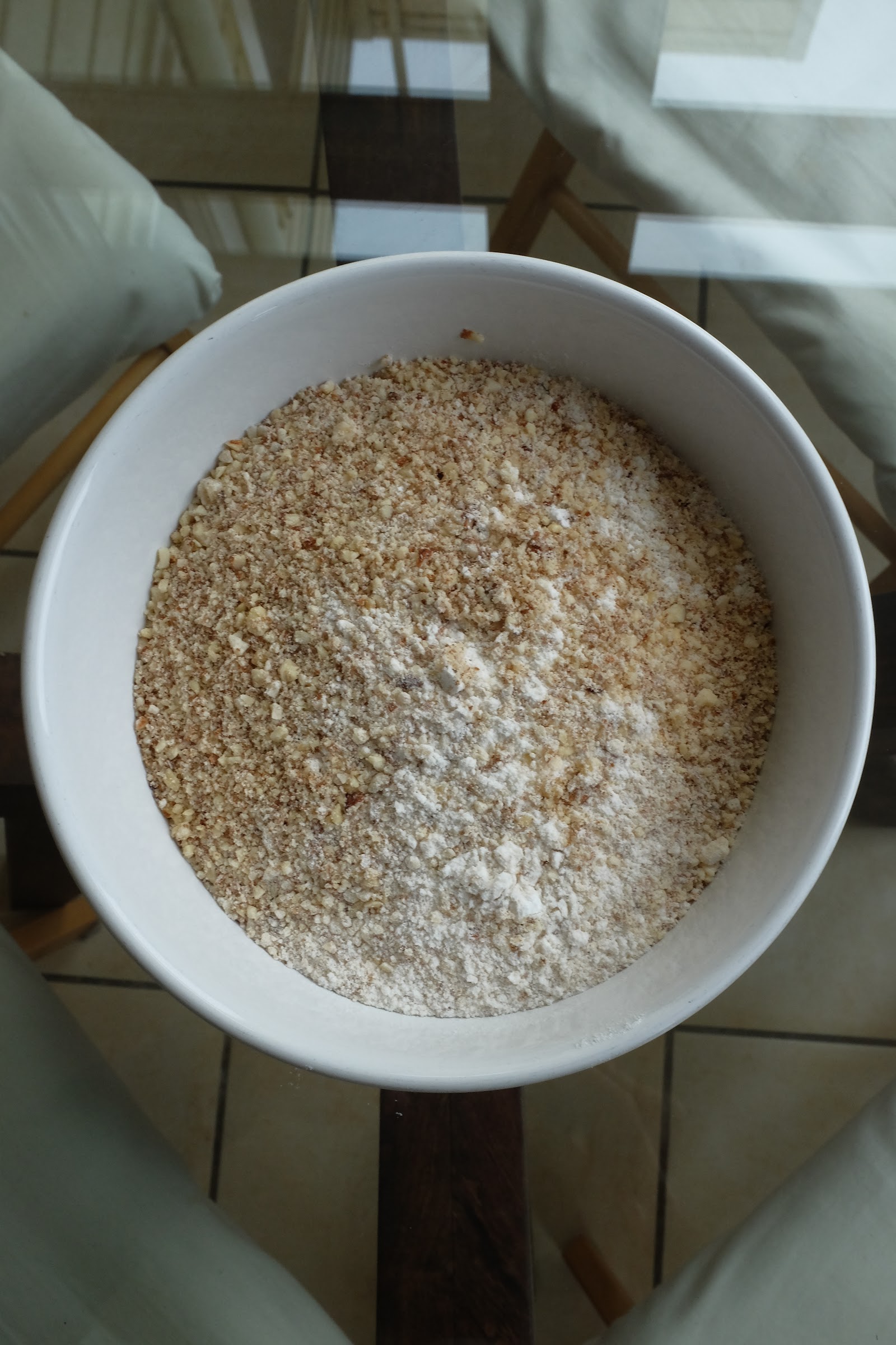 杏仁用料理機或是果汁機打成粉末。麵粉,baking powder,和鹽混勻之後加進去,拌勻。