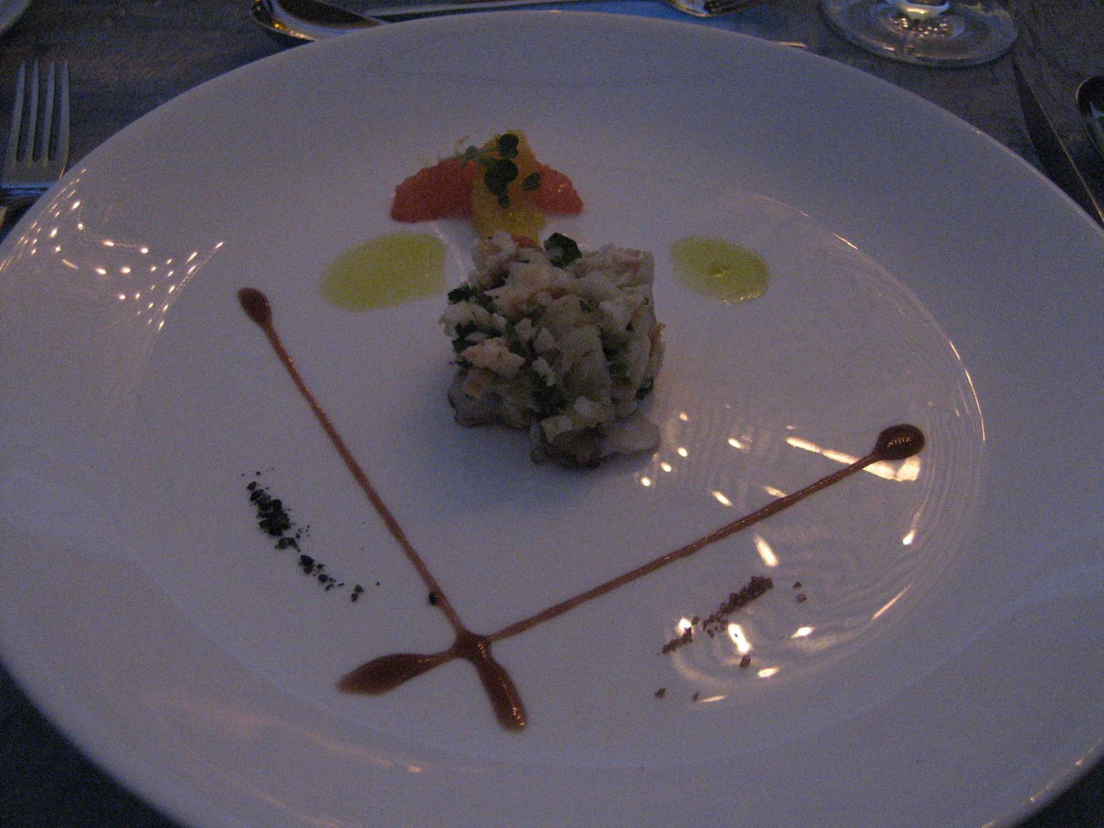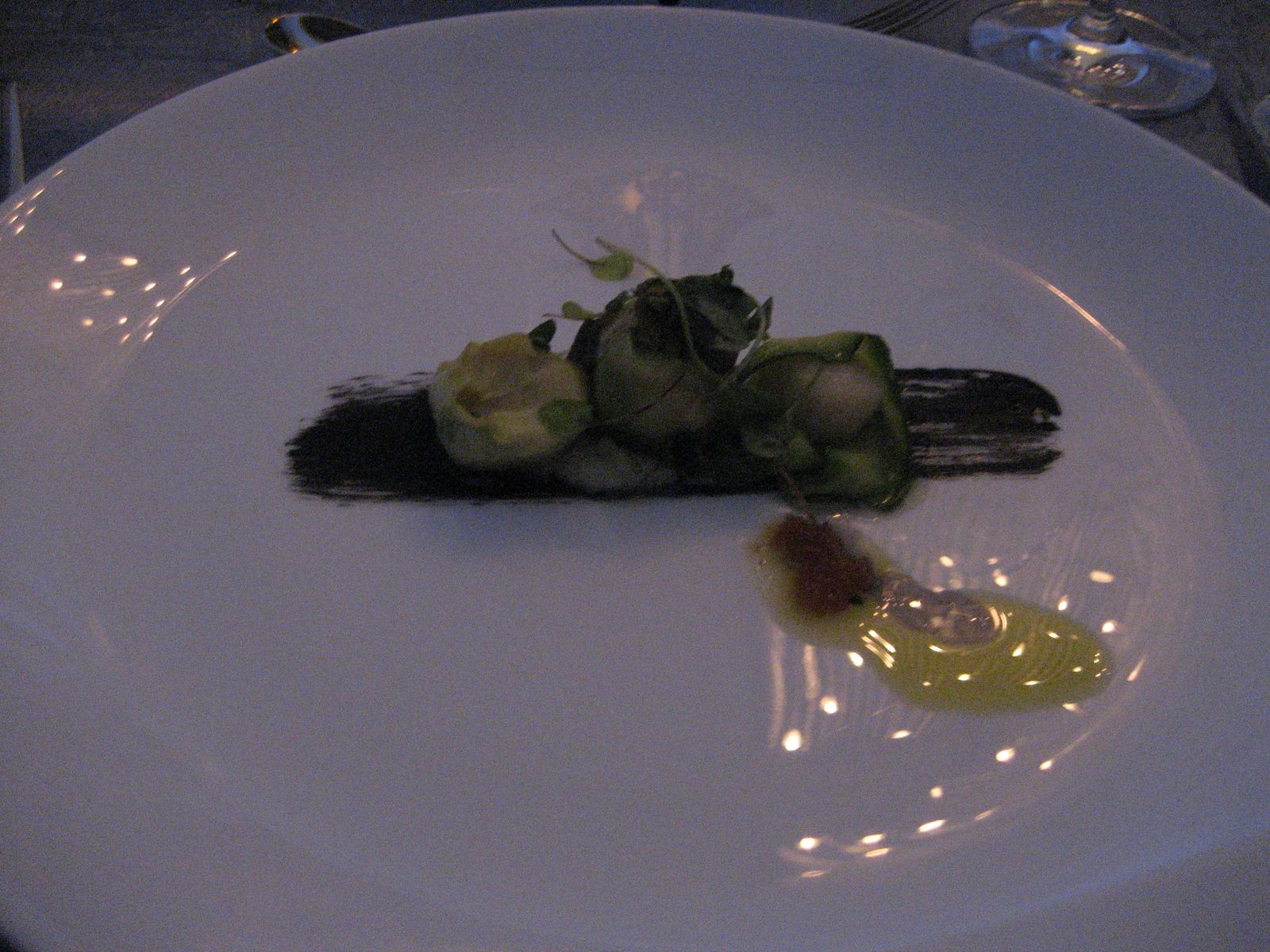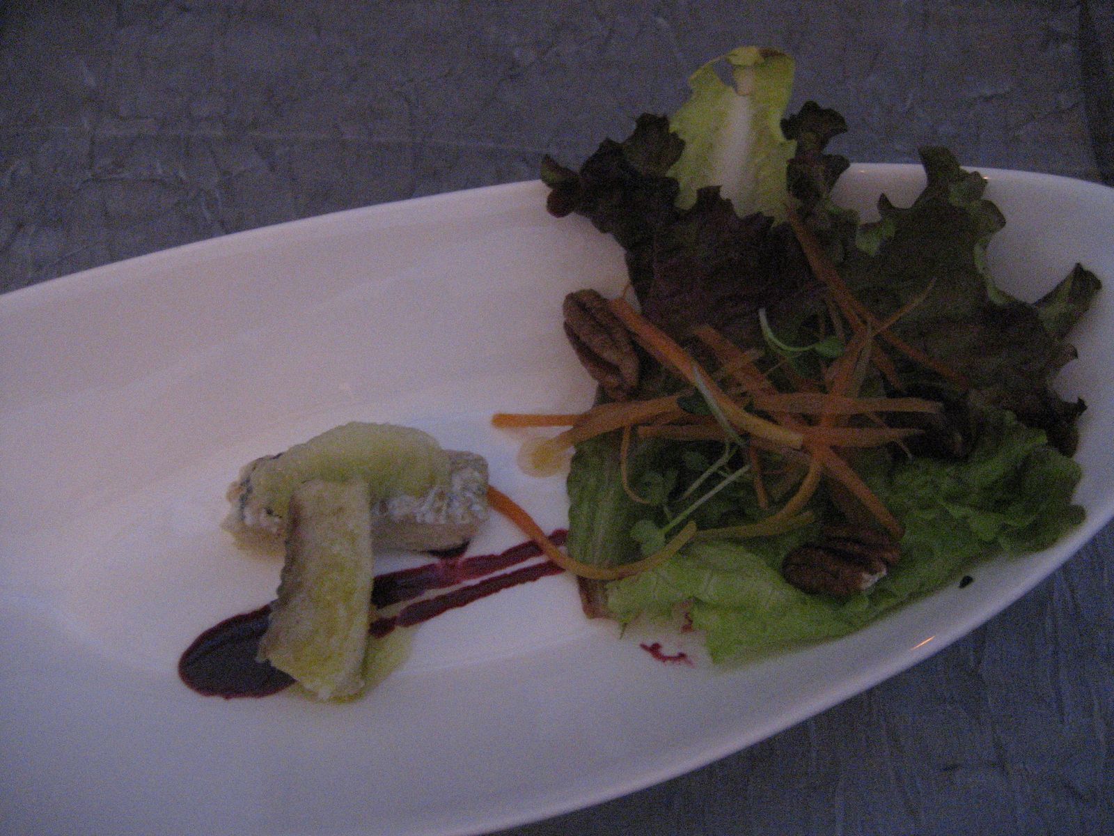 餐廳自己送來的前菜。炸海鮮球。旁邊那些絲狀物經過敢死隊的試吃結果,回報是玫瑰花瓣切的。