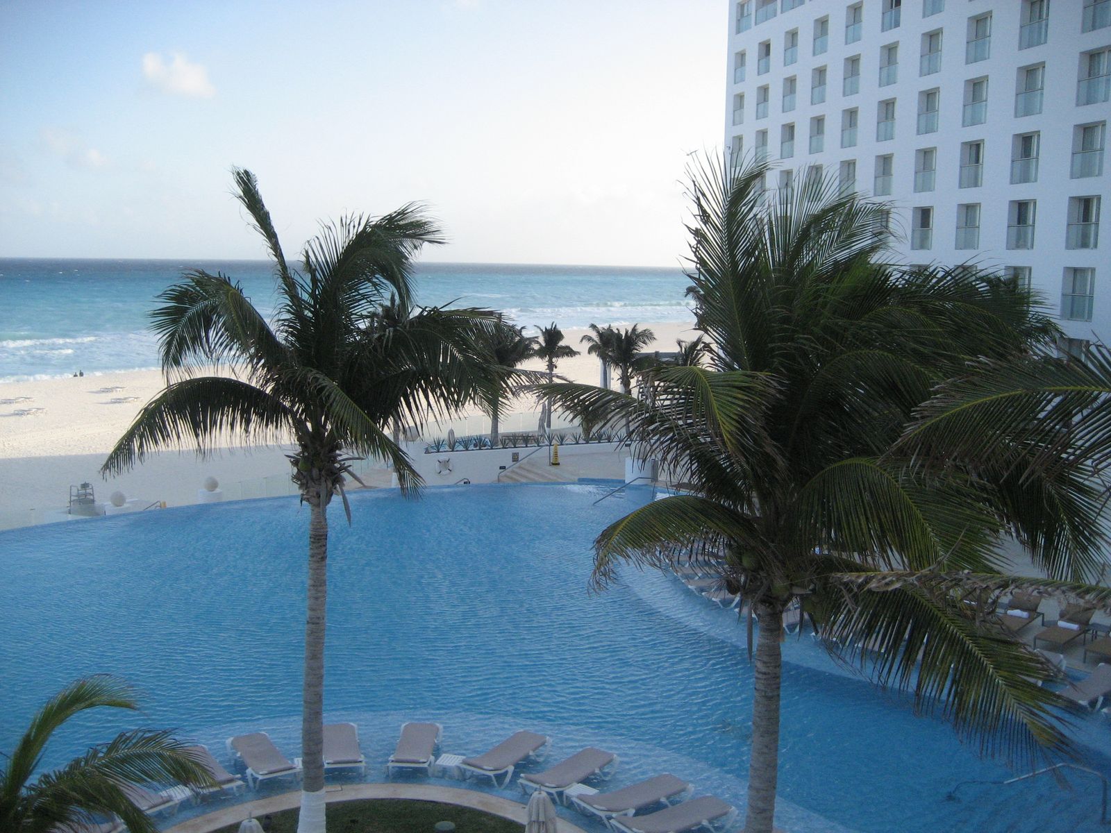 這次來住的渡假村Le Blanc總共有三個戶外游泳池。分別位在不同樓層。墨西哥在Cancún的這一條狹長的礁石海岸雙面都是海,所以這裡的游泳池也都有無敵海景可以看。這三個游泳池中兩個面向外海,一個面向珊瑚礁內海。各有各的特色。