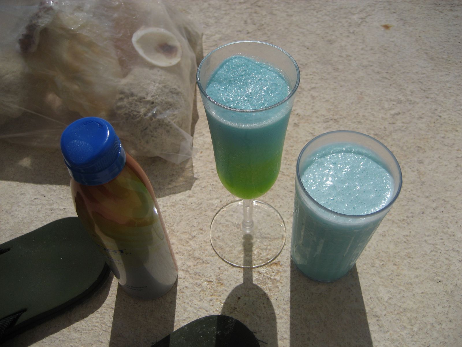 Honeymooner和Blue Hawaiian。高脚杯裡的是Honeymooner,水杯裡的是Blue Hawaiian。也没人在渡蜜月,一樣照喝。