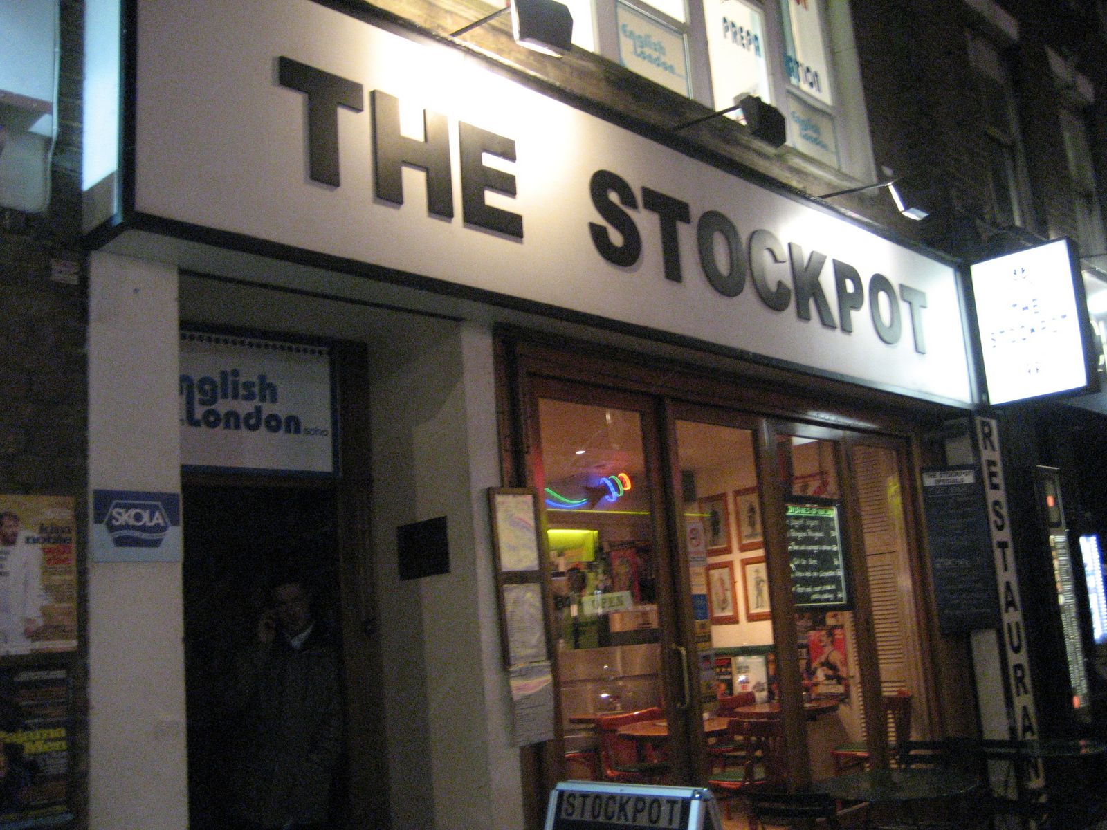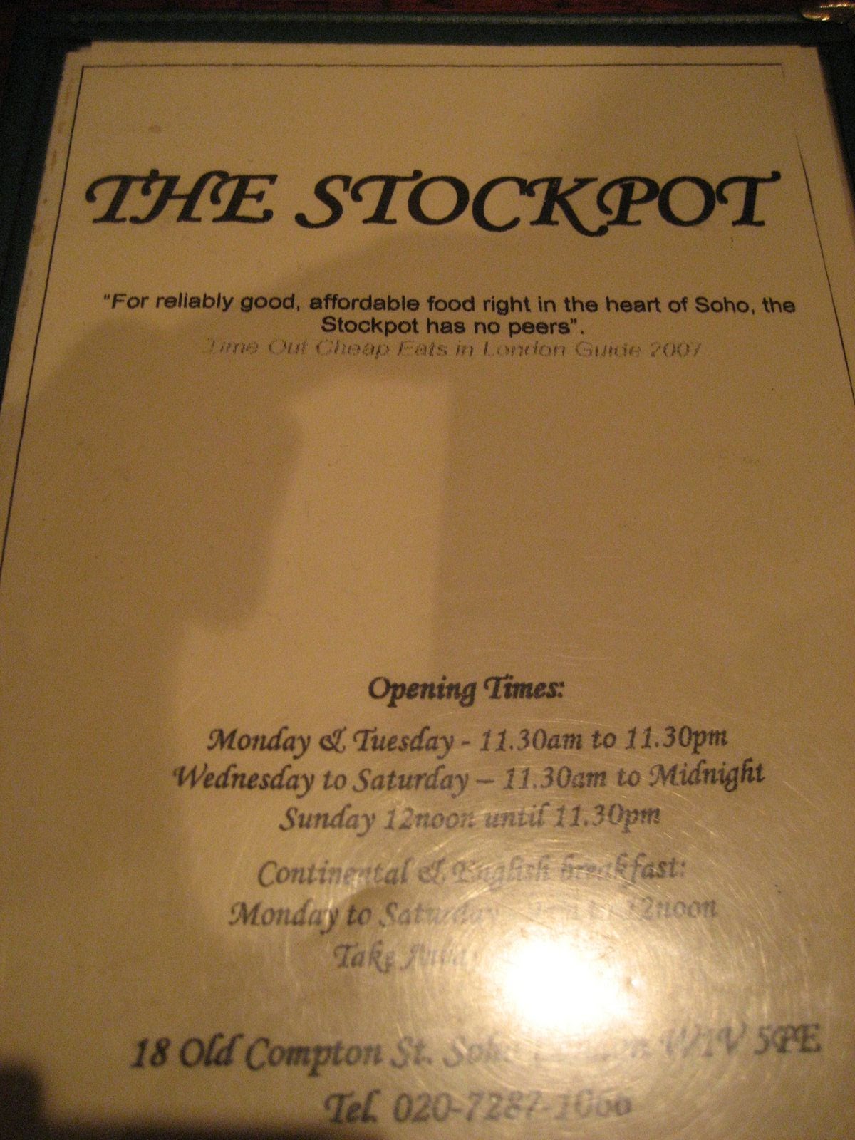 在倫敦除了吃fish&chips之外,其實吃道地英國菜的機會並不是太多。主要的原因之一是倫敦的移民很多。各式各樣的外來菜像印度菜,中東菜,中國菜的餐館很多。這些外來菜都比英國菜好吃得太多,也便宜得多,所以很少有人想到要吃英國菜。可是如果真的想吃英國菜換換口味的話,這一家The Stockpot是一個很好的選擇。這一家很出名。菜單上没有什麼高貴精致的菜,就是一般英國百姓人家吃的庶民菜色。他們的菜賣得很便宜,是很多人想吃英國家常菜,又不想太傷荷包之下的首選。它的附近有很多百老匯的戲院,所以常常要小排一下才有座位。