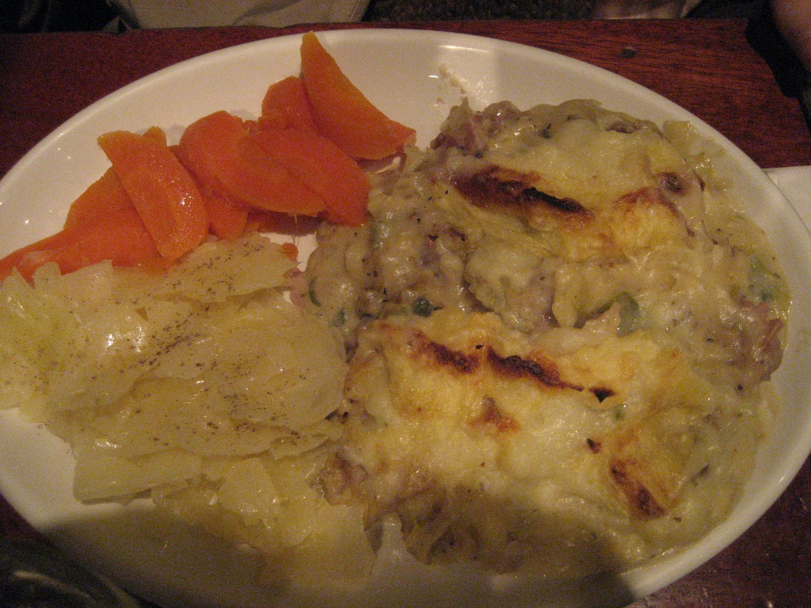青蒜羊肉派。英國很多這種鹹派都是這樣一坨,没有派皮的。賣相不佳,可是還不難吃。