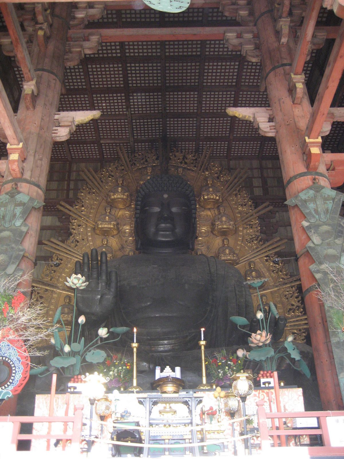 要提到奈良,東大寺大概是當地最出名的佛寺之一。東大寺出名是有原因的。他除了年代久遠之外,佛殿本身是目前世界上現存最大的木造古建築之一。殿內所供的盧舍那佛也是日本現存最大的金銅古佛,與大殿幾乎齊高。高到大殿上要開一小扇窗讓人可以從外面瞻仰佛顏。你可以想見那種一路從東大寺中門趿趿行到大佛殿,眼見大佛越來越大,一直到你在大佛跟前,仰著頭看佛顏的那種震撼。